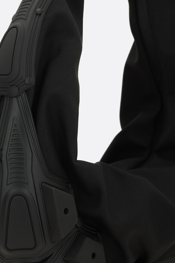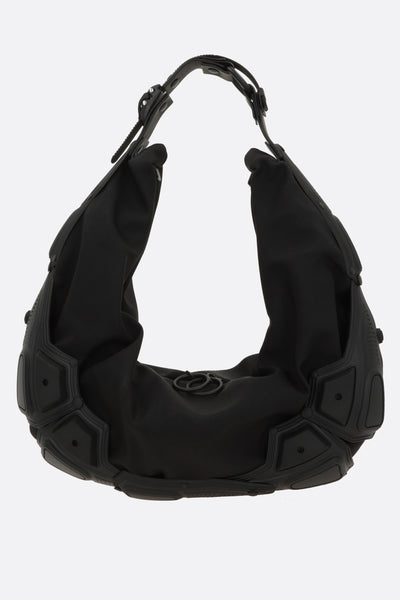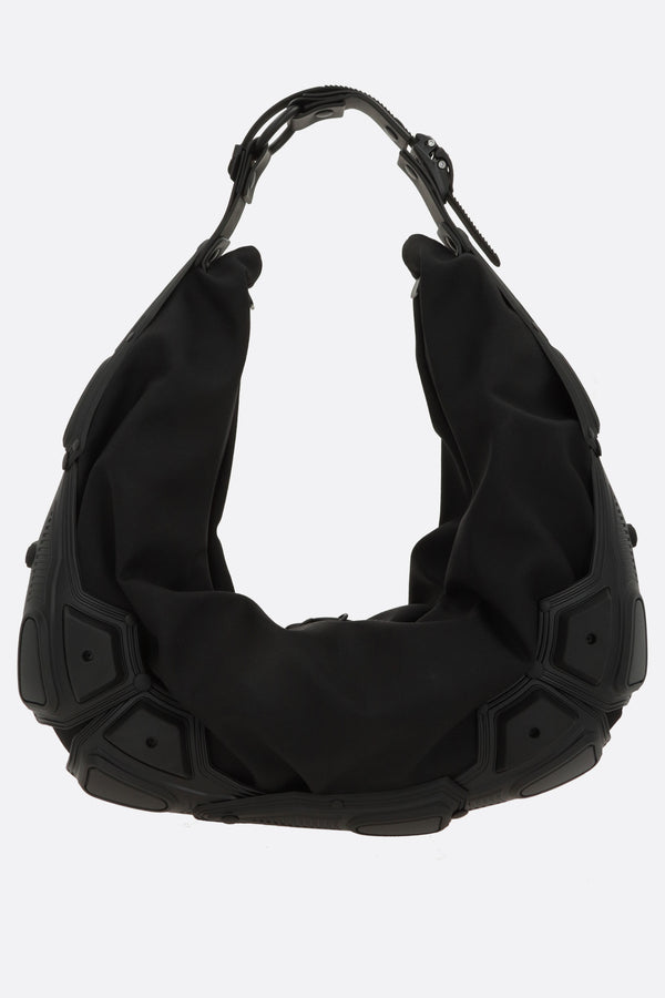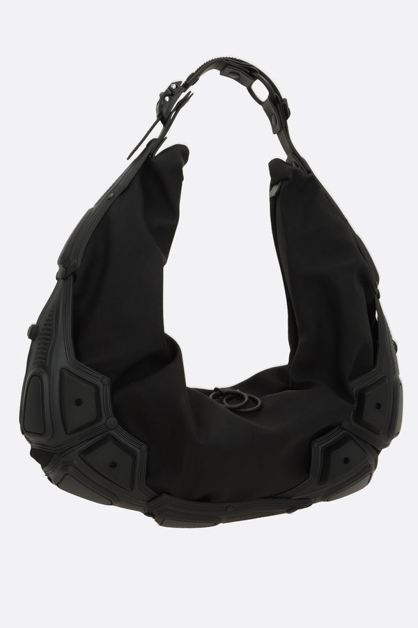 Shoulder bag by Innerraum crafted from black nylon and rubber. Features black hardware, double-slider zip closure, and an adjustable shoulder strap. The tone-on-tone fabric-lined interior includes a zip pocket.