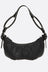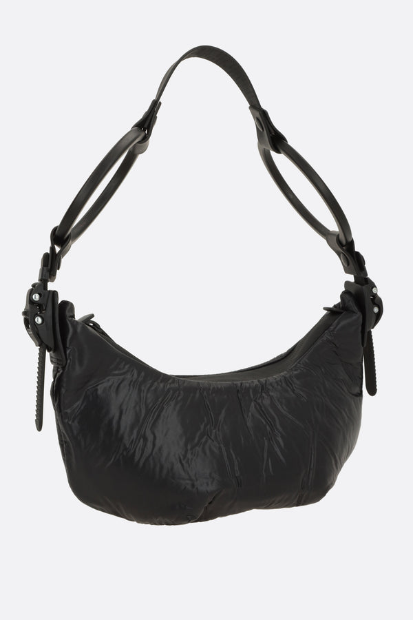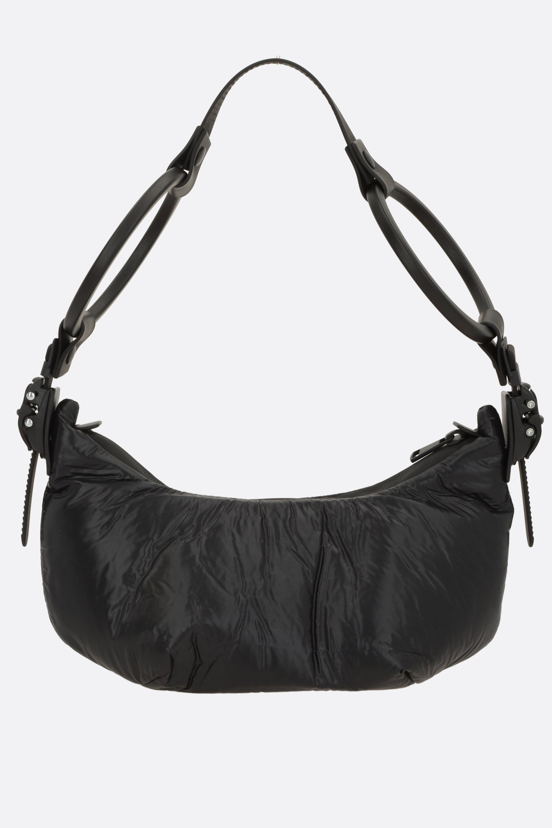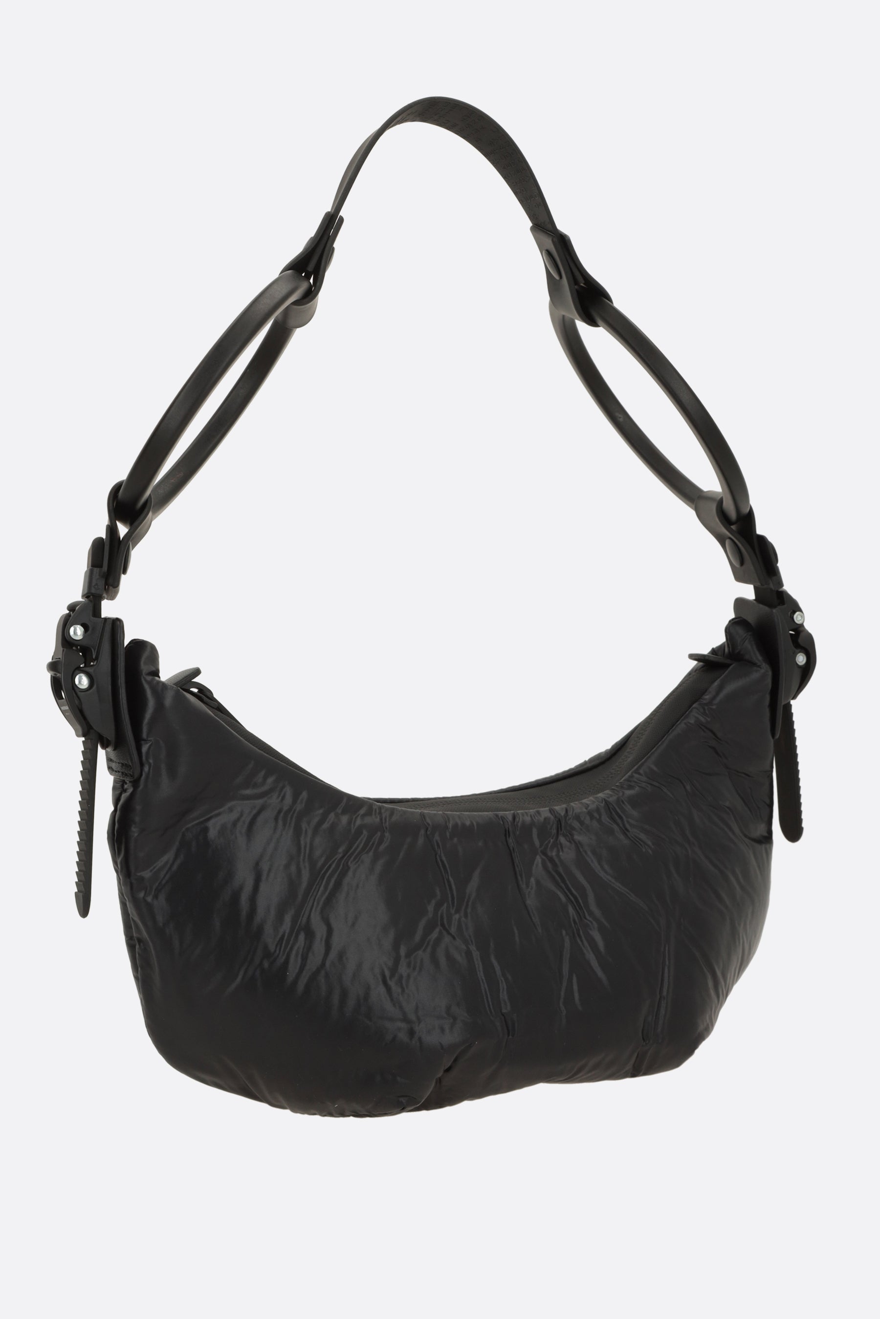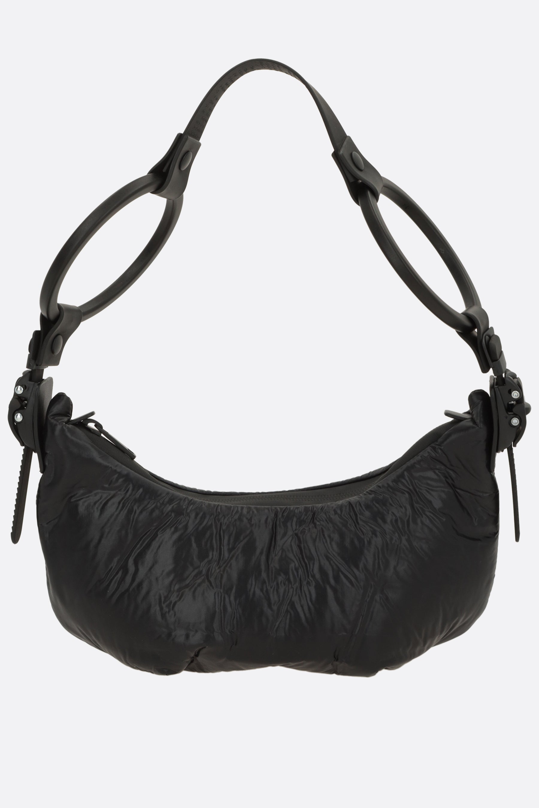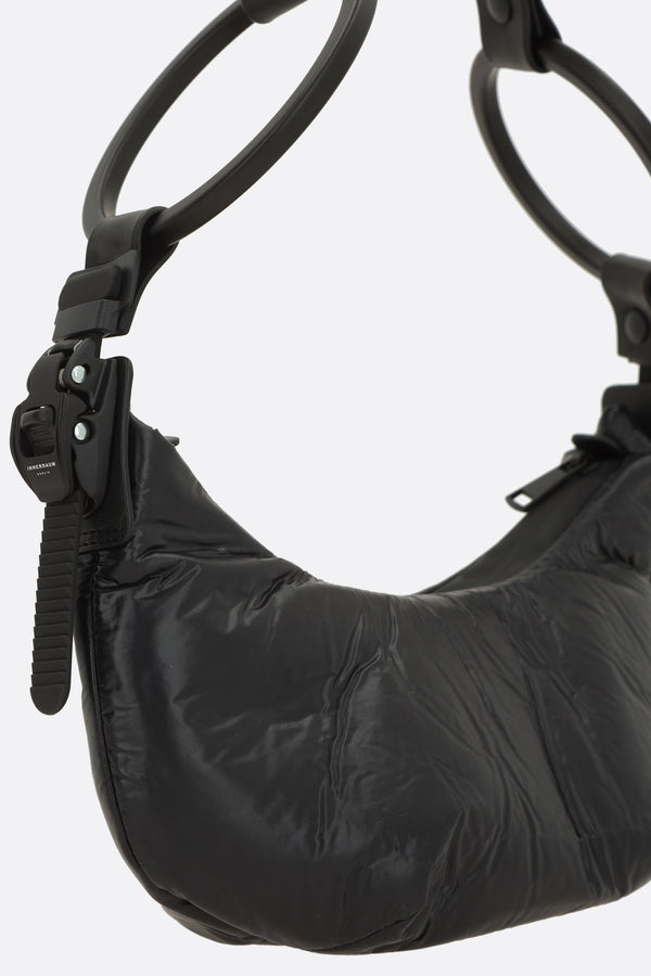Shoulder bag by Innerraum crafted from glossy black nylon. Features black hardware, zip closure, and an adjustable rubber shoulder strap with oversized metal rings. The interior is lined with tone-on-tone fabric.