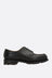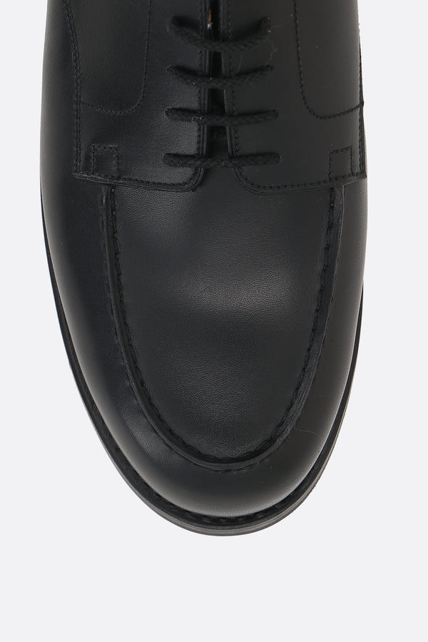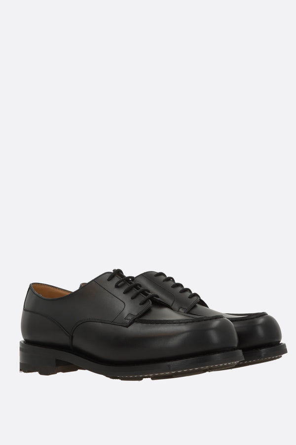 J.W. Weston derby shoes crafted from black Box leather. Featuring lace-up closure, rounded toe, leather lining, and rubber sole.