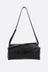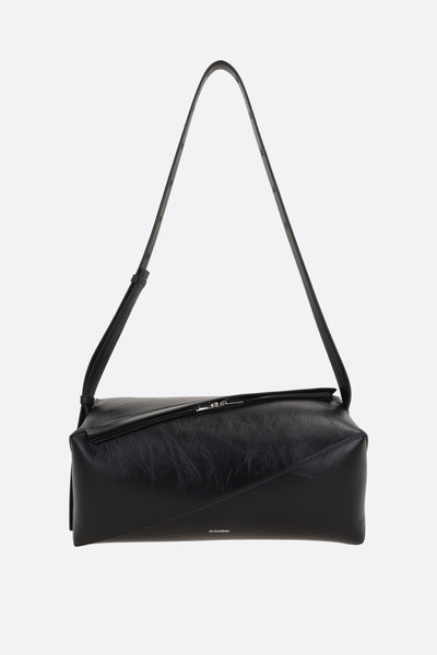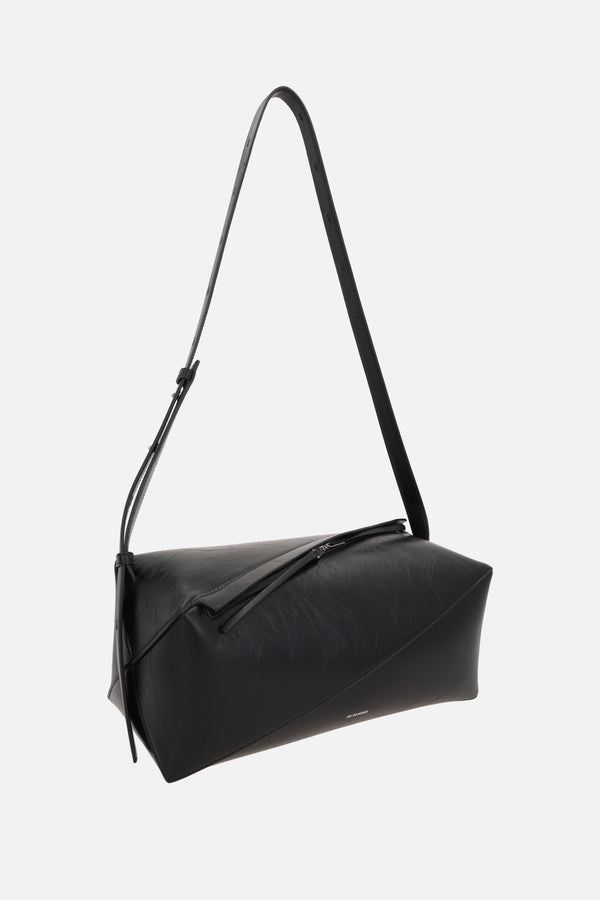 Jil Sander shoulder bag made of black V-Sport leather with embossed logo lettering on the front. Featuring silver-tone hardware, double-slider zip closure, and an adjustable shoulder strap. Interior lined in black nappa leather.