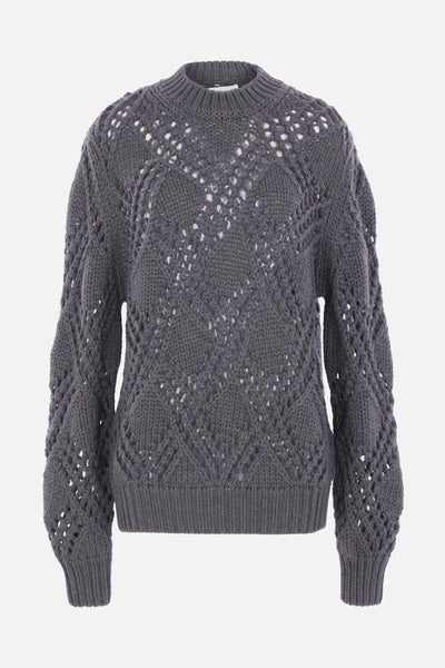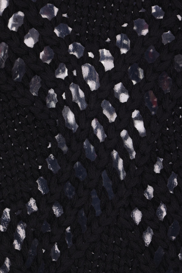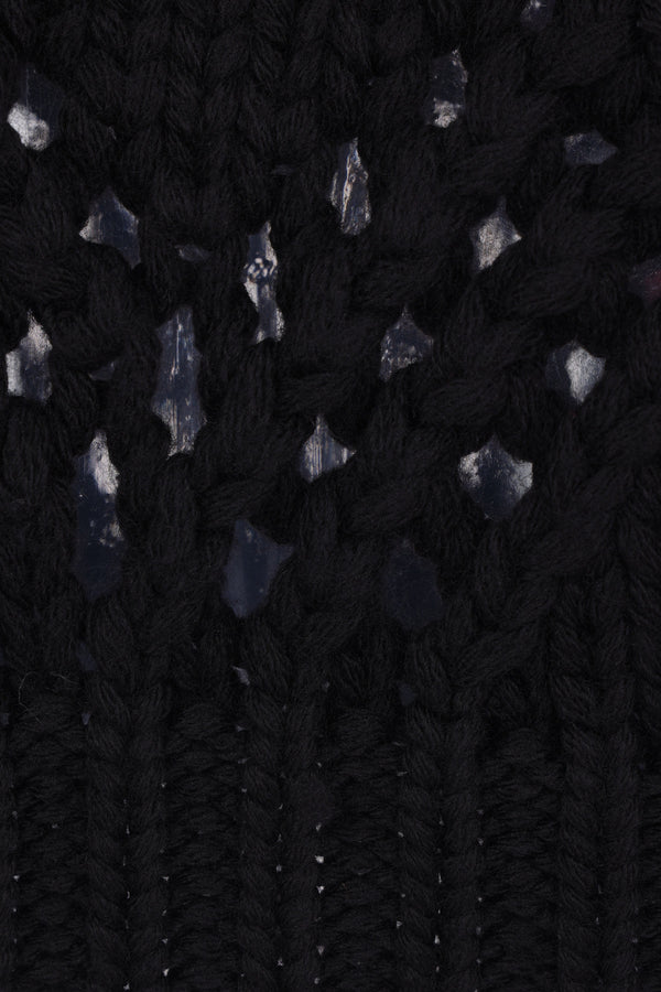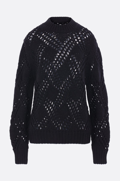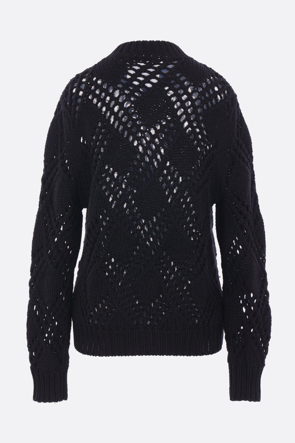 Jil Sander sweater made of black wool knit with an openwork pattern. Features a crew neckline, long sleeves, and ribbed trims.