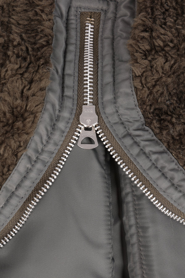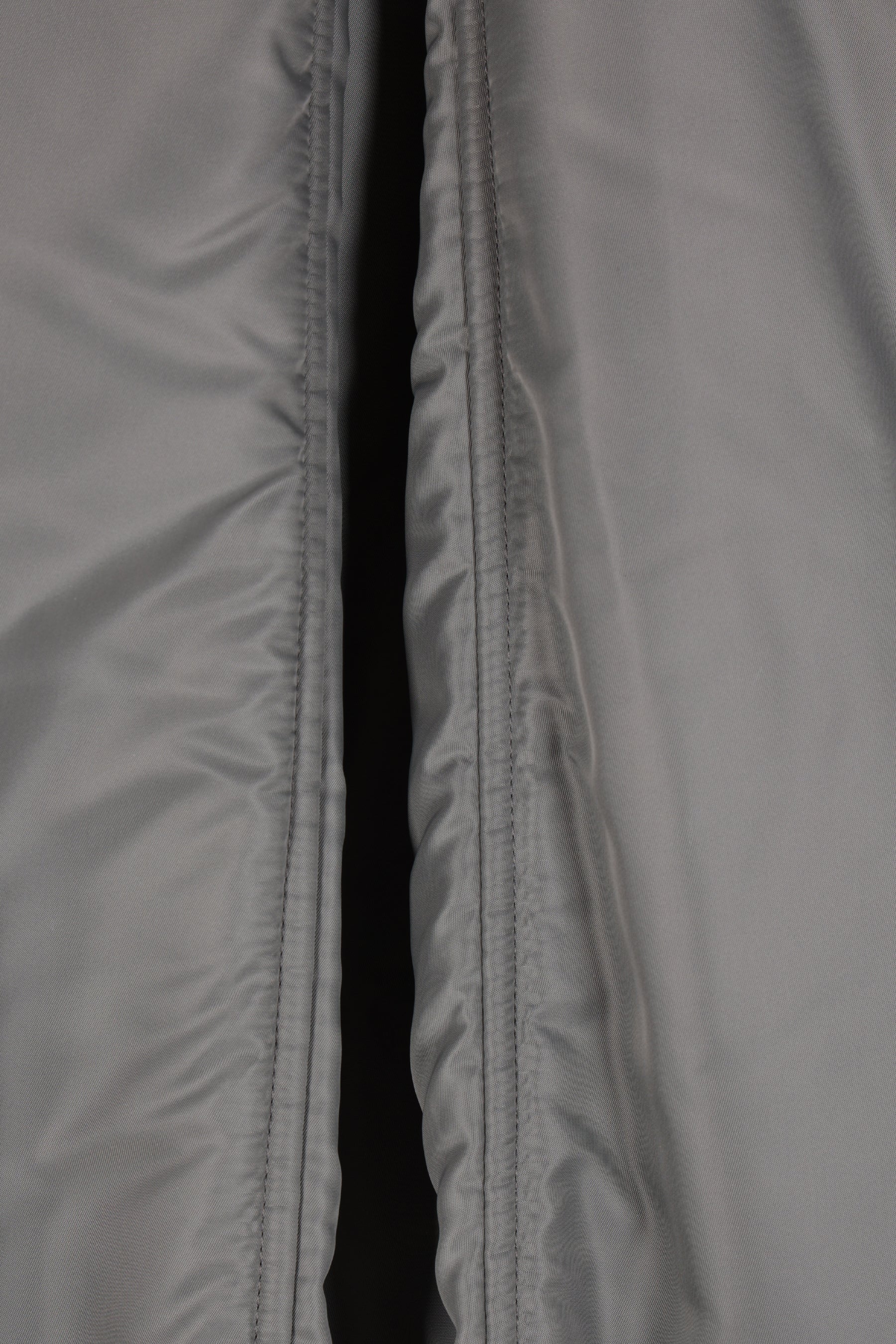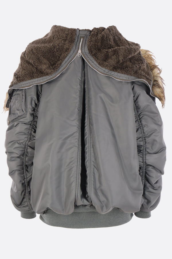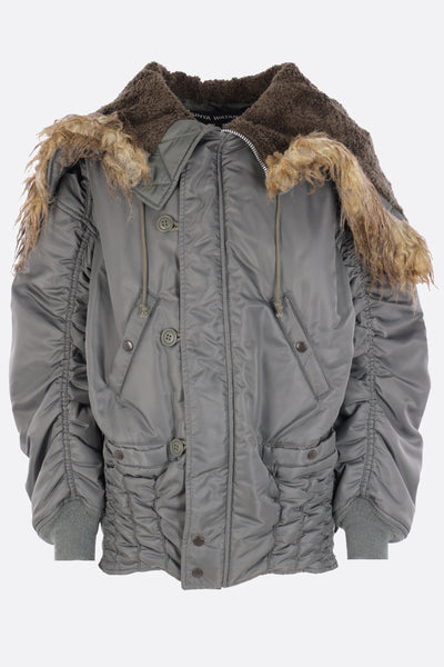 Junya Watanabe oversized padded bomber crafted from sage green nylon. Featuring a hood with fleece lining and faux fur trim, zip/button closure, multiple pockets, long sleeves, ribbed trims, and gathered detailing along the edges.