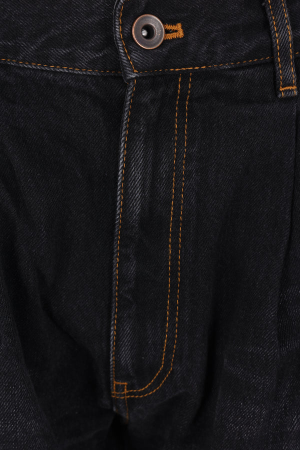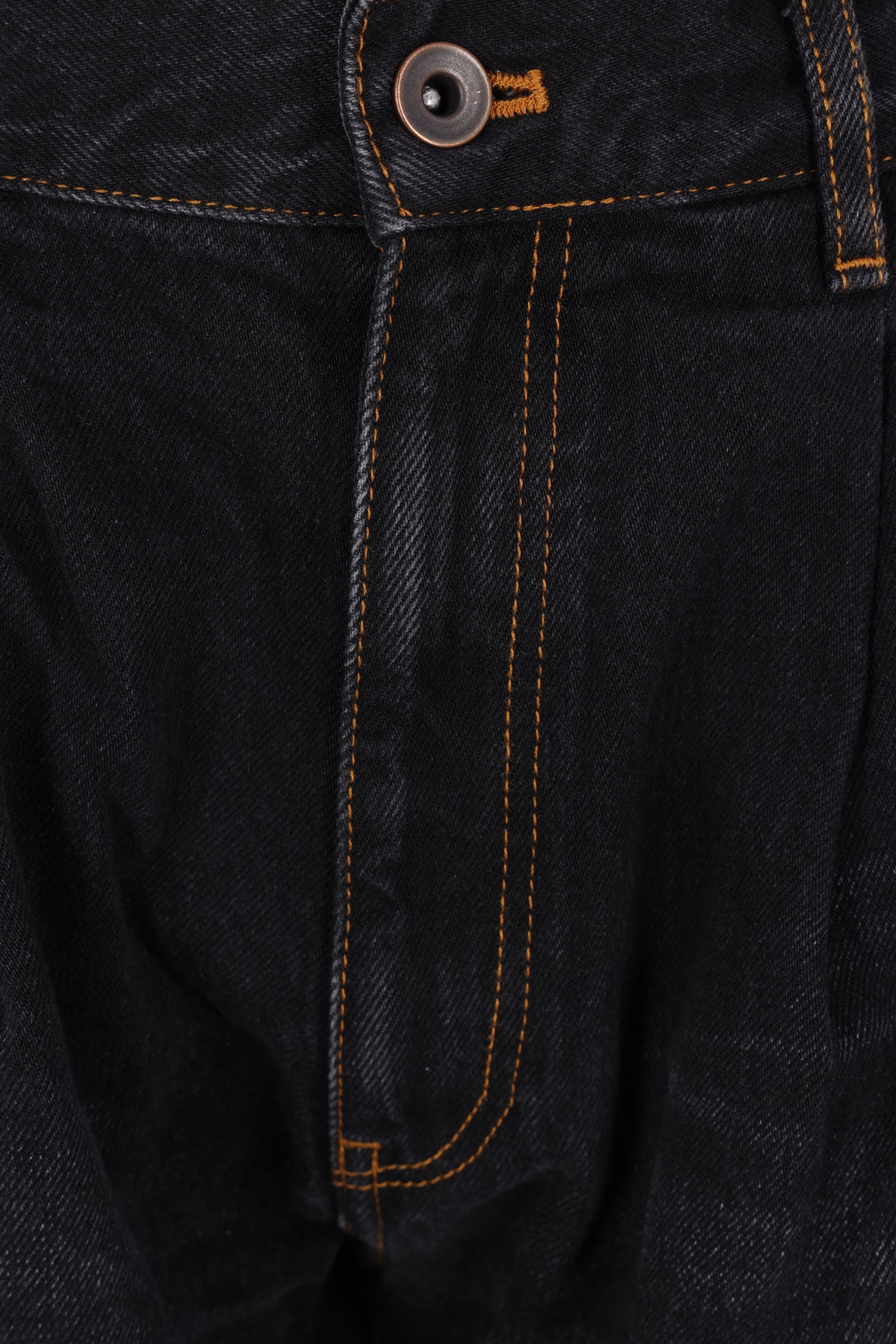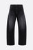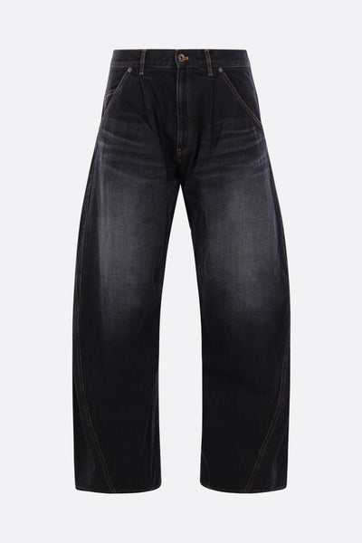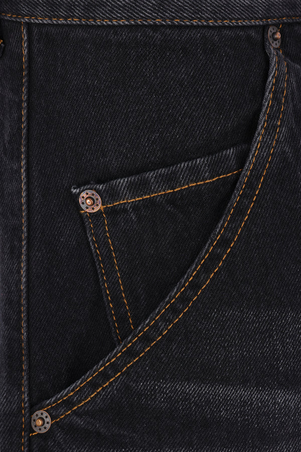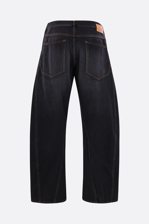 Khoki curved-leg jeans by made from faded black cotton denim. Features front button and zip closure, belt loops, multiple pockets, and curved side seams.