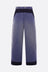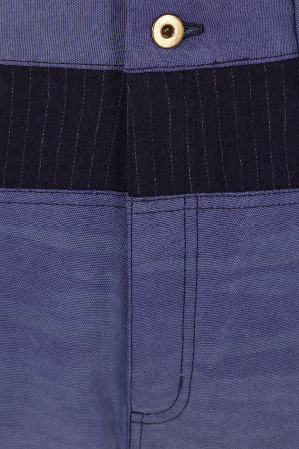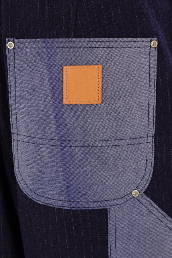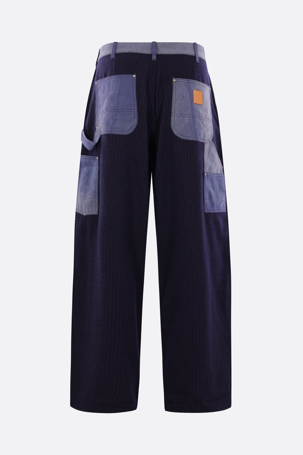 Khoki worker trousers made from vintage-effect canvas and blue pinstripe wool. Features front button and zip closure, belt loops, and multiple pockets. Each piece is unique; prints and washes may vary.