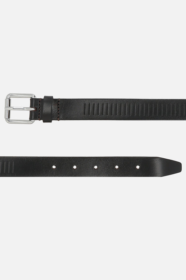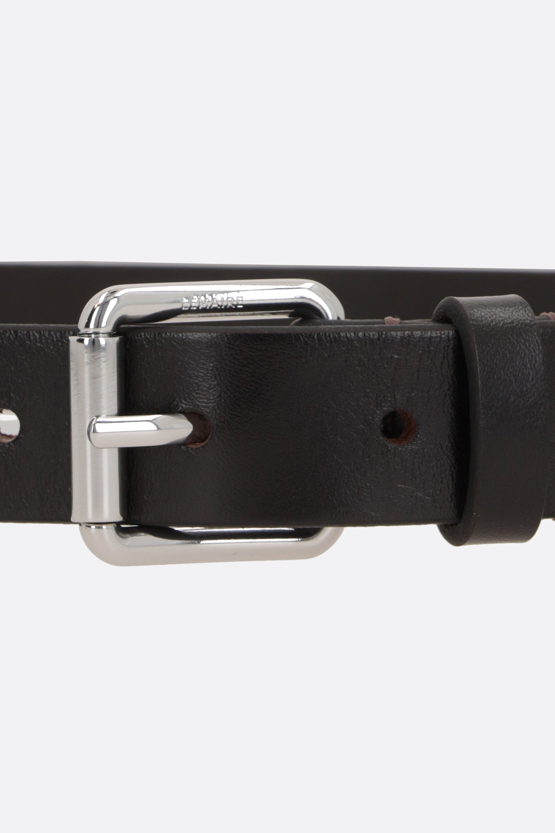 Lemaire belt crafted from dark brown smooth leather with embossed Rail pattern. Featuring an adjustable closure with silver-toned metal buckle.