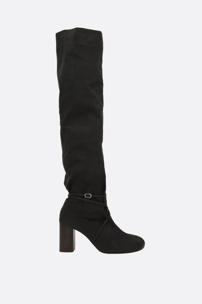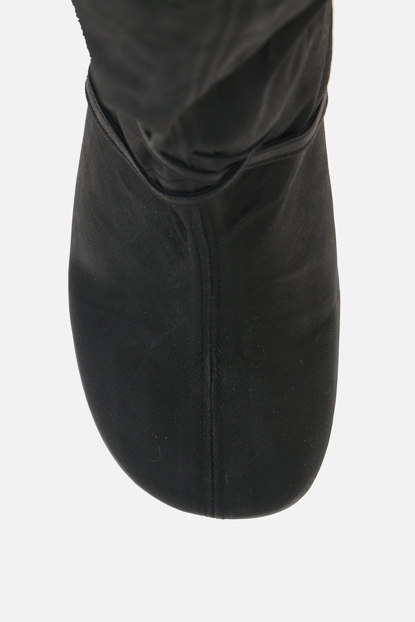 Boot by Lemaire made from coated canvas with tone-on-tone leather crossover straps at the ankle. Featuring a round toe, leather lining, and leather sole. The design is completed with a chunky wooden heel.