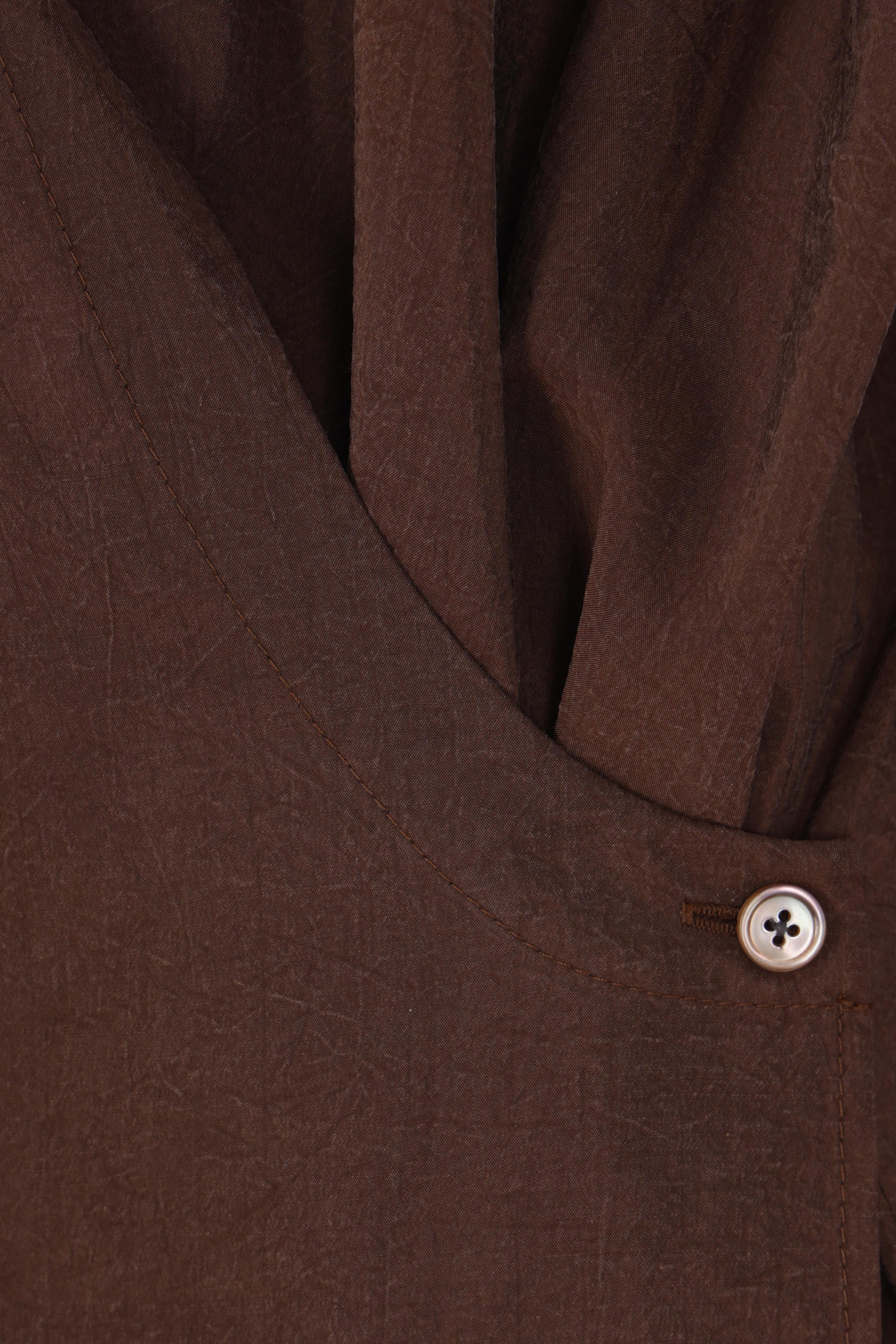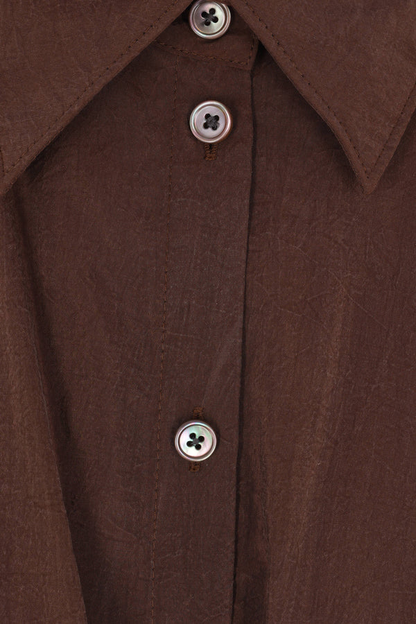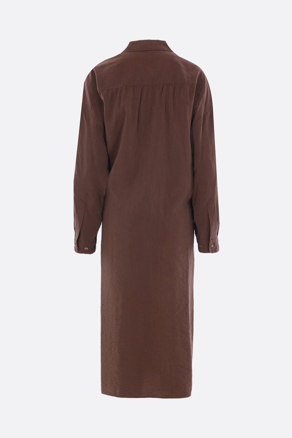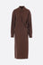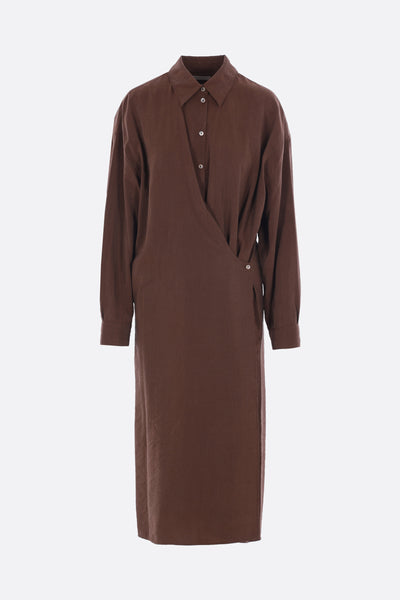 Lemaire shirt dress crafted from brown silk blend. Featuring a classic collar, front button closure, long sleeves with buttoned cuffs, and a wrap skirt with inner ties and an outer button. Unlined interior.