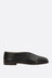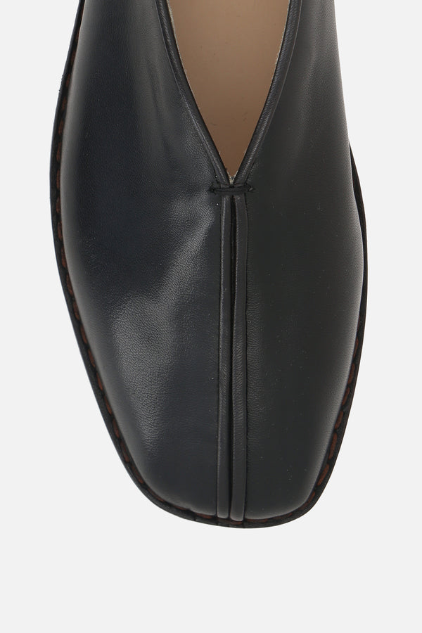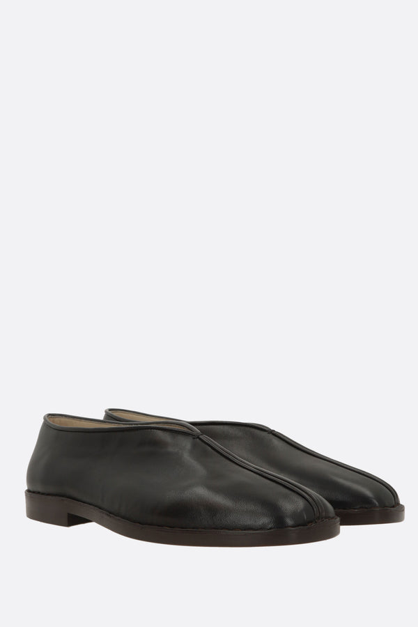 Lemaire slippers made of black nappa leather with front piping. They feature a slightly squared toe, leather lining, and a leather sole.
