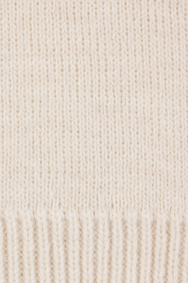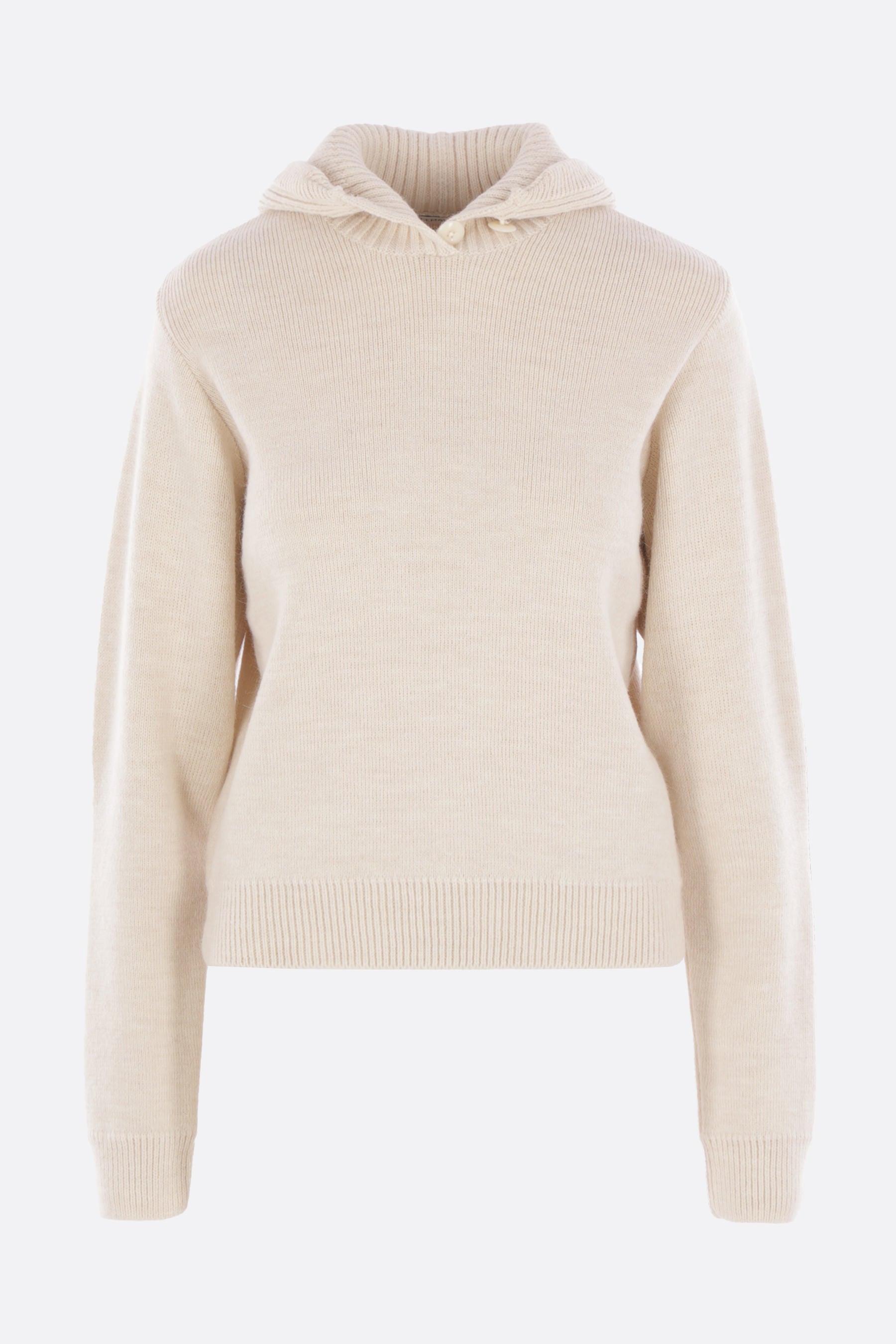 Lemaire sweater crafted from ivory alpaca and wool-blend knit. Featuring a hood with front buttons, long sleeves, and ribbed trims.