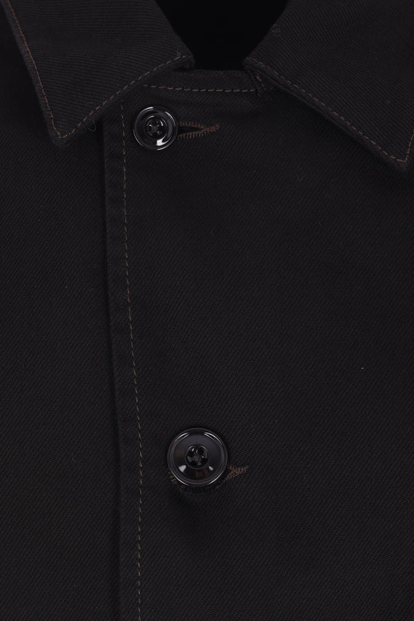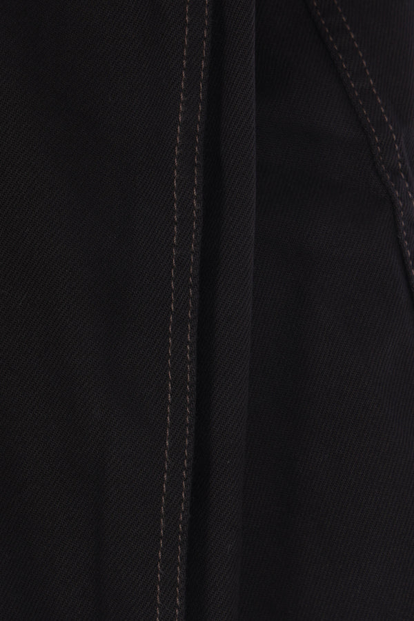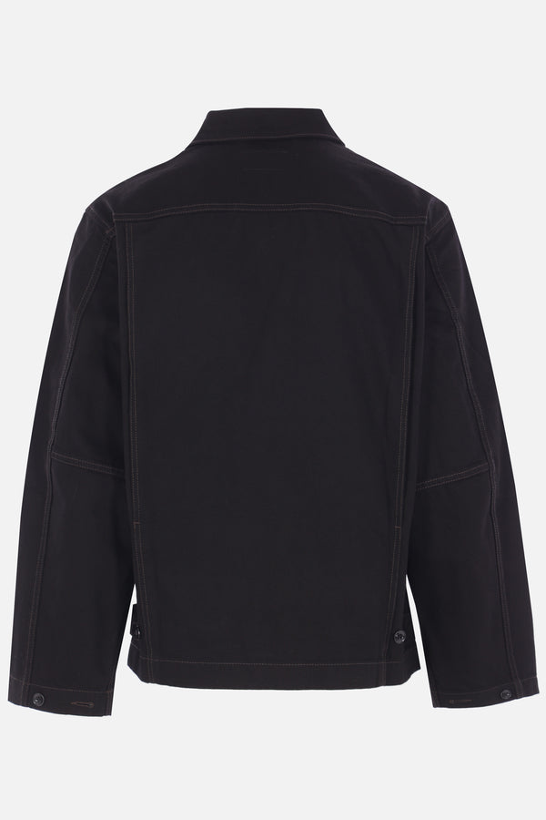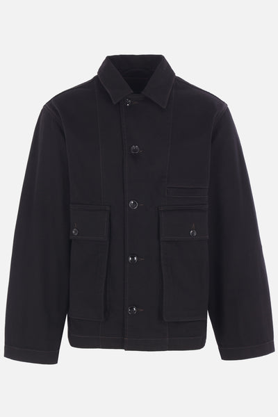 Lemaire boxy-fit jacket crafted from black cotton denim. Featuring a pointed collar, front button closure, multiple pockets, long sleeves with buttoned cuffs, and a straight hem with adjustable waist tabs.
