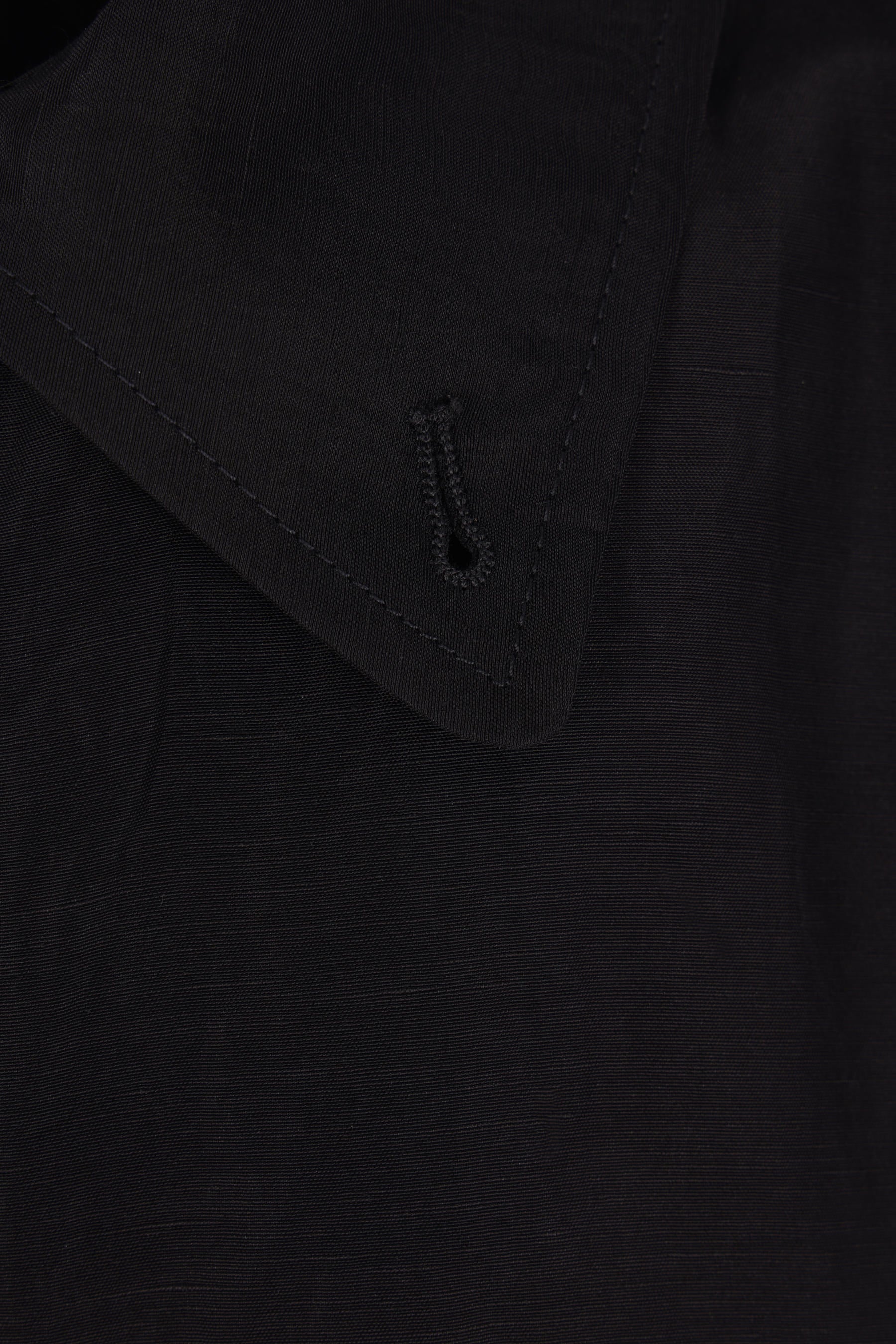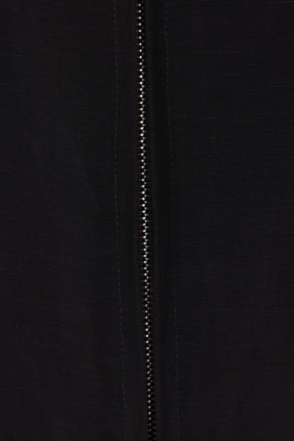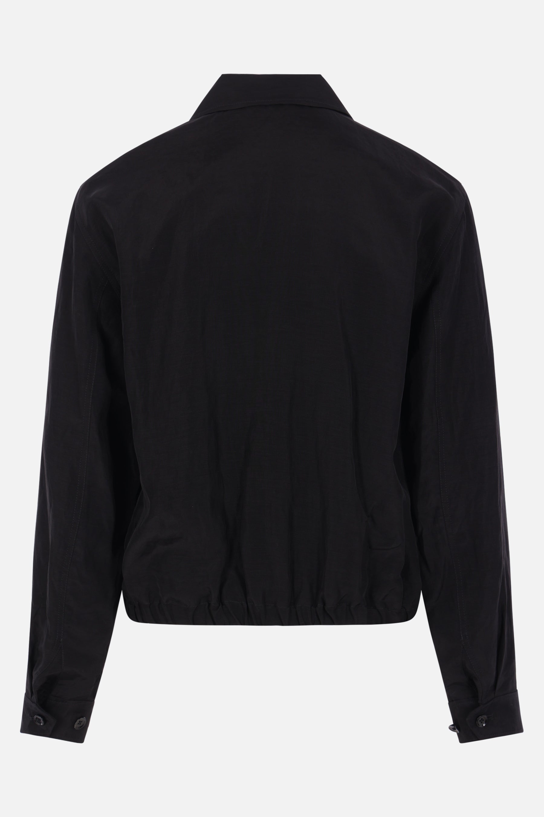 Lemaire blouson crafted from black linen and viscose. Featuring a pointed collar, front zip closure, welt pockets, long sleeves with buttoned cuffs, and elasticated hem. Fully lined interior.