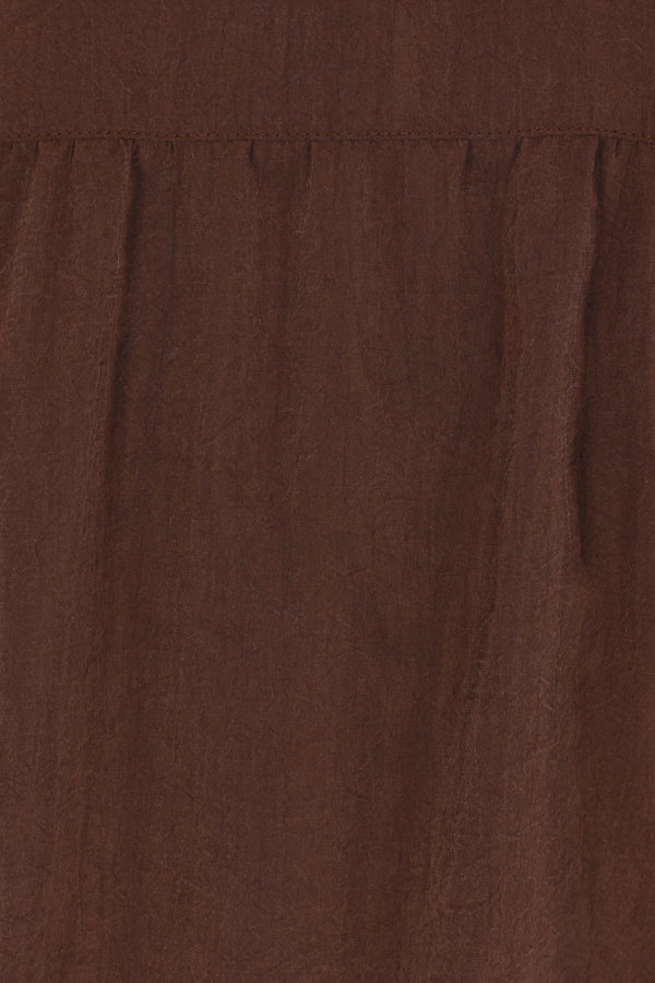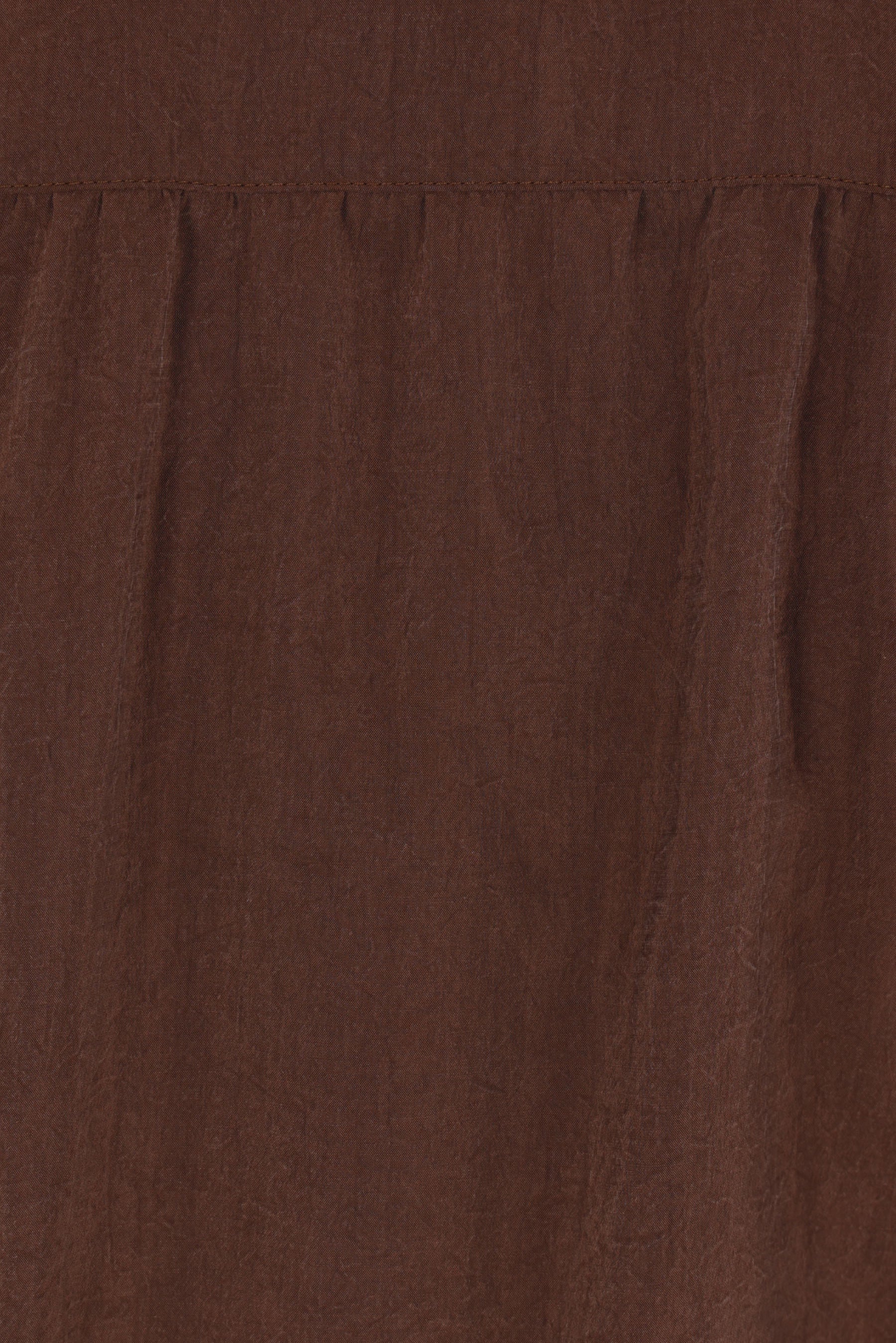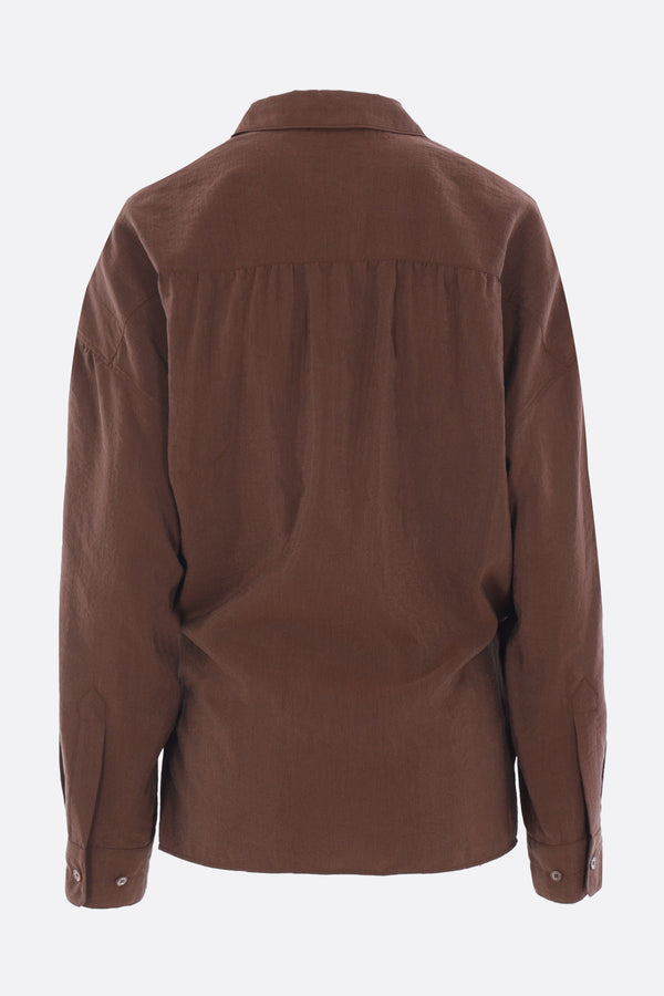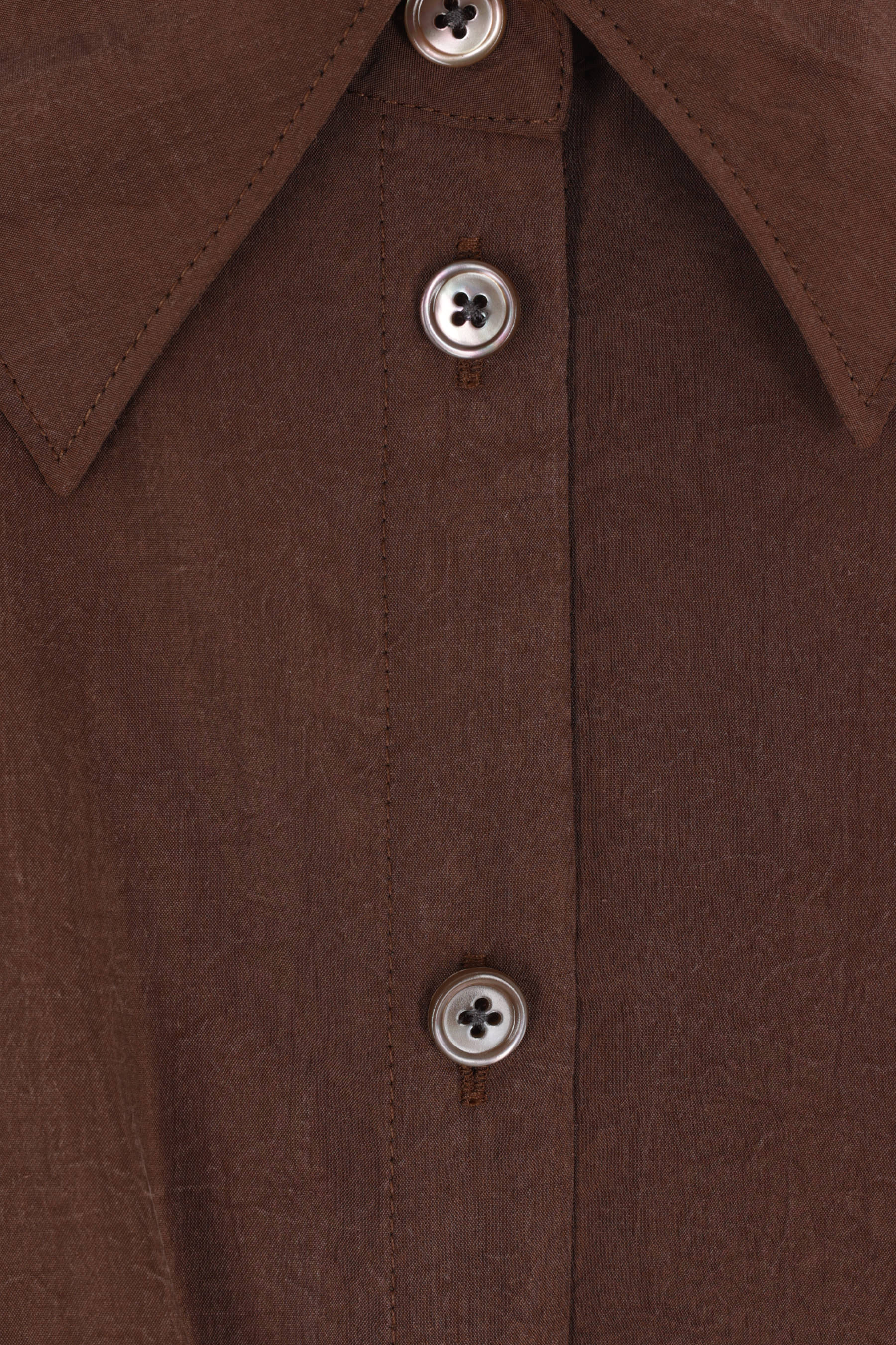 Lemaire shirt crafted from brown silk blend. Featuring a pointed collar, asymmetric button closure, long sleeves with buttoned cuffs, gathered detailing at the back, and a straight hem.