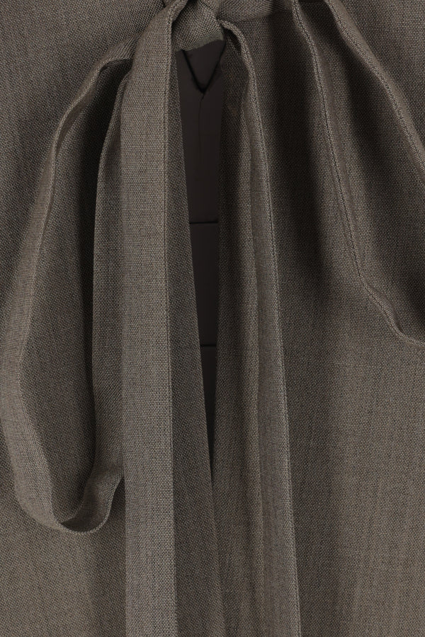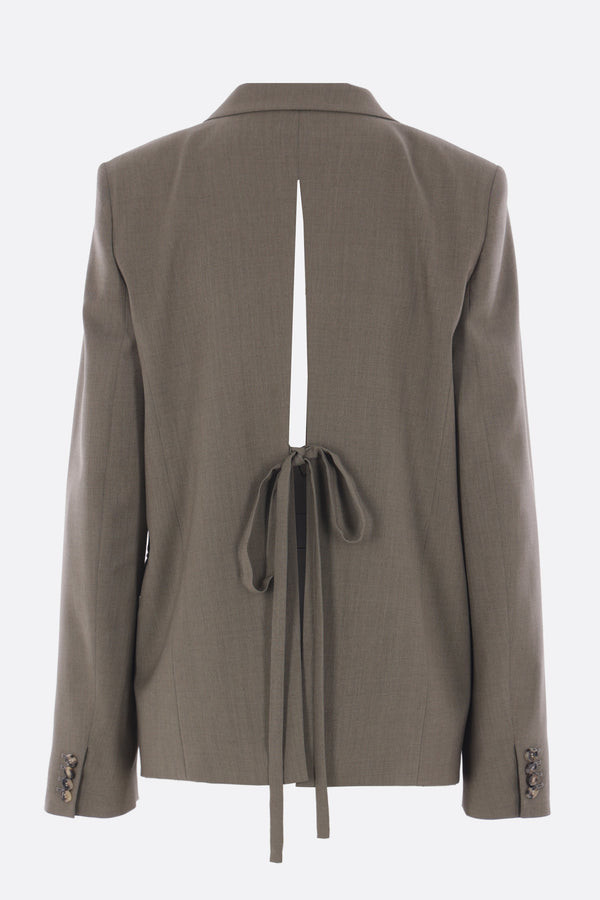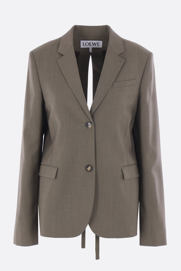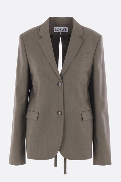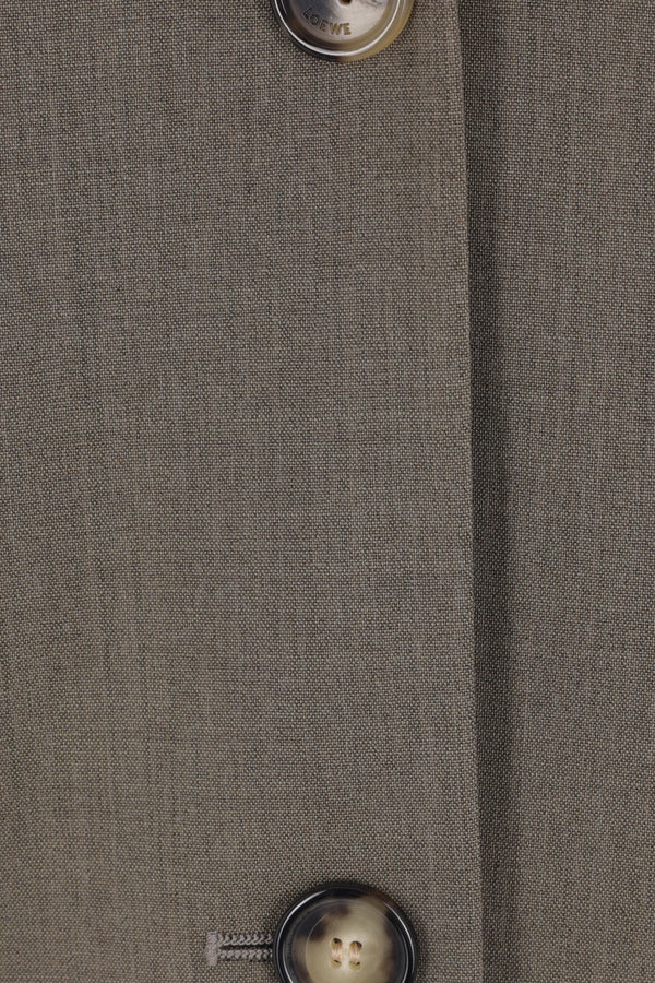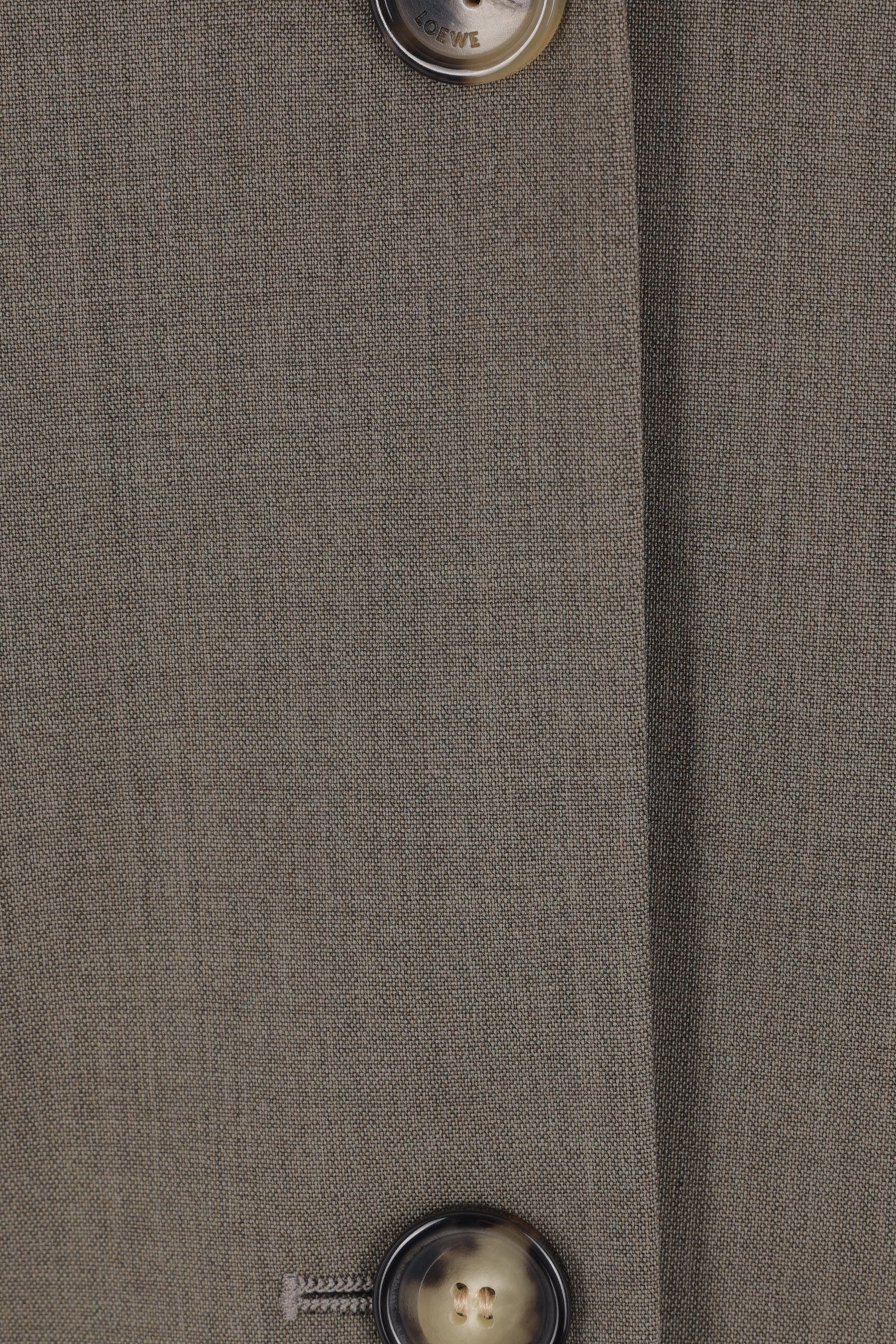 Loewe single-breasted jacket crafted from khaki green mélange wool. Featuring classic lapels, front button closure, structured shoulders, multiple pockets, long sleeves with buttoned cuffs, and a back vent with adjustable ties. Fully lined interior.