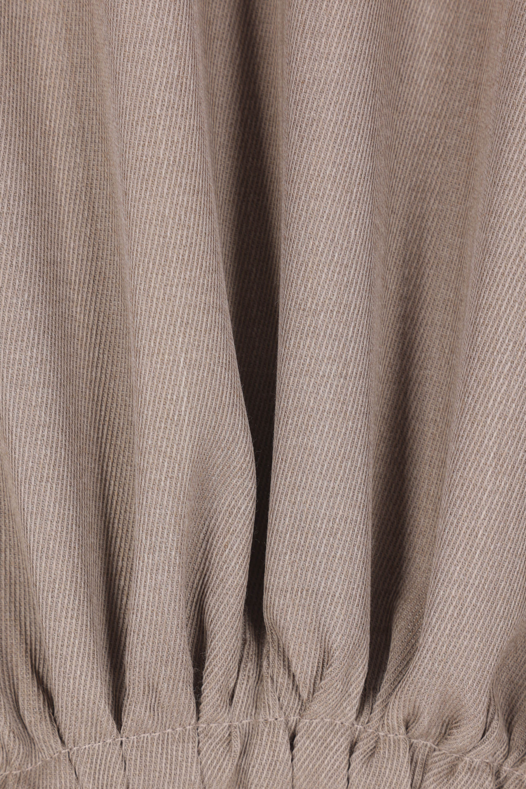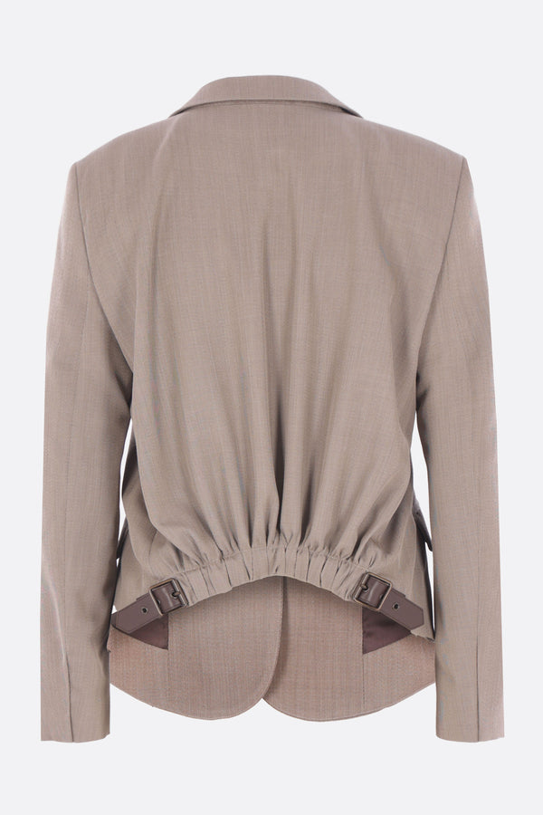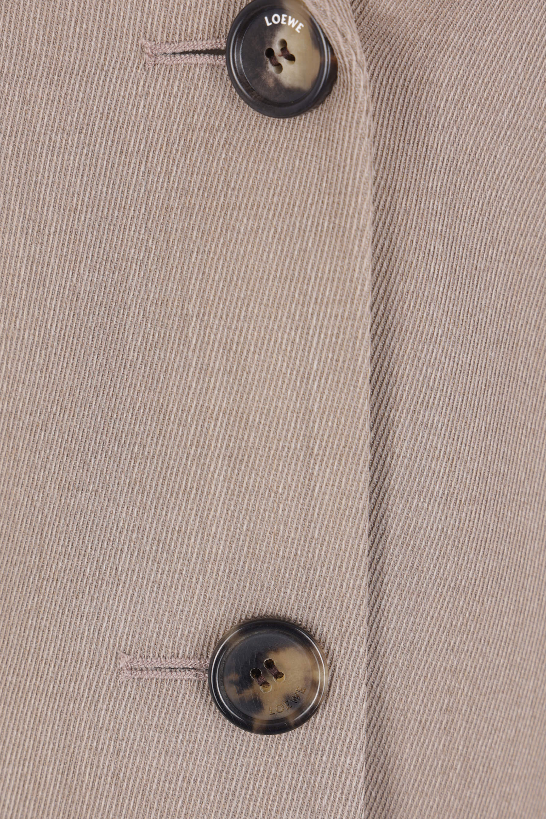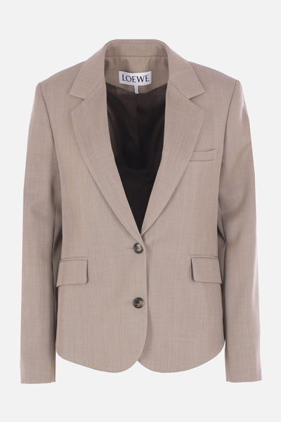 Loewe single-breasted jacket crafted from beige melange wool. Featuring classic lapels, front button closure, structured shoulders, multiple pockets, long sleeves, back waist draping with adjustable straps, and a lined interior.