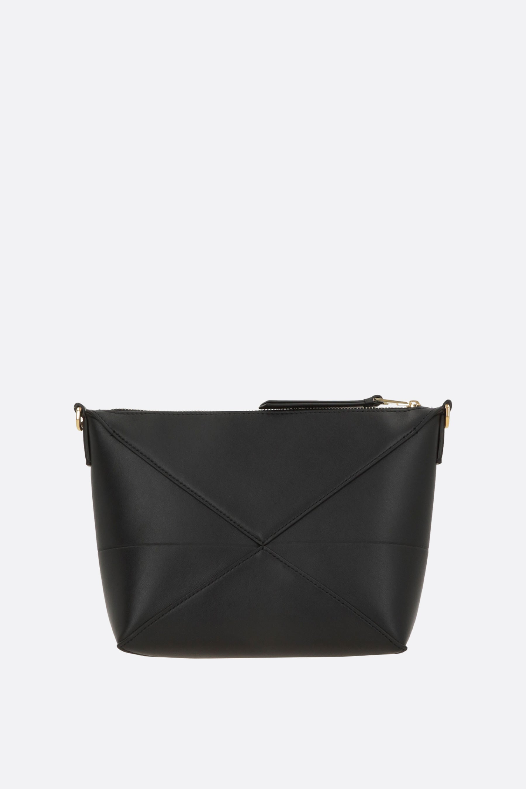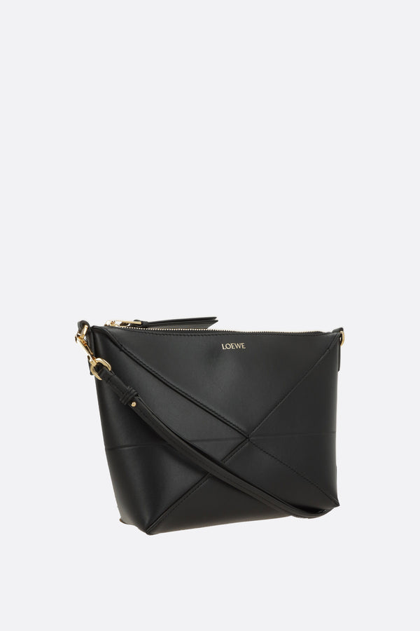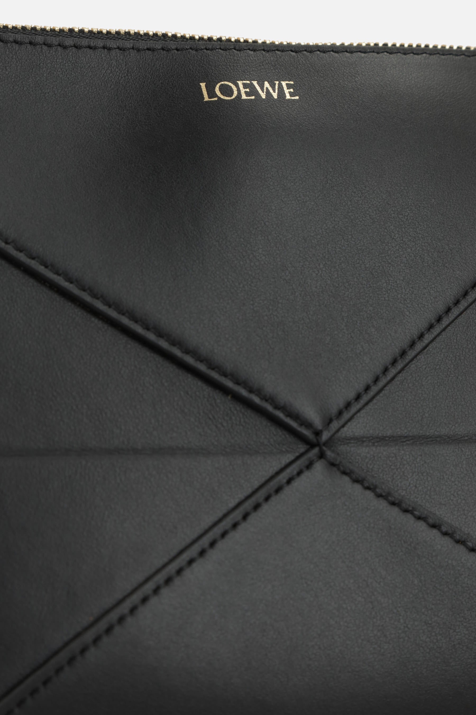Loewe shoulder bag made of glossy black nappa leather. It features gold-tone hardware, a zip closure, and a removable and adjustable shoulder strap. The beige suede-lined interior is complete with the brand's signature embossed Anagram logo on the flap.