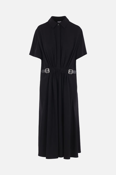 Loewe midi dress crafted from black stretch viscose. Featuring a pointed collar, hidden front button closure, short sleeves, waist draping with adjustable belted straps, and a flared skirt.