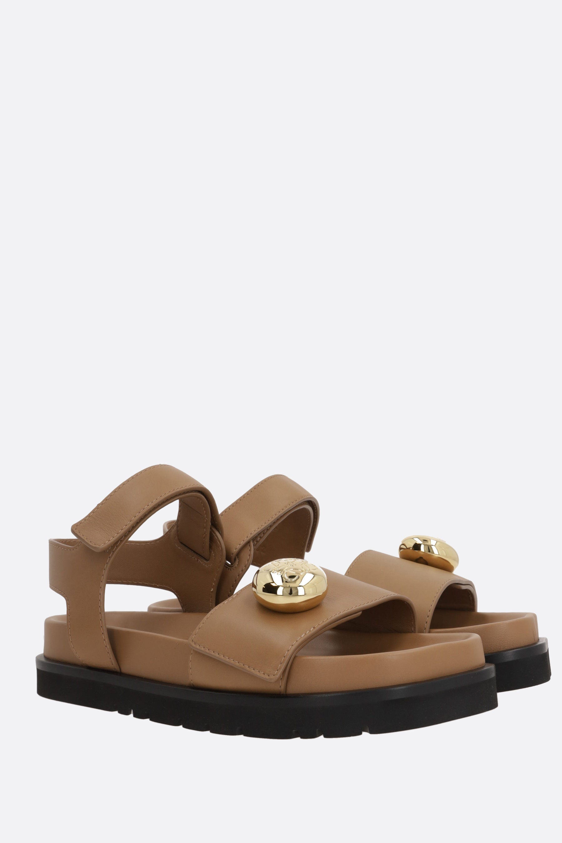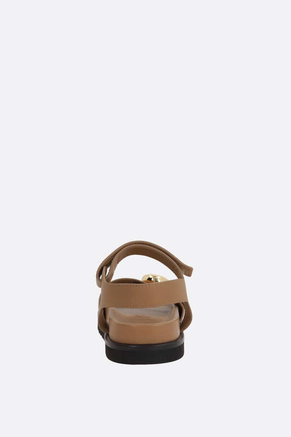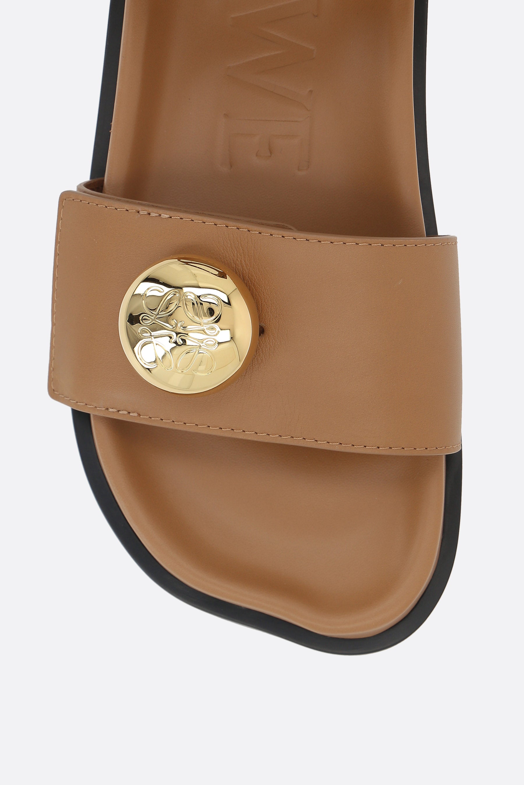 Loewe flat sandals crafted from smooth light brown leather, featuring a gold-tone Anagram Pebble detail. Designed with a petal-shaped toe, adjustable velcro strap, padded insole covered in nappa leather, and rubber sole.