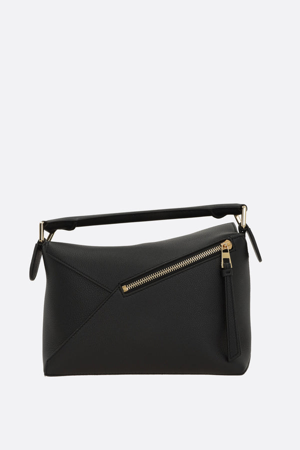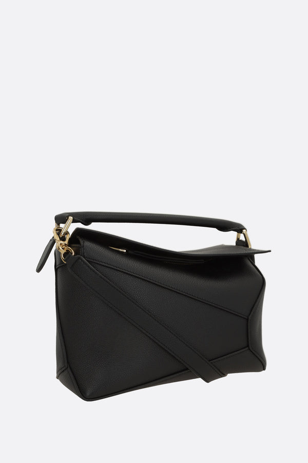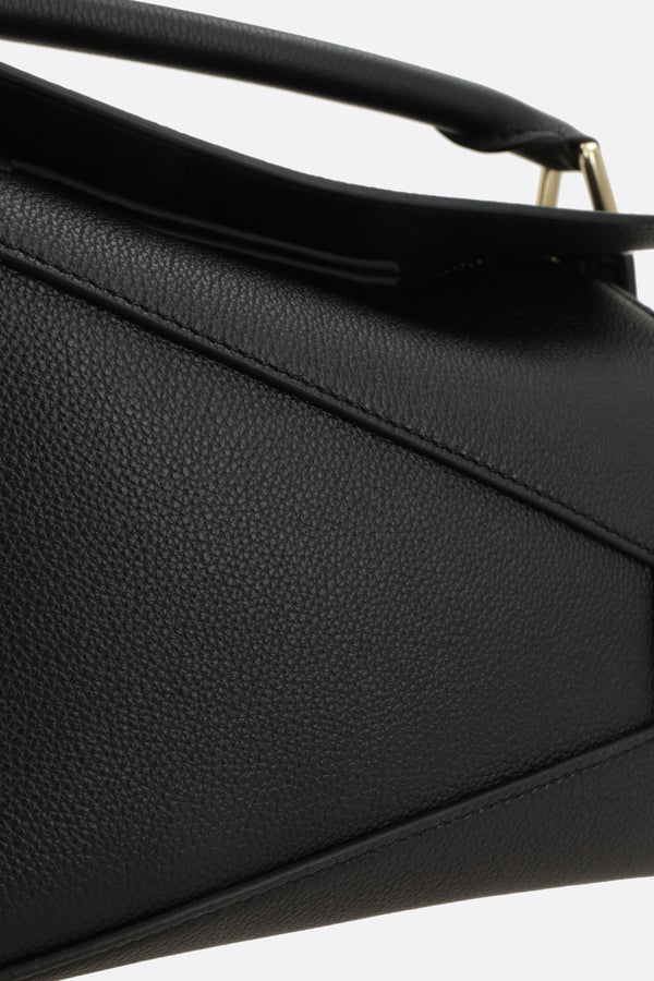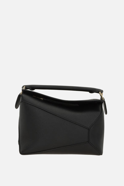 Loewe handbag crafted from black grained leather. Featuring gold-tone metal hardware, concealed zip closure, leather top handle, and an adjustable/removable strap. The interior is lined in natural-tone canvas. The design is completed with the iconic Anagram logo embossed on the flap.