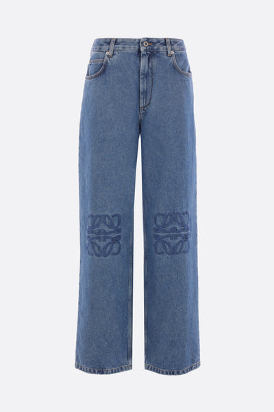 Loewe baggy jeans crafted from light blue cotton denim with Anagram embroidery on the knees. Featuring front closure with metal button and zip, belt loops, five classic pockets, and a leather logo patch on the back.