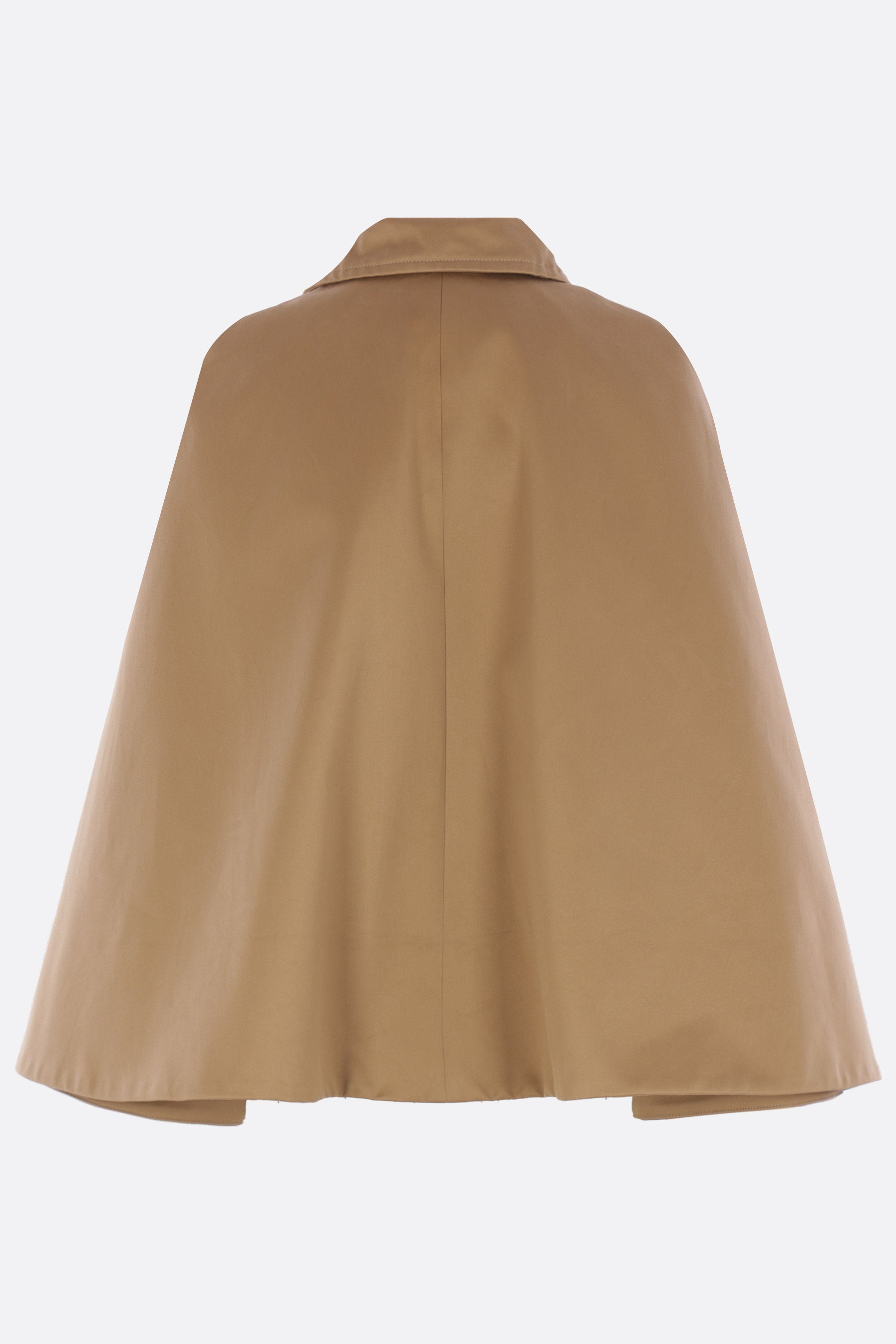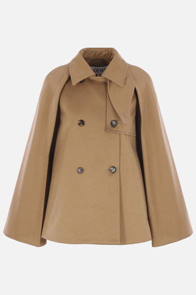 Loewe cape crafted from beige cotton. Featuring a pointed collar with removable throat strap, double-breasted button closure, hidden side pockets, front storm flap, sleeve openings, and a lined interior.