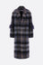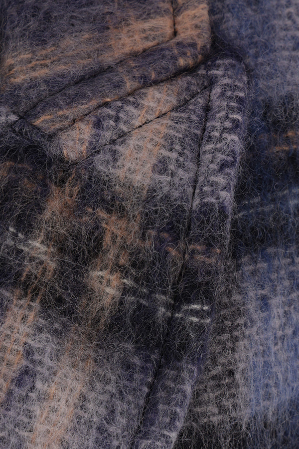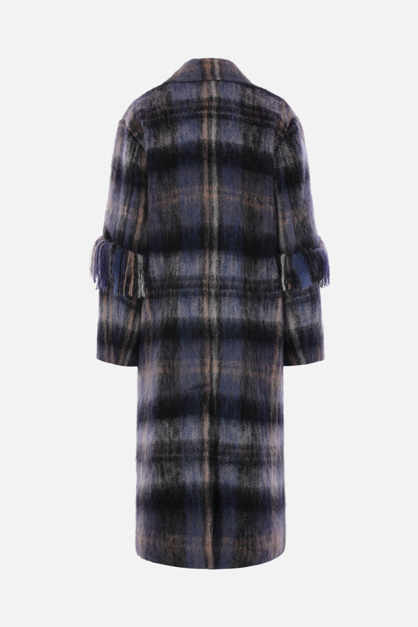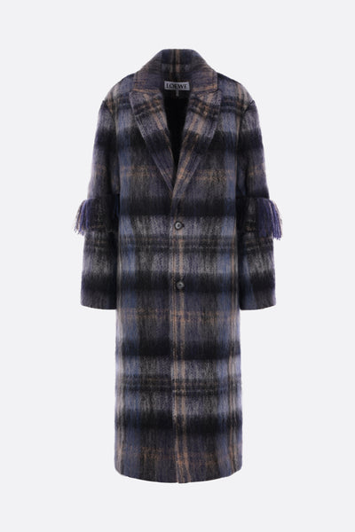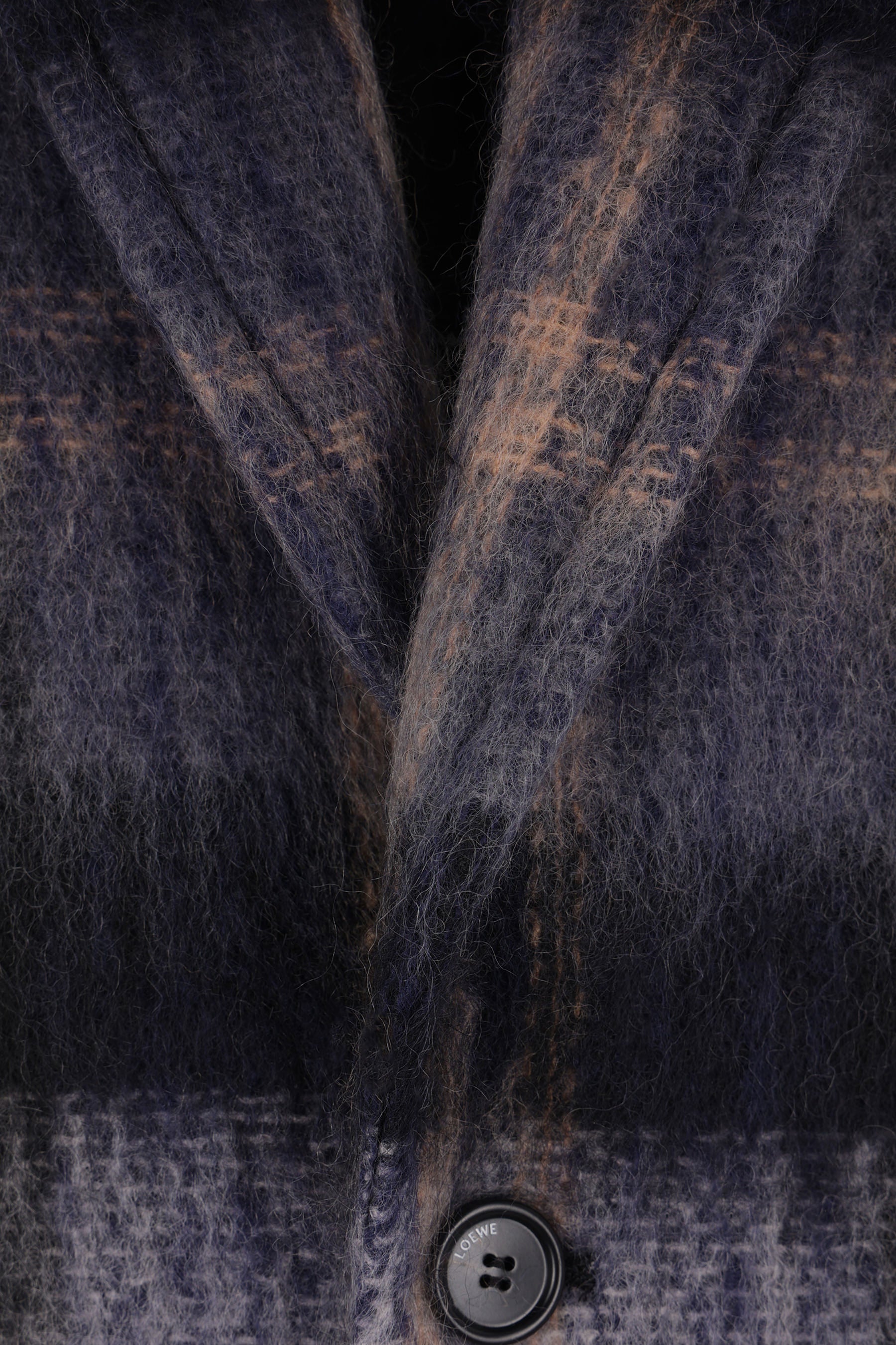 Loewe single-breasted coat crafted from blue-toned plaid mohair and wool blend. Featuring a notched lapel, button closure, invisible side pockets, double-layered sleeves with cuffs and fringes, a central back vent, and a lined interior.