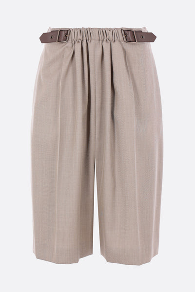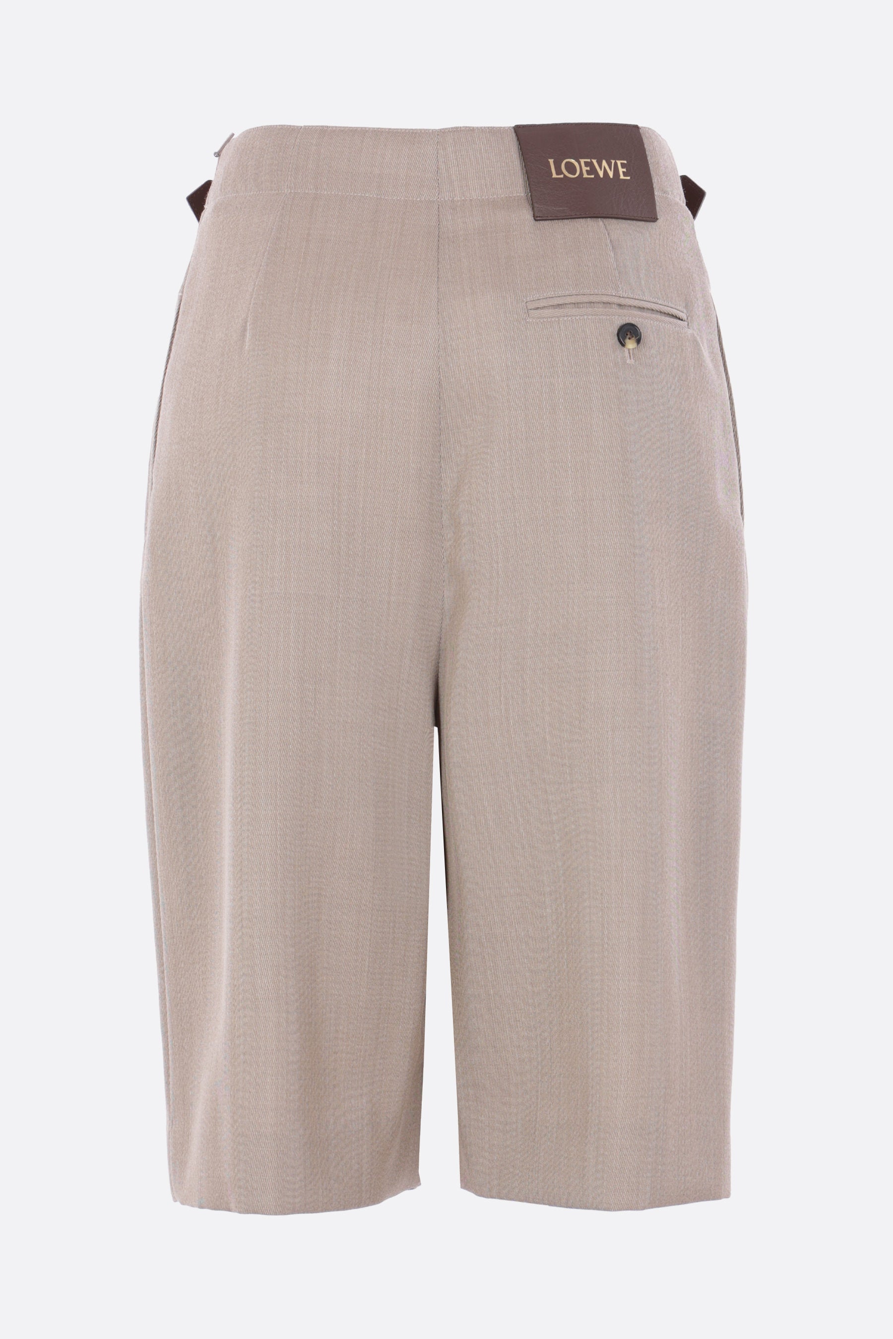 Loewe shorts crafted from lightweight beige melange wool. Featuring a side invisible zip closure, gathered waistband with an adjustable leather belt, multiple pockets, pressed pleats, and a leather logo patch on the back. The interior is unlined.