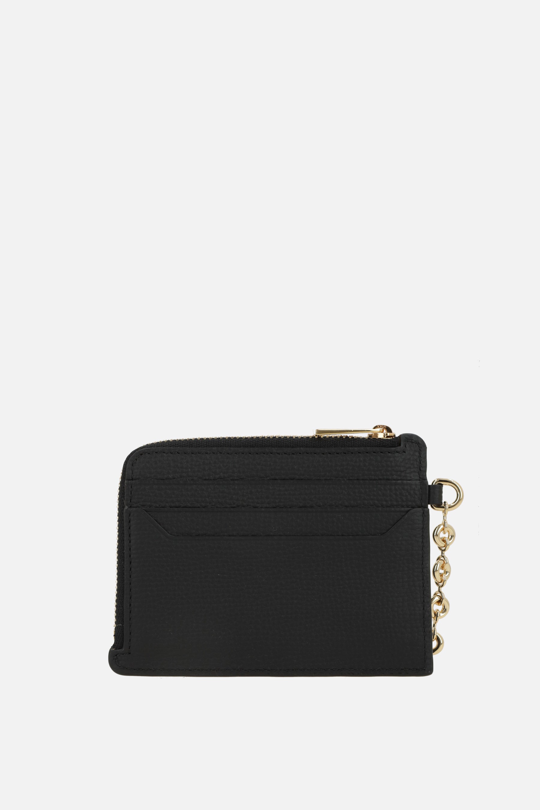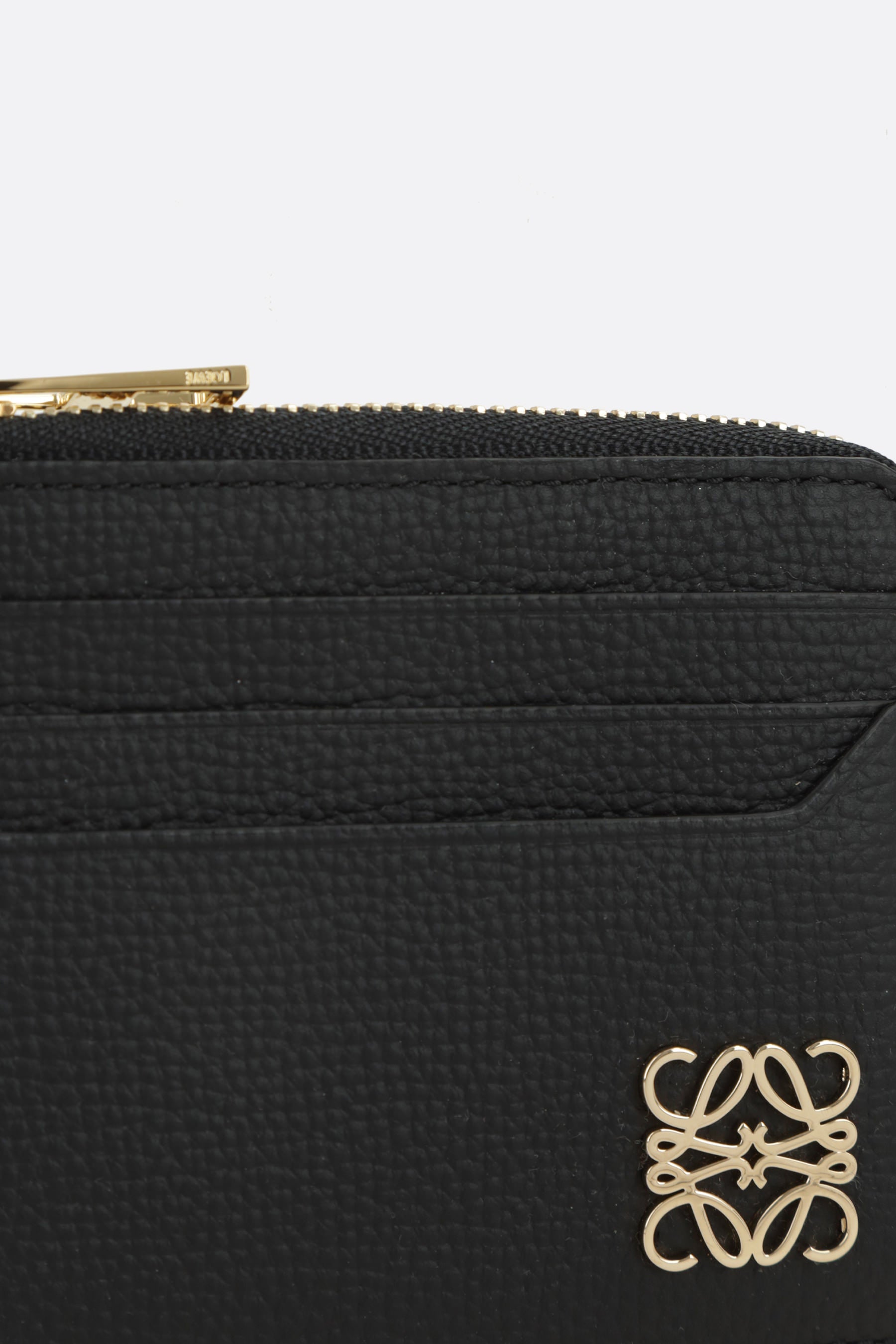 Loewe card holder made of grained leather. Features gold-tone hardware, half-zip closure, six card slots, and a side chain with keyring hook. Interior lined in tone-on-tone leather. Completed with the iconic metal Anagram logo.