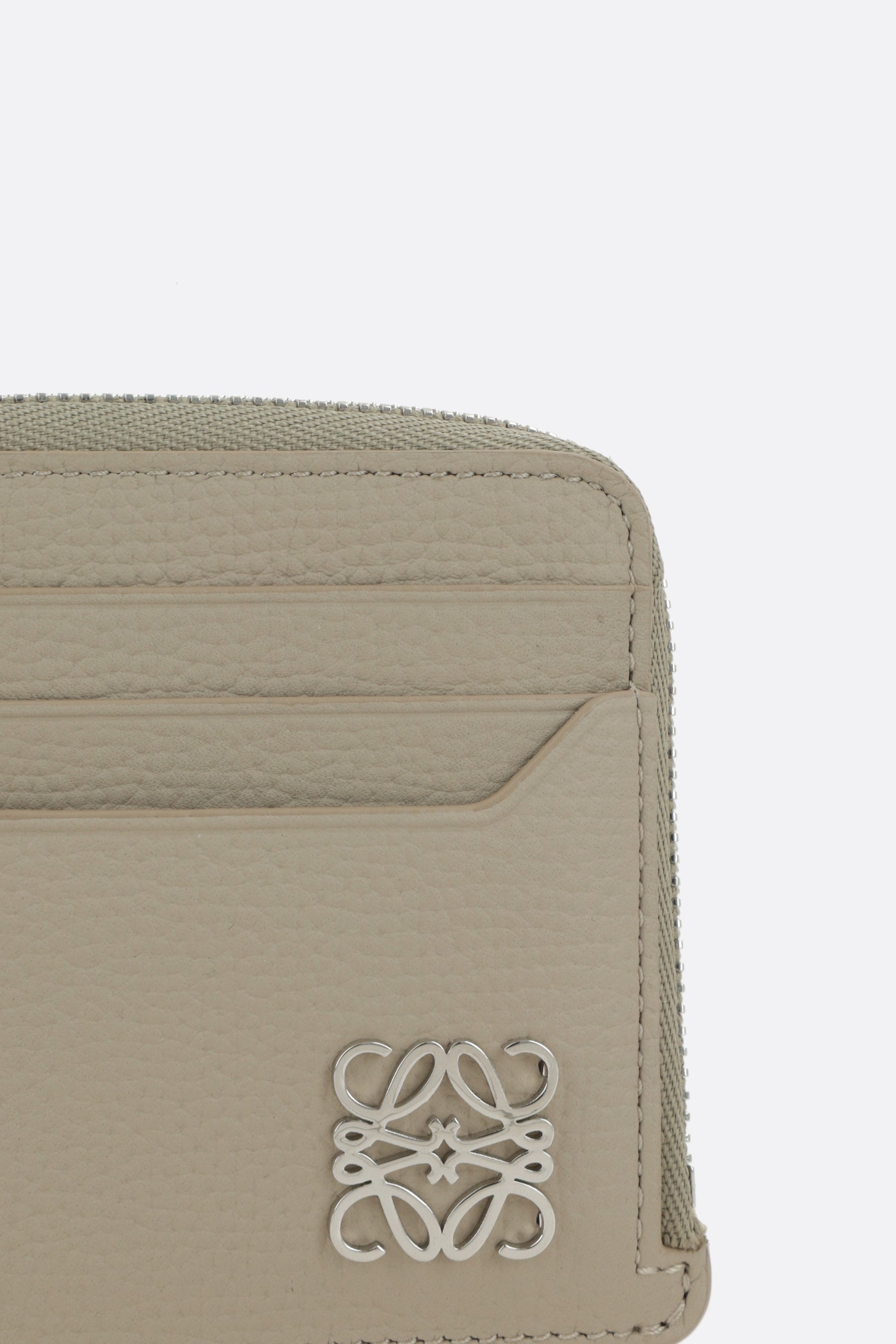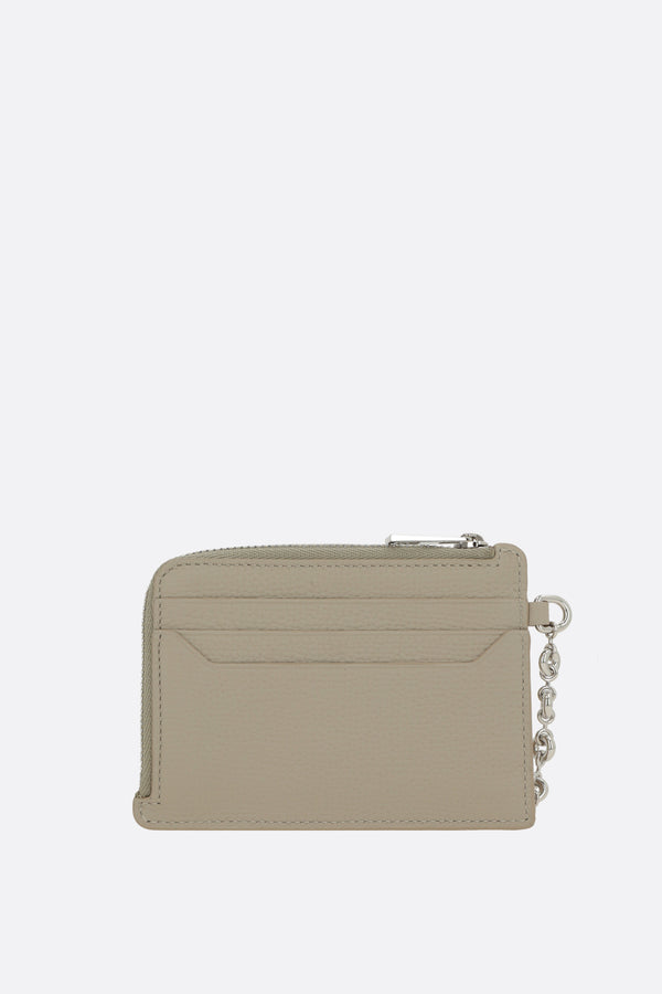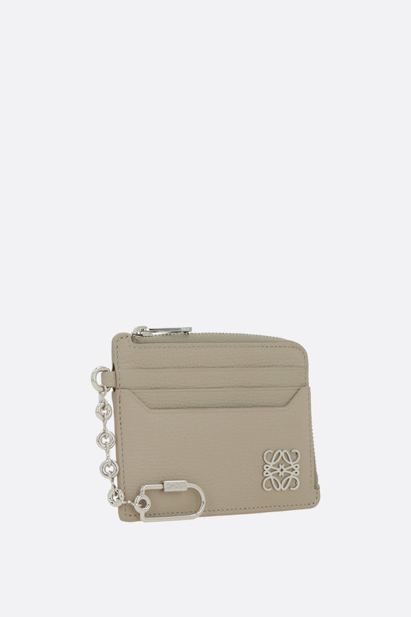Loewe card holder made of grained leather. Features silver-tone hardware, half-zip closure, six card slots, and a side chain with keyring hook. Interior lined in tone-on-tone leather. Completed with the iconic metal Anagram logo.