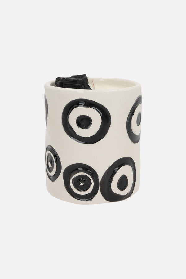 Love & Stones x 10 Corso Como's scented candle encased in a white ceramic vessel hand-decorated with contrasting signature circles. The candle is made of organic essential oils and natural soy wax with pachouli and lemongrass notes. It is embellished by black tourmalines.