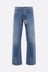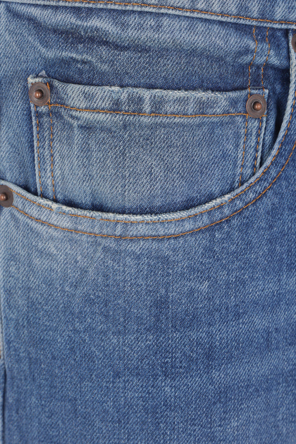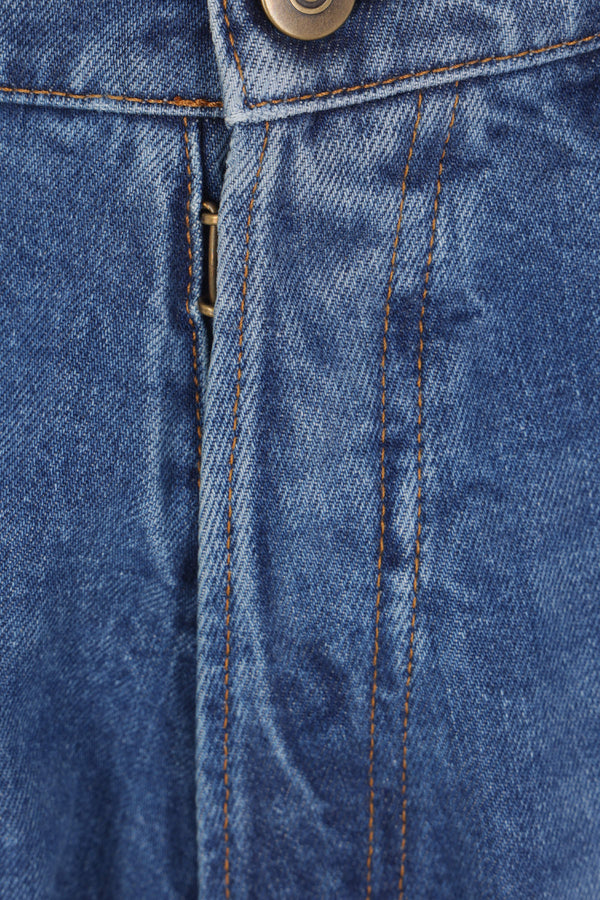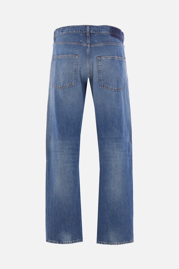Maison Margiela jeans crafted from medium-blue cotton denim with a washed effect, stitched rips and patches. Featuring a front closure with metal buttons, belt loops, and five classic pockets. The design is completed with the Maison's iconic rear stitching.