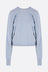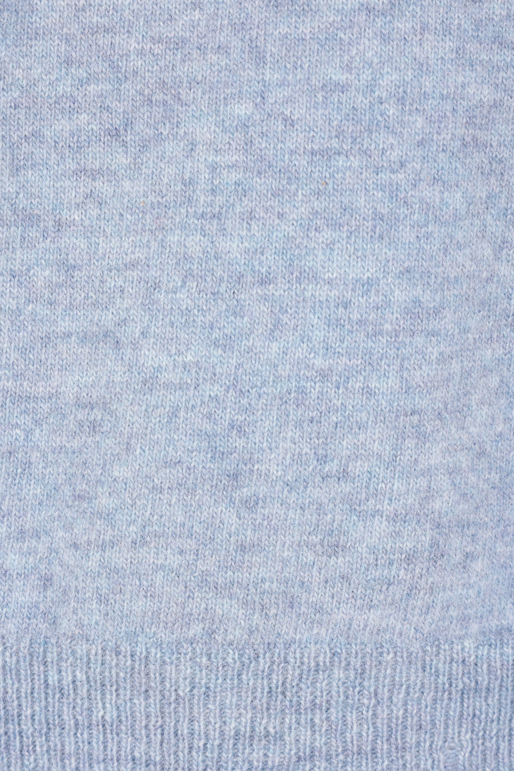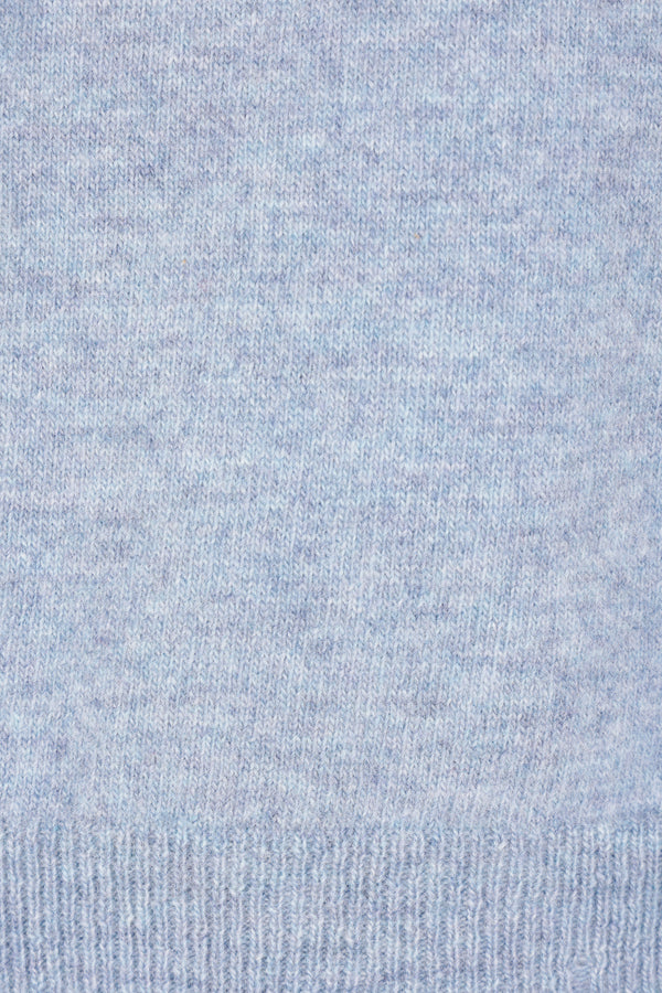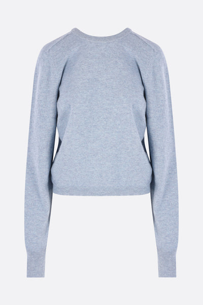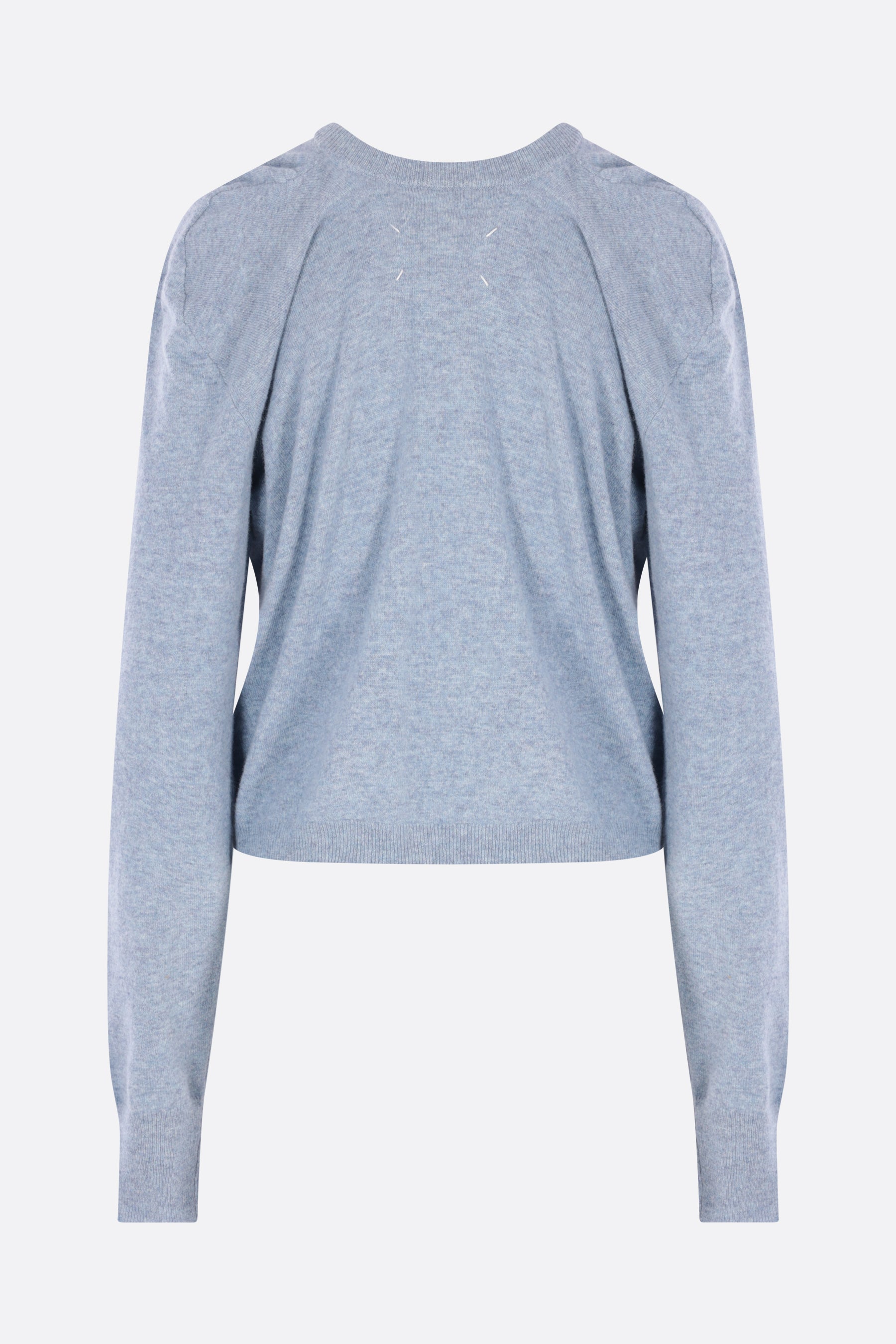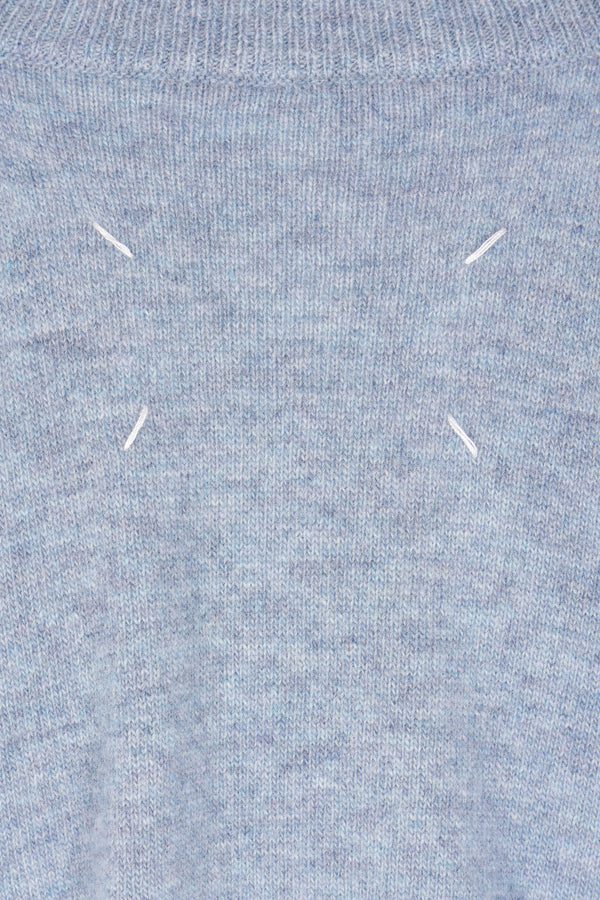 Maison Margiela sweater crafted from light blue wool knit using the Gestural Cutting technique. It features a crew neckline, long sleeves, raised shoulder seams, and ribbed trims, completed with the brand's signature four back stitches.
