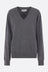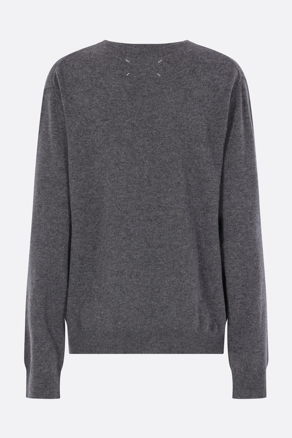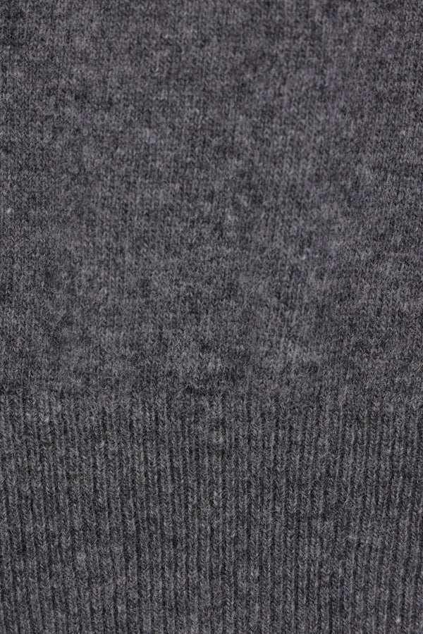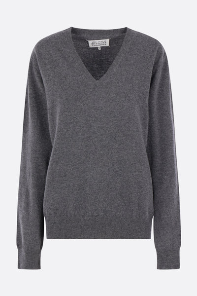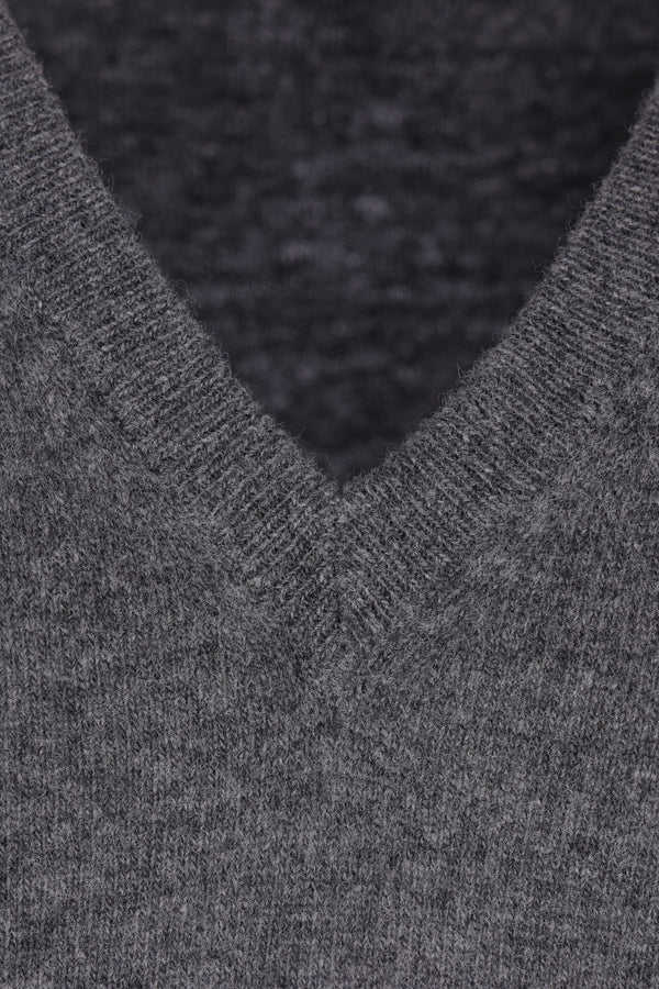 Maison Margiela sweater crafted from dark gray wool knit. It features a V-neckline, long sleeves, and ribbed edges. The design is completed by the Maison's signature four stitches on the back.