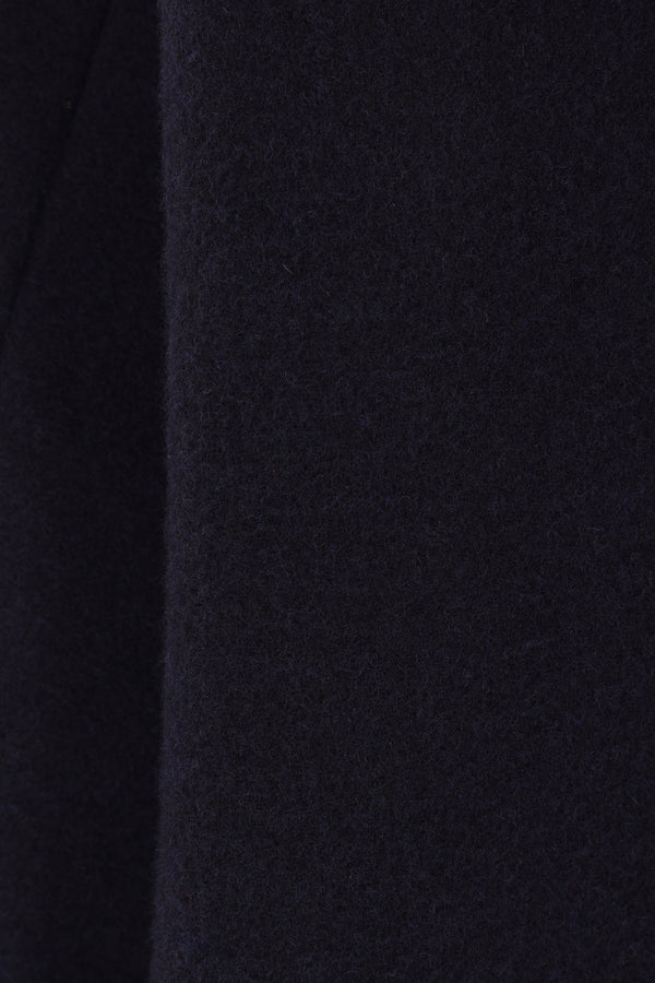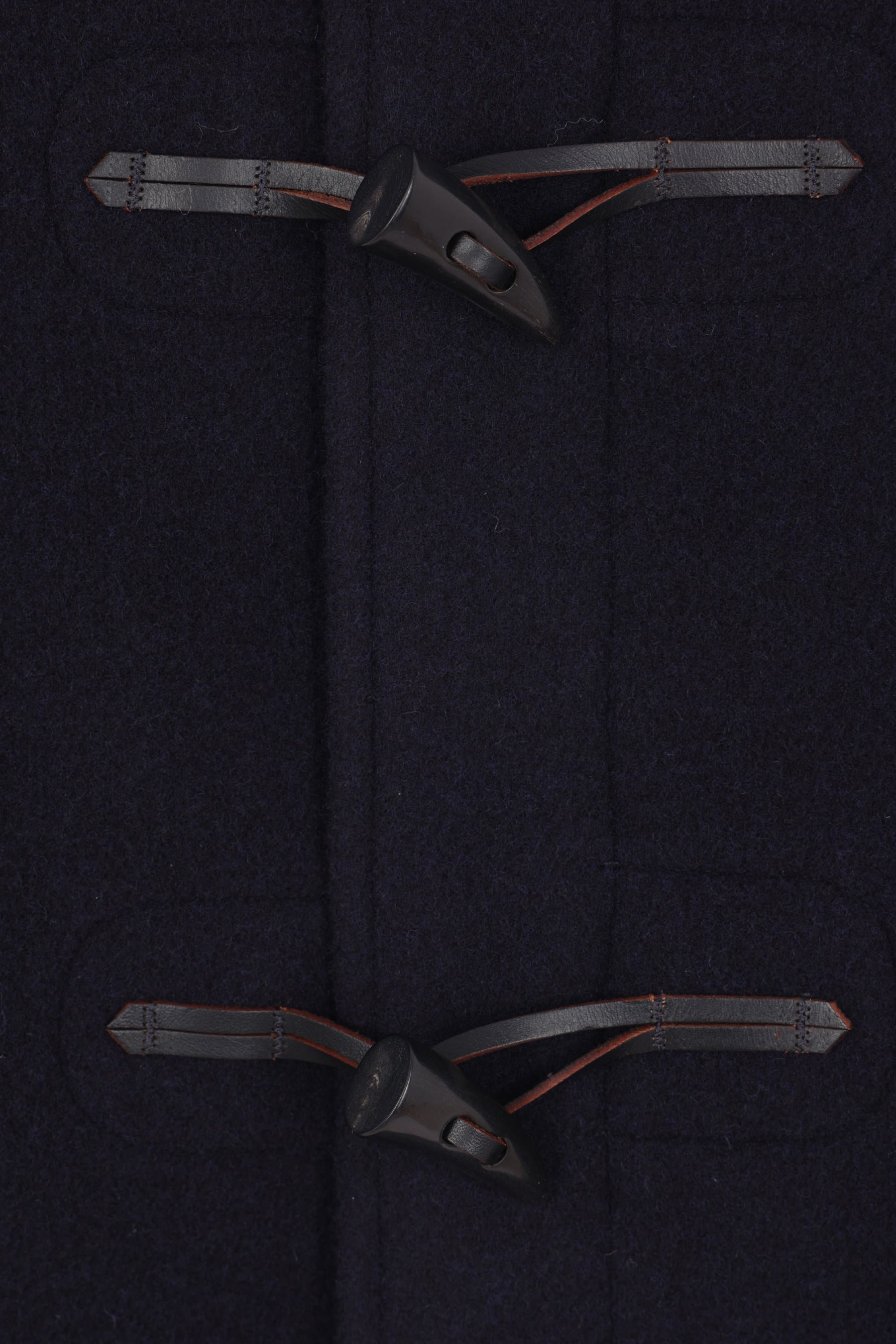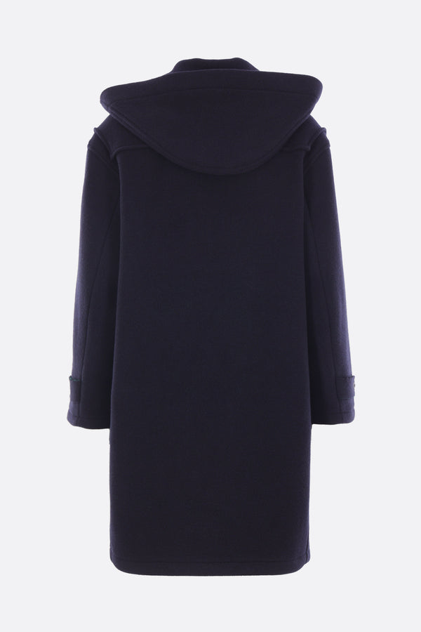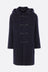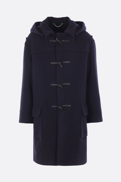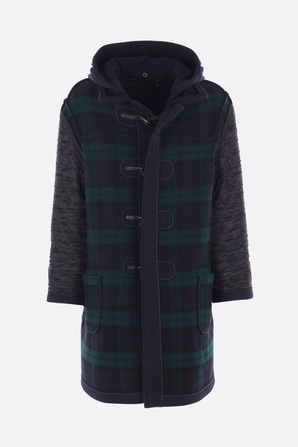 Maison Margiela reversible duffle coat made of blue wool on one side and check pattern with quilted nylon sleeves on the other. Featuring a pointed collar, removable hood, front toggle closure, front pockets, long sleeves with wrist tabs, and a straight hem. The design is completed by the Maison's signature four white stitches on the back.