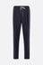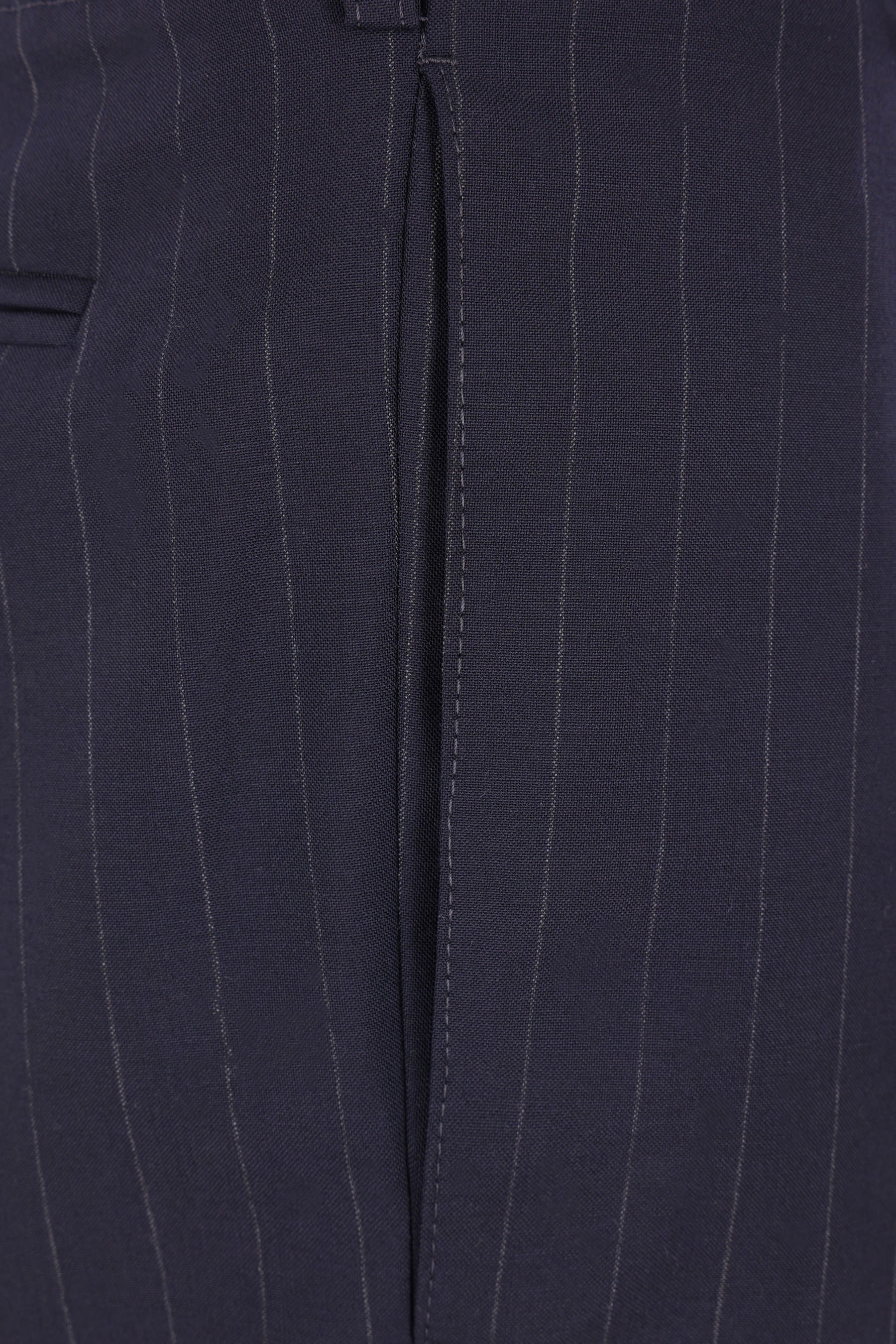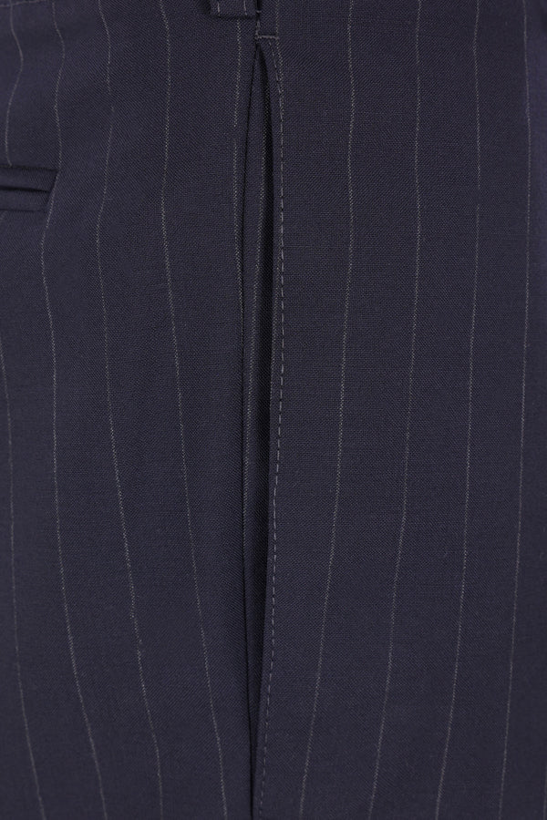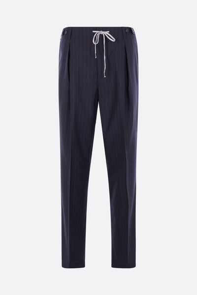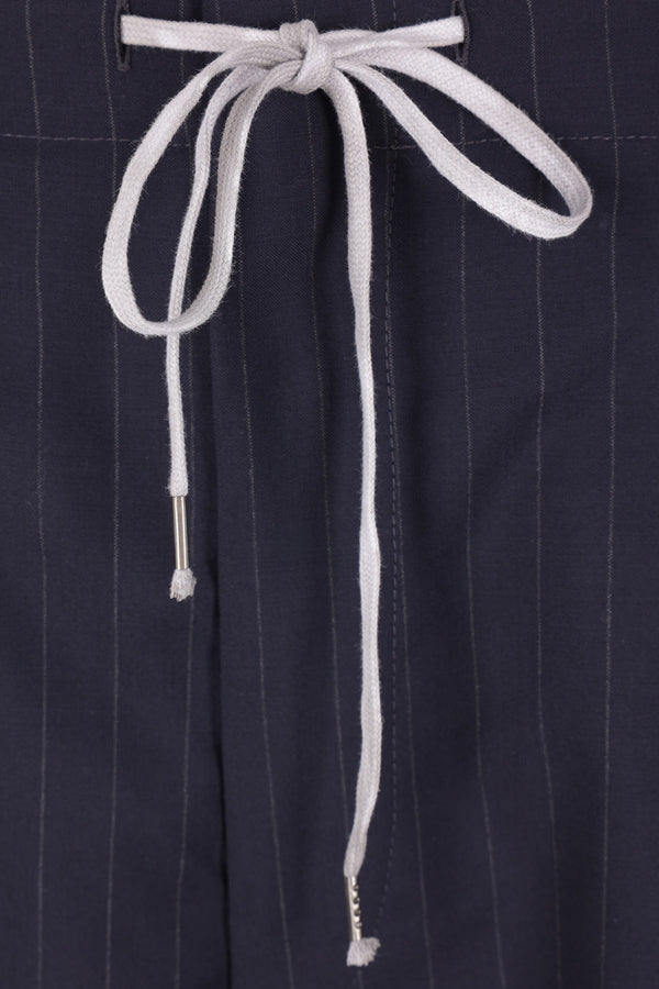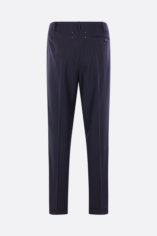 Maison Margiela trousers made of blue pinstripe wool. They feature a drawstring waist, front hook-and-zip closure, belt loops, multiple pockets, adjustable waist tabs, pressed front pleats, and a semi-lined interior. The design is completed by the Maison's signature back stitching.