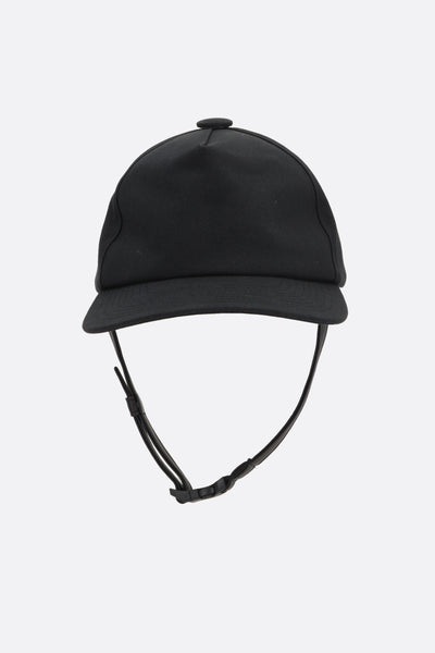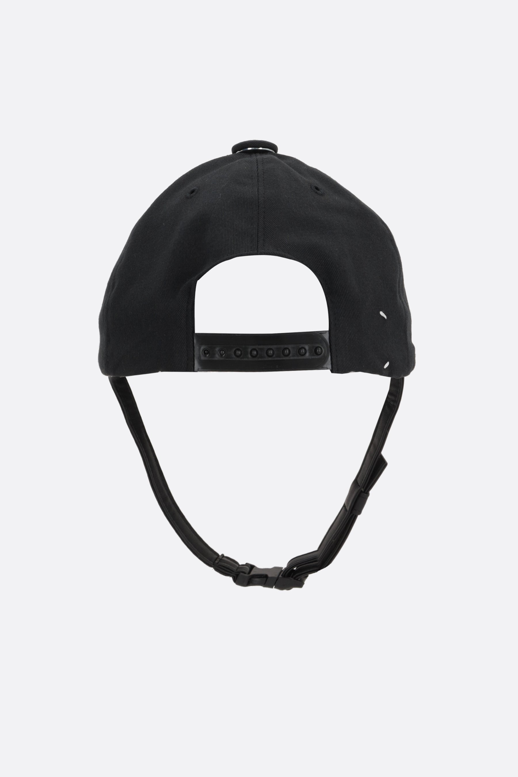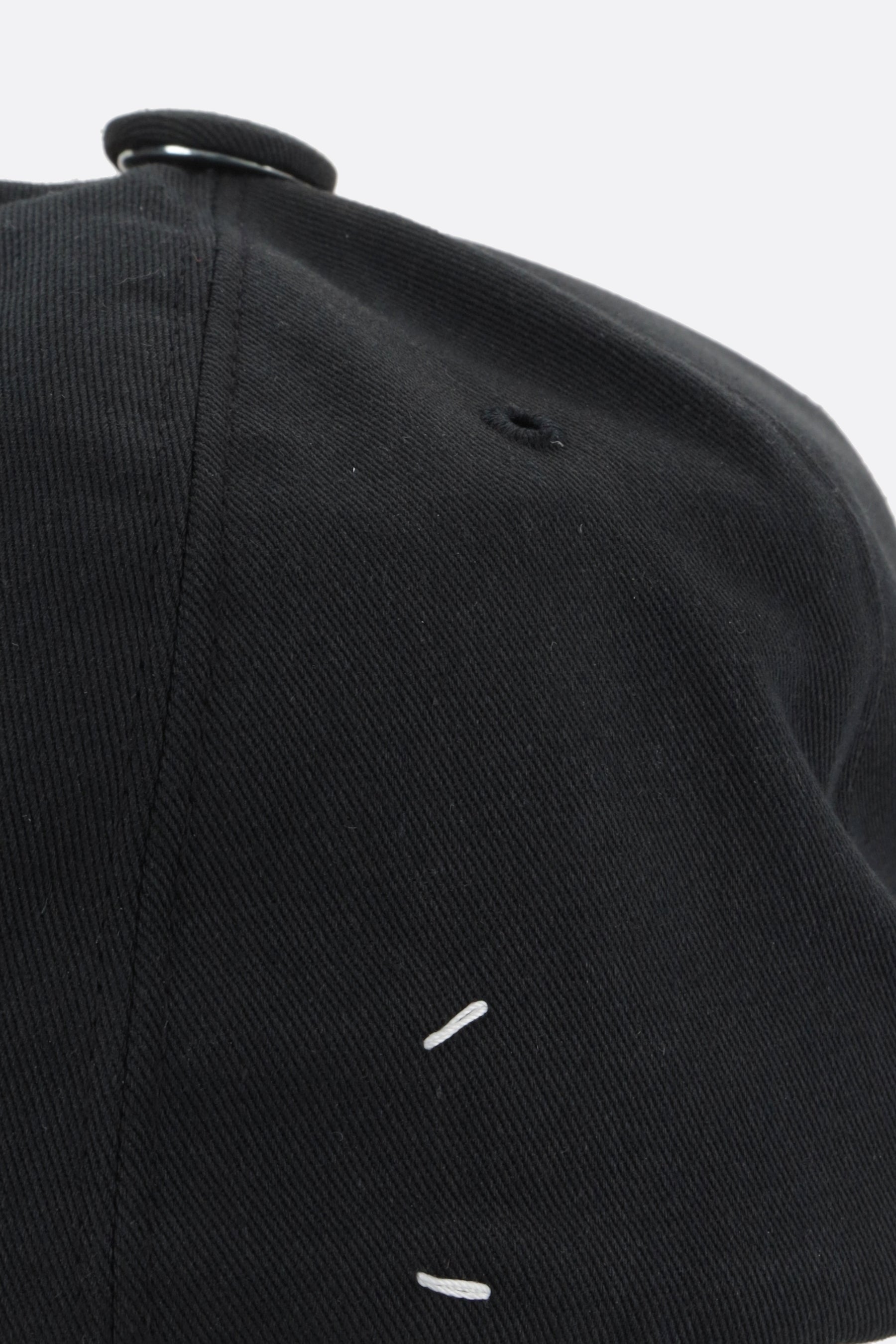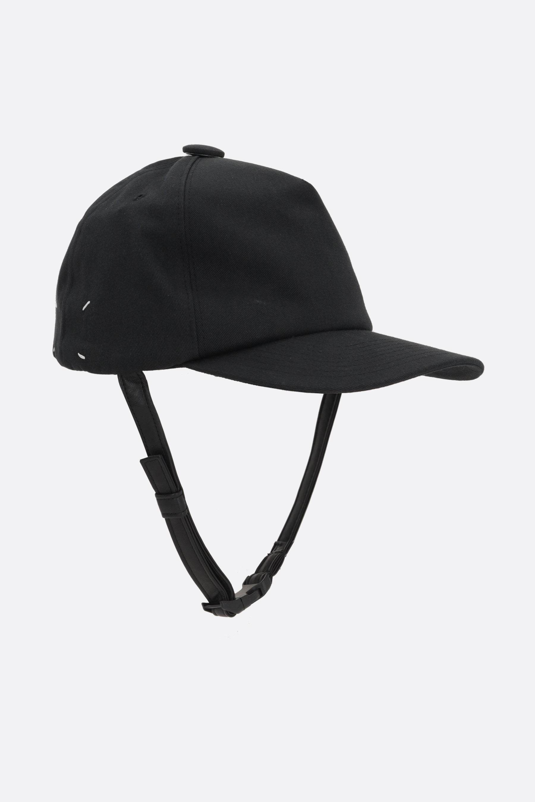 Maison Margiela riding cap made of black cotton gabardine. Features a curved visor, adjustable strap at the back, adjustable eco-leather chin strap, and a lined interior. The design is completed by Maison's signature side stitching.