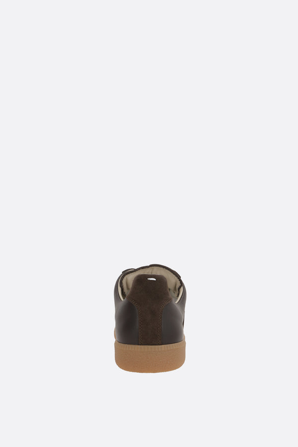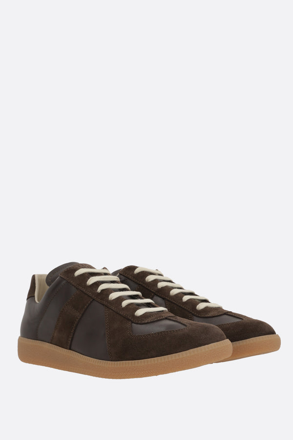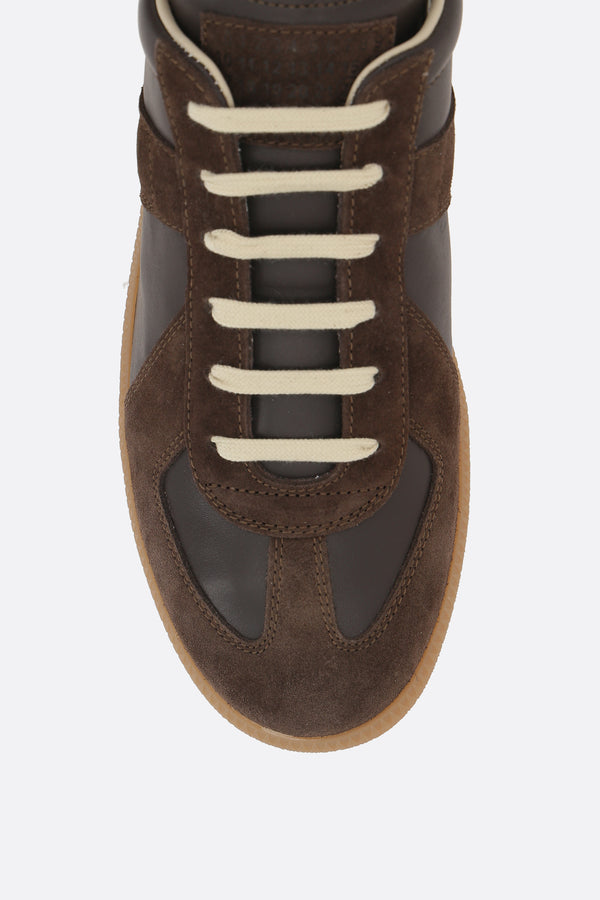 Maison Margiela low-top sneakers crafted from smooth leather and brown suede. Featuring lace-up closure, round toe, leather and fabric lining, and rubber sole. The design is completed by the signature numeric logo label on the tongue and the iconic straight white stitch on the back.