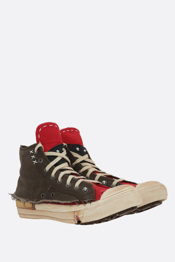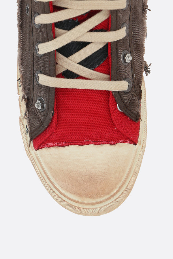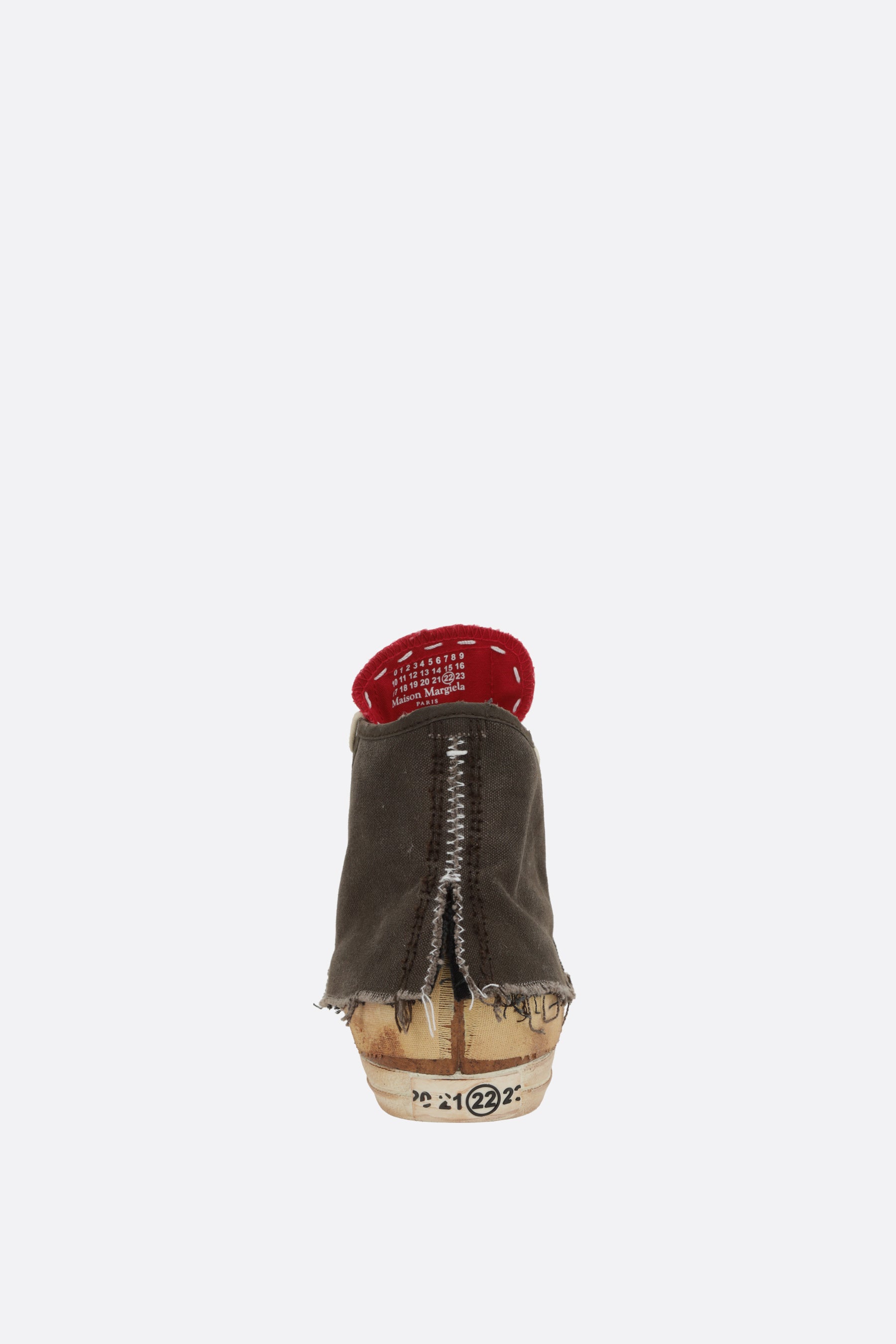 Maison Margiela high-top sneakers crafted from layered canvas, cut and frayed for a worn-in effect. Featuring lace-up closure, rounded toe, visible stitching, distressed edges, fabric linings, and a rubber sole with a distressed finish.