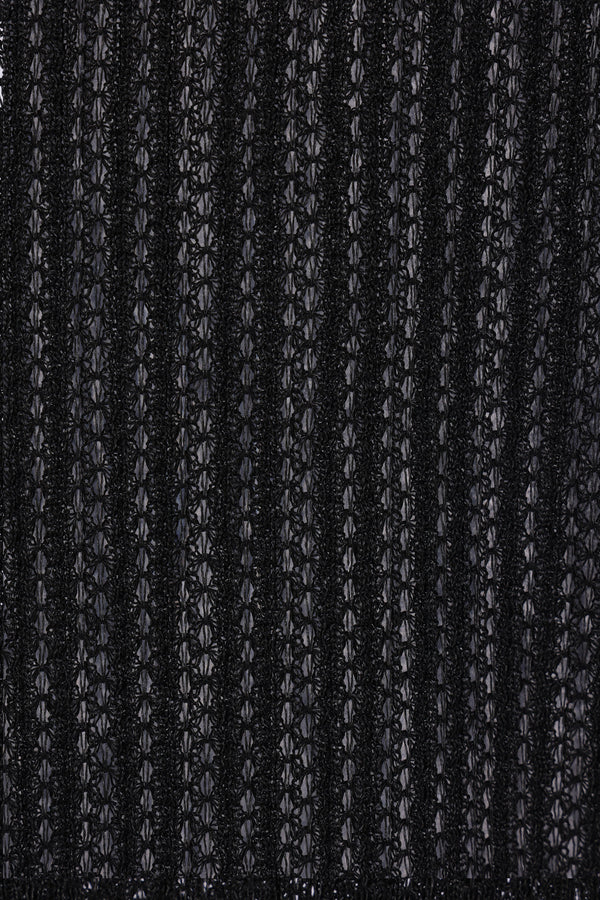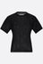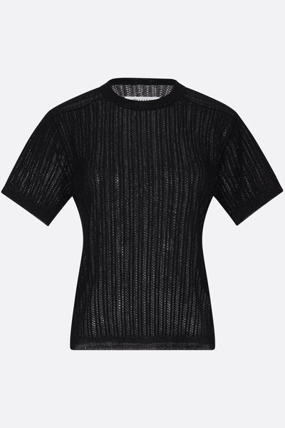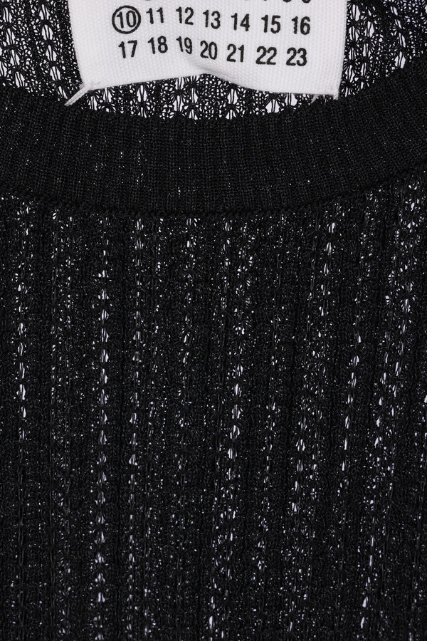 Maison Margiela top crafted from black sheer open-knit ribbed fabric. It features a crew neckline, short sleeves, and a straight hem. The design is completed by the Maison's signature four stitches on the back.
