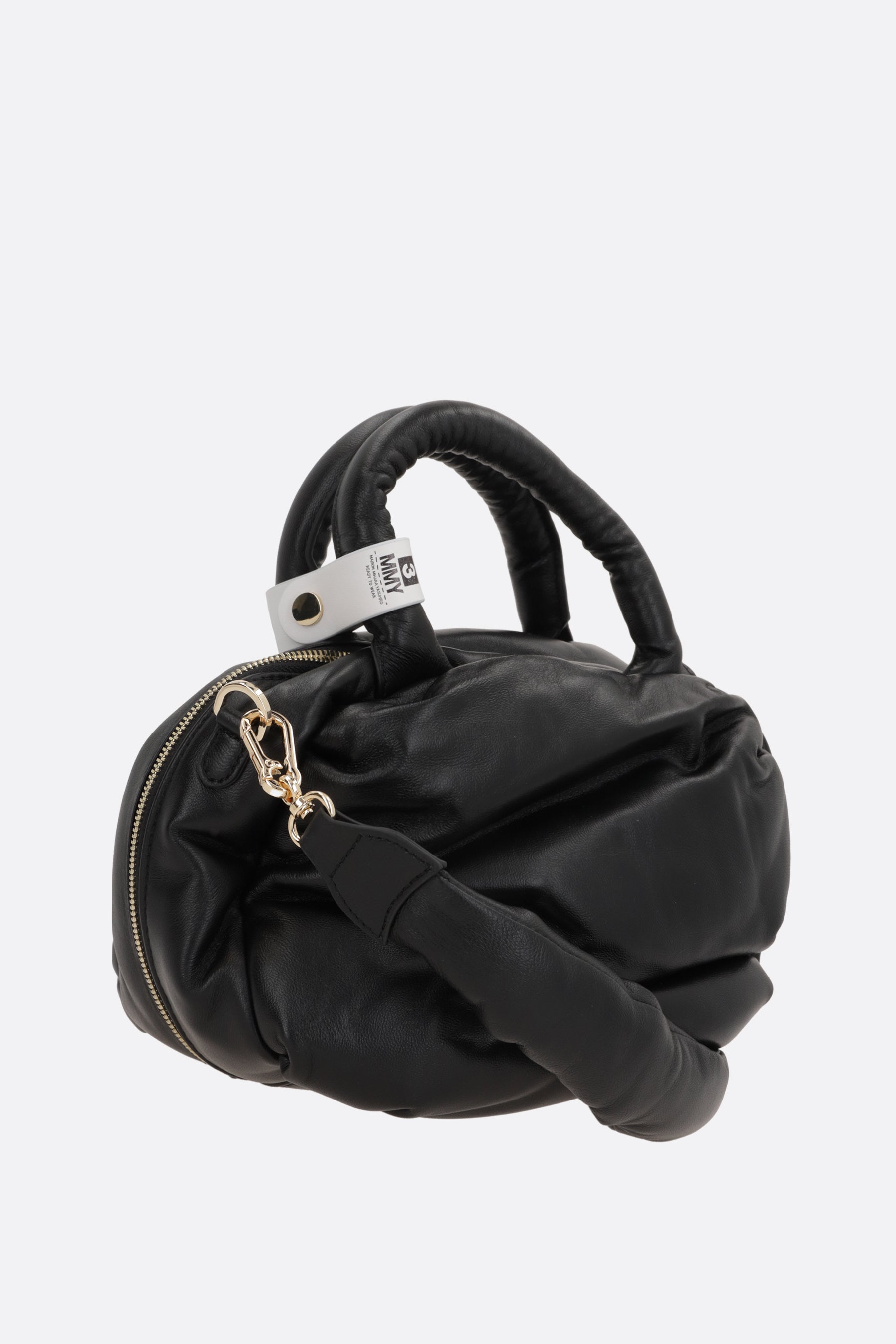 Maison Mihara Yasuhiro handbag crafted in padded black nappa leather with a draped and asymmetric design. It features gold-tone hardware, double-slider zip closure, double handles, padded adjustable/removable shoulder strap and adjustable/removable crossbody strap. Black satin-lined interior with flat and zip pockets. The design is completed by protective metal feet.