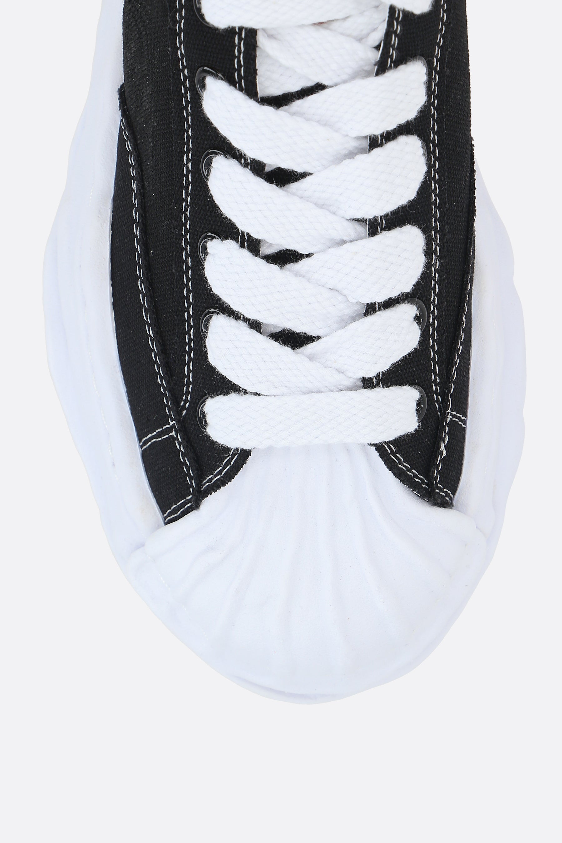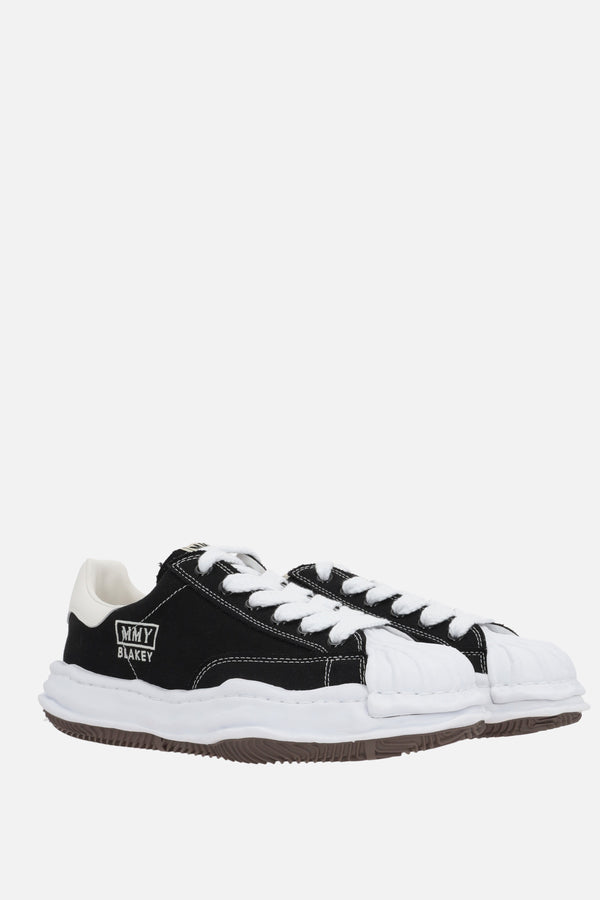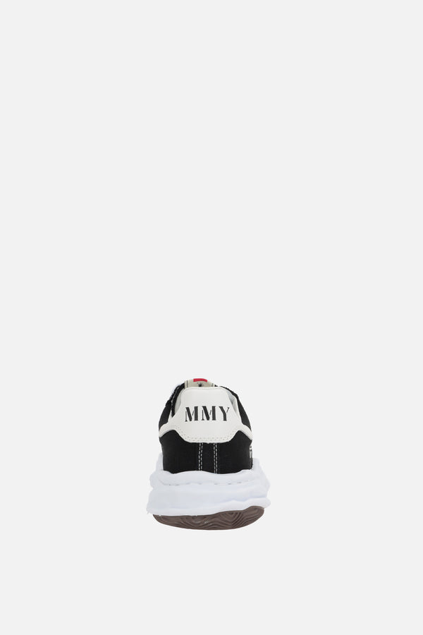 Maison Mihara Yasuhiro low-top sneakers crafted in black canvas with contrasting rubber toe cap. Featuring lace-up closure, a round-toe silhouette, fabric lining and irregular rubber sole. The design is completed by the iconic MMY label on tongue, tone-on-tone MMY Blakey embroidery on side and white leather heel tab with embossed logo.