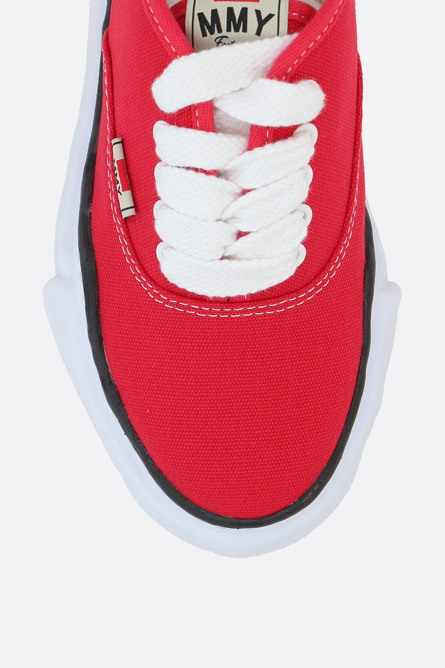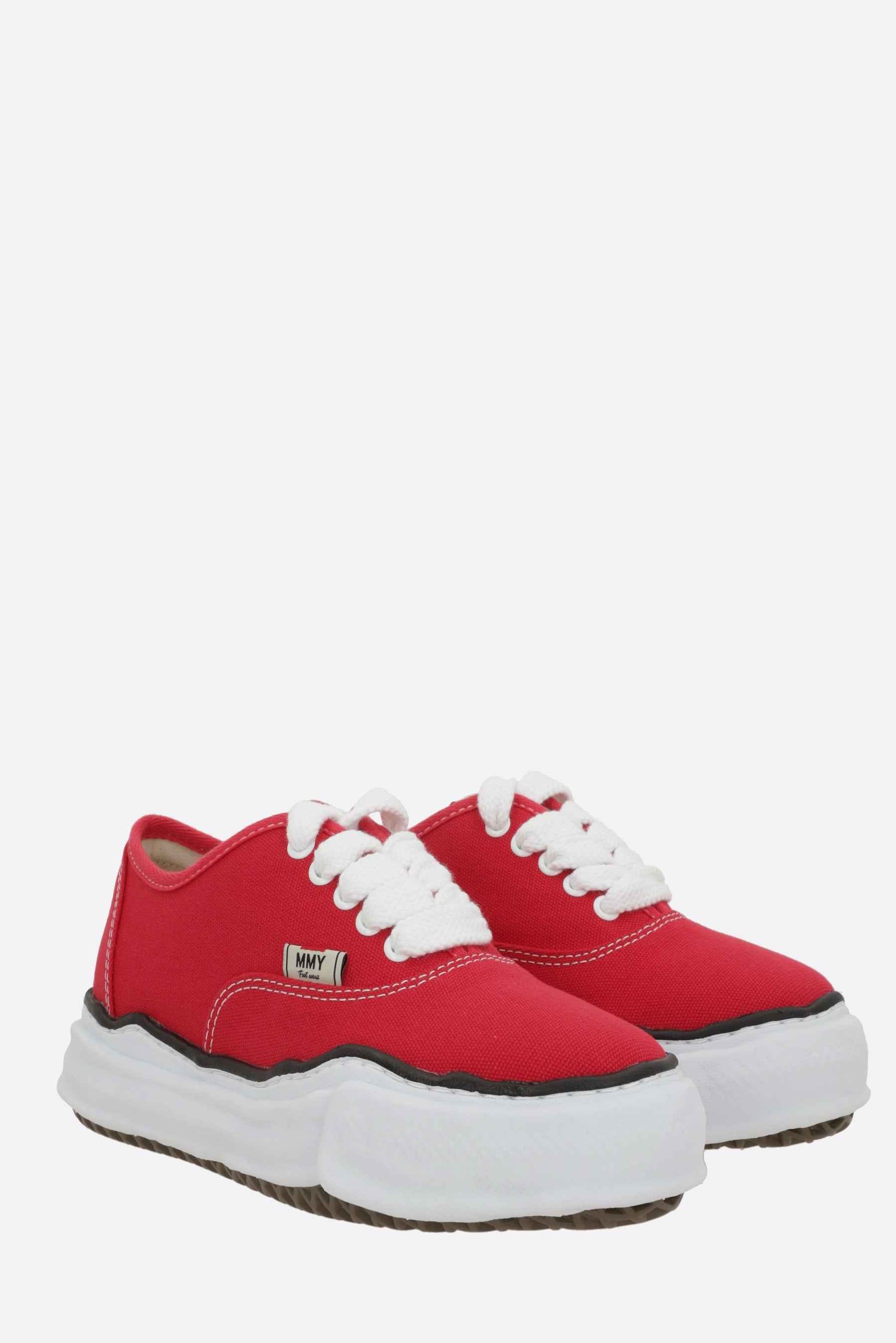 Low-top sneaker by Maison Mihara Yasuhiro, crafted in red canvas. Featuring lace-up closure, round toe, fabric lining, and irregular rubber sole. The design is completed with the MMY label on the tongue.