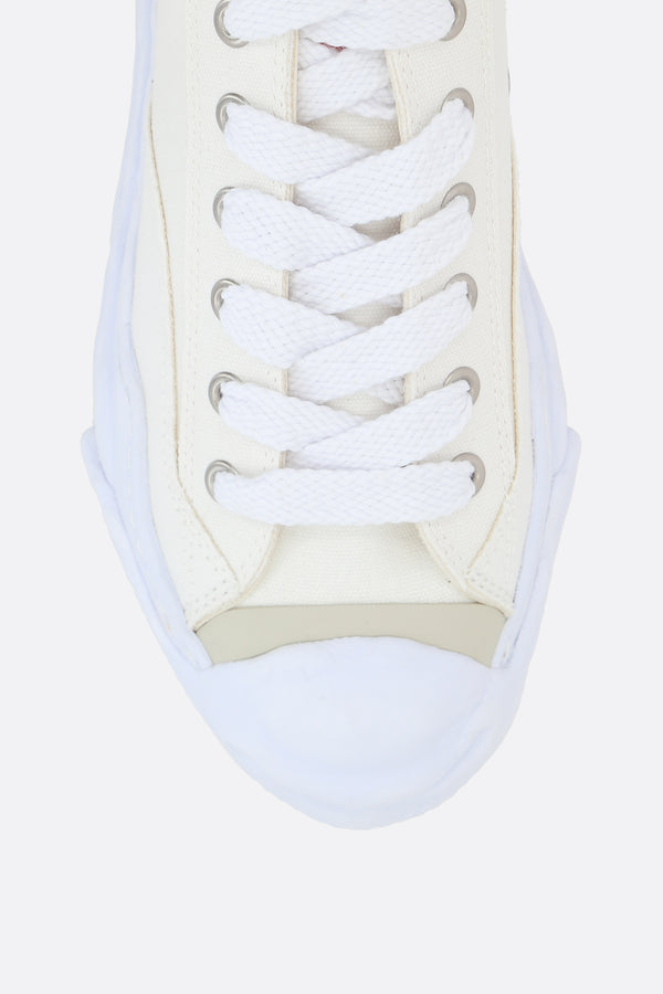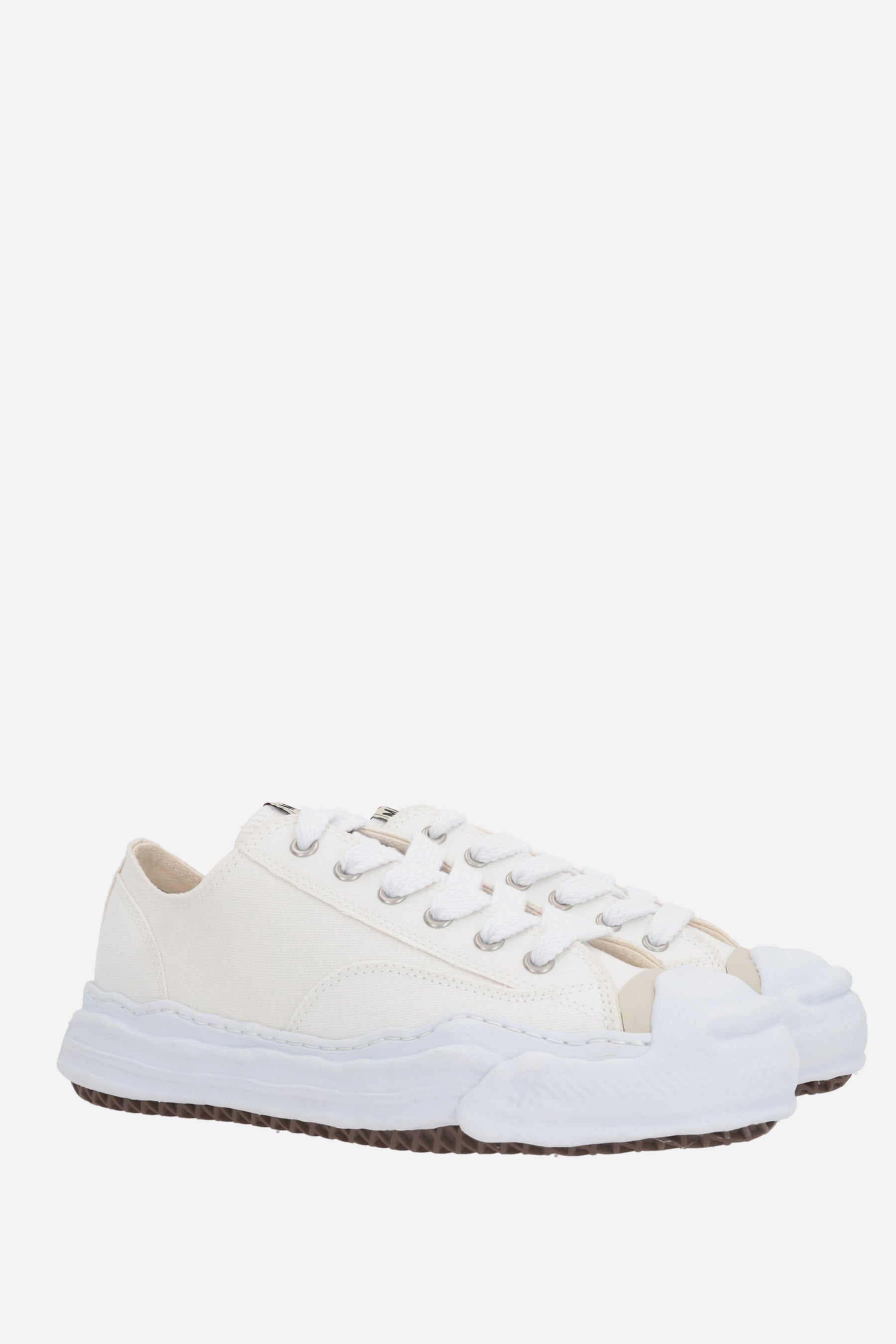 Maison Mihara Yasuhiro low-top sneakers crafted in white canvas with contrasting rubber toe cap. Featuring lace-up closure, a round-toe silhouette, fabric lining and irregular rubber sole. The design is completed by the iconic MMY label on tongue.