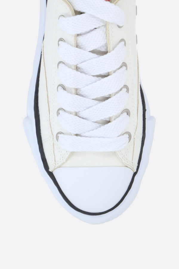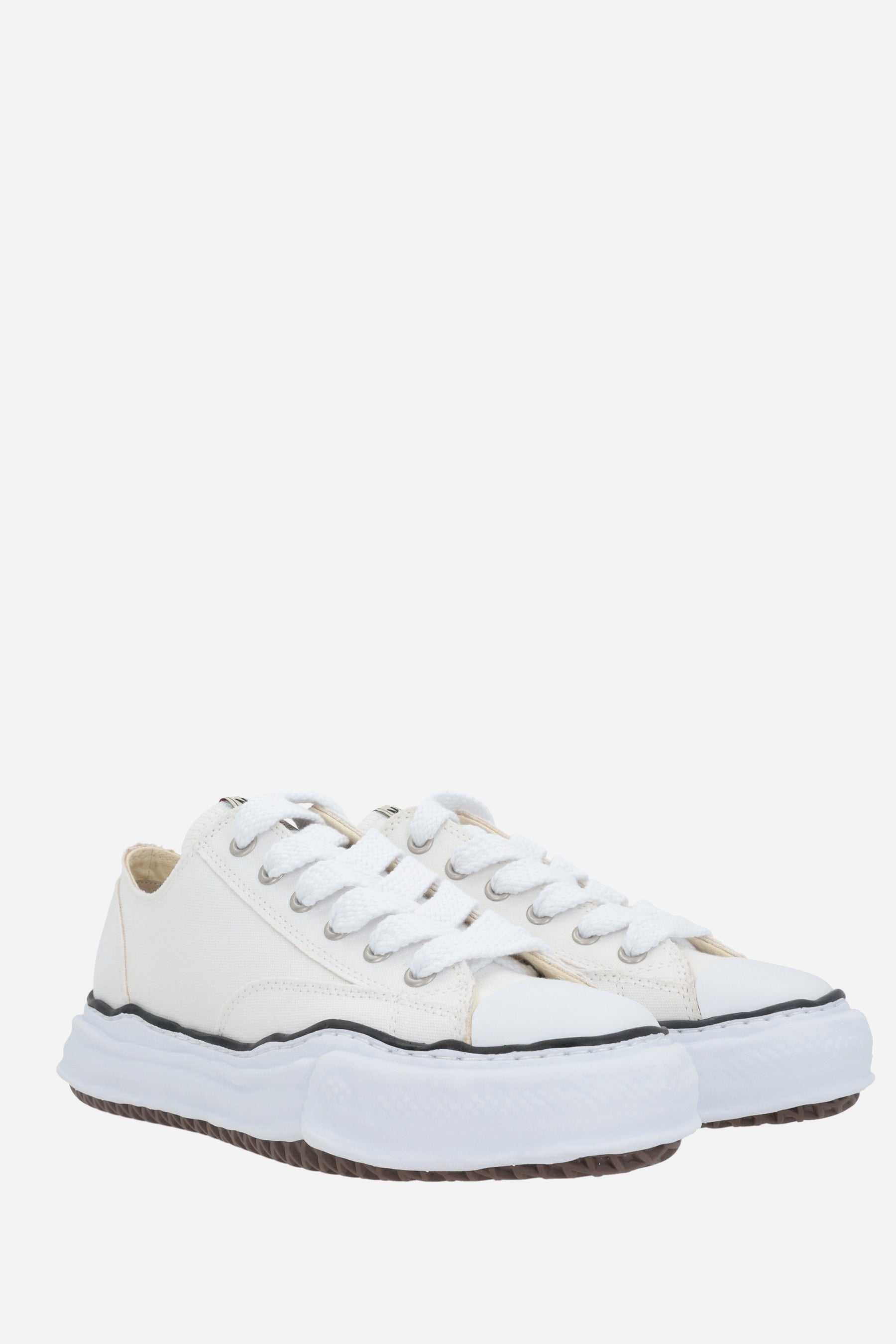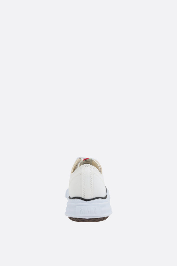 Maison Mihara Yasuhiro low-top sneakers crafted in white canvas with contrasting rubber toe cap and distressed-effect trims. Featuring lace-up closure, a round-toe silhouette, fabric lining and irregular rubber sole. The design is completed by the iconic MMY label on tongue.