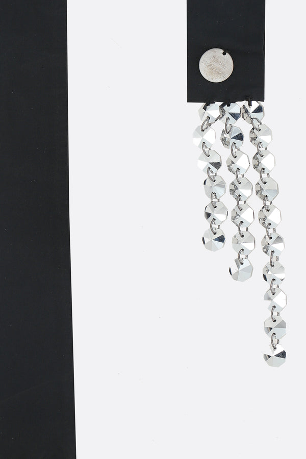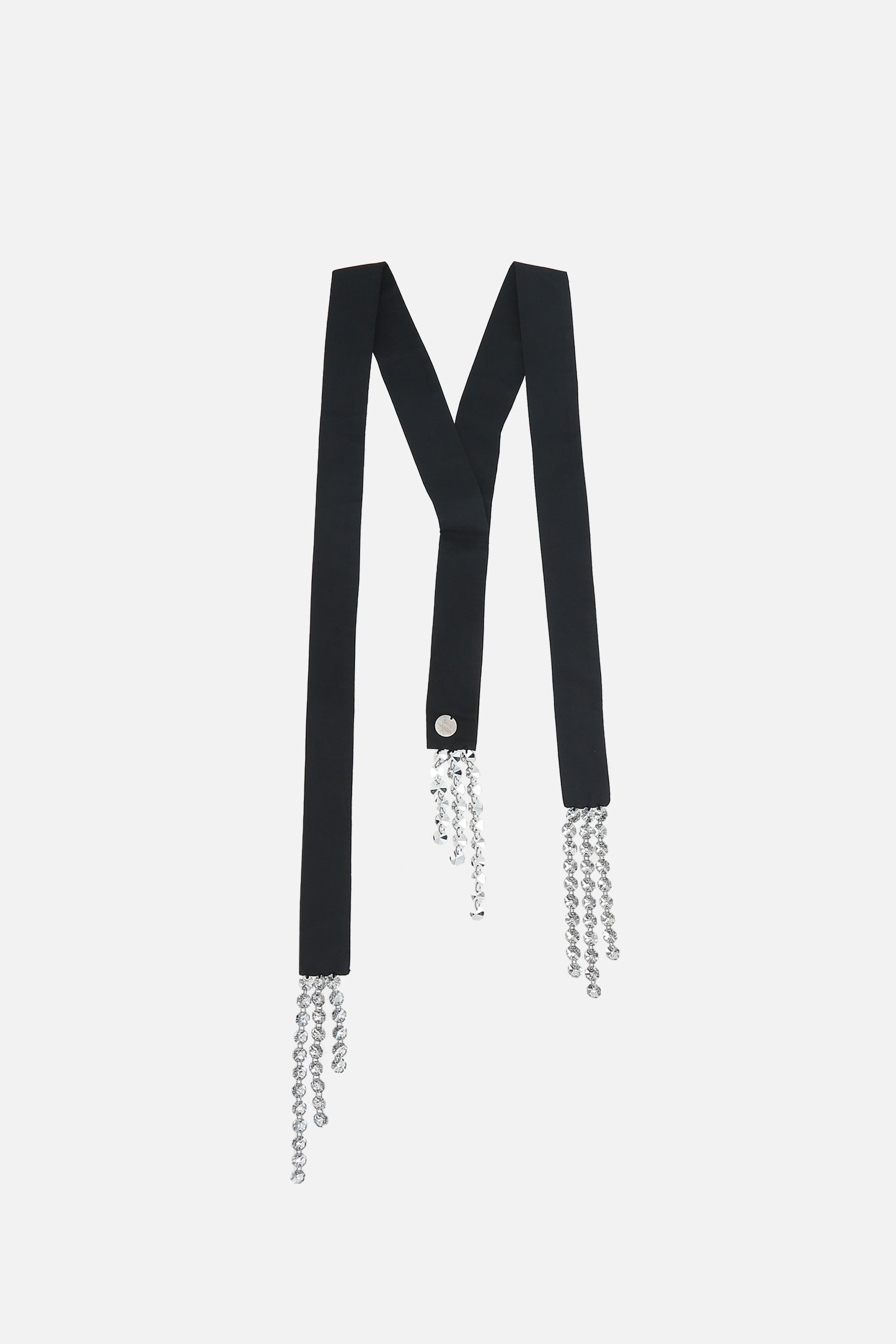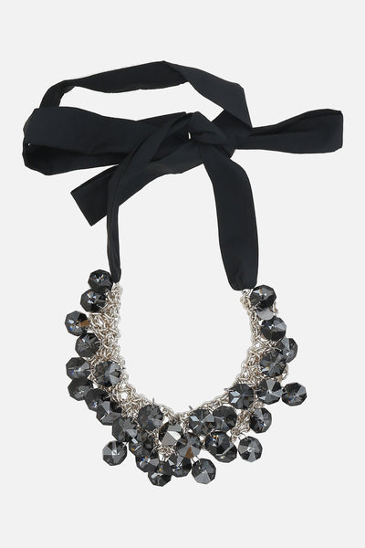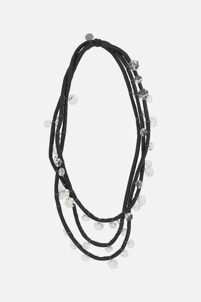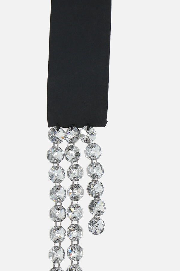 Maria Calderara necklace crafted from black taffeta, featuring asymmetric crystal fringes at the ends. Each piece is unique, and every imperfection is part of the beauty of the jewel.