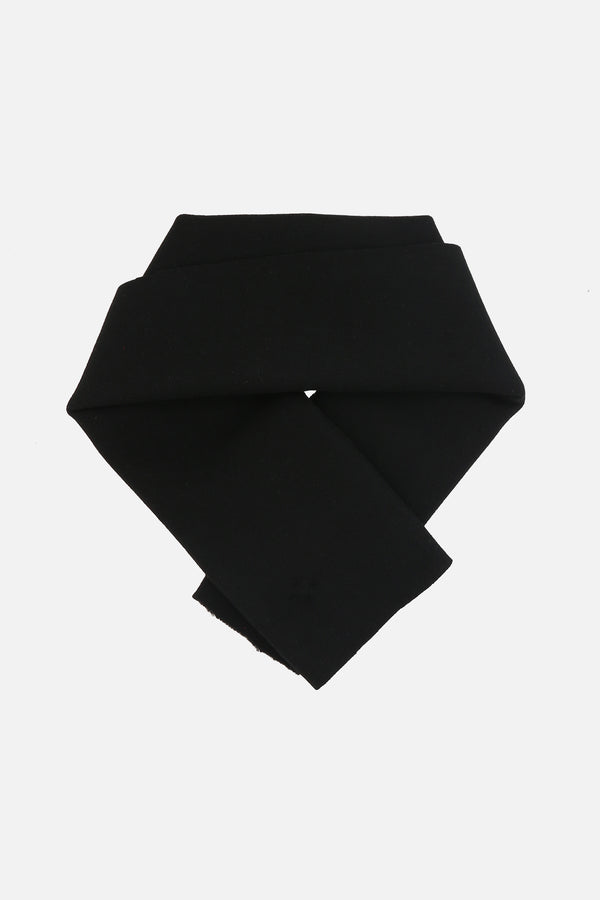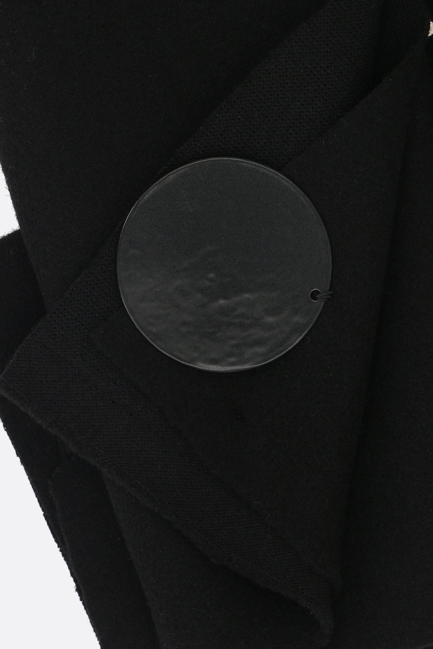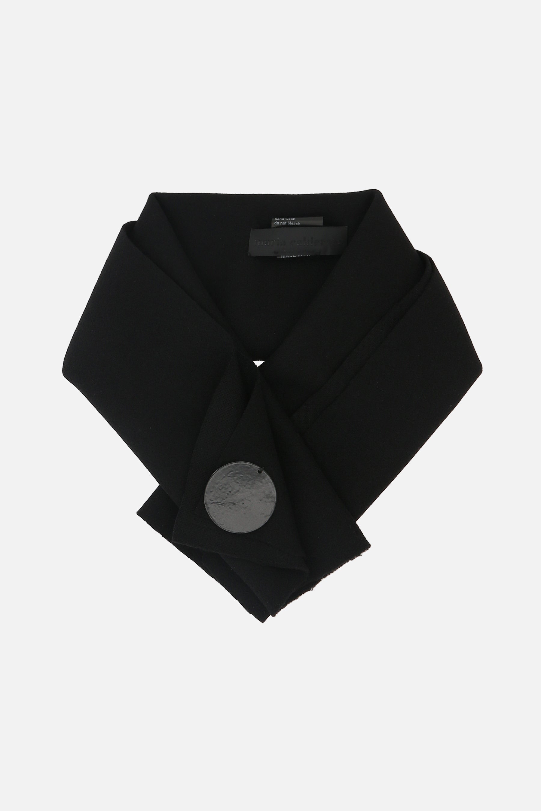 Maria Calderara collar crafted from felted fabric, featuring raw-cut edges, a front snap button closure, and a hand-painted hammered brass medallion.