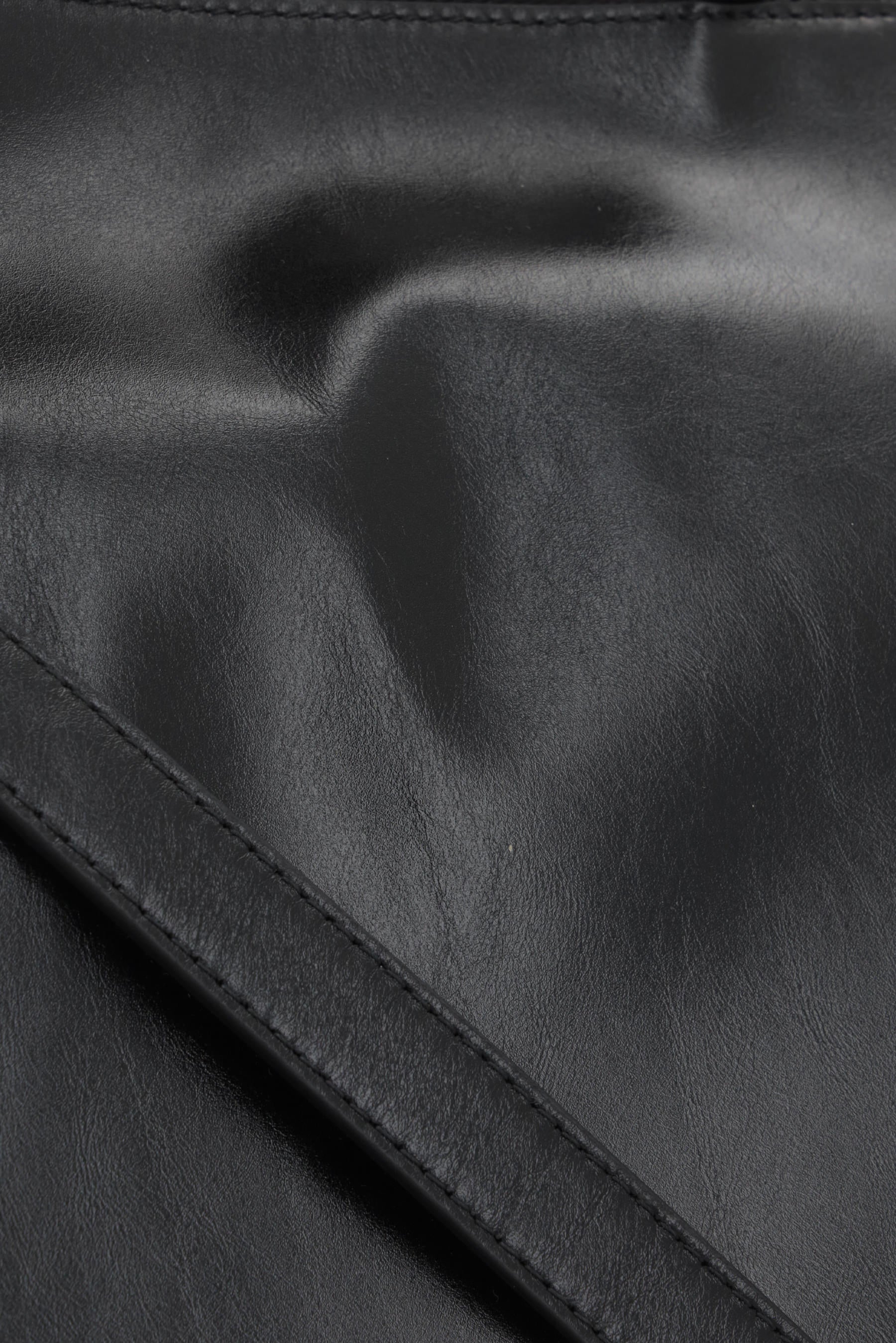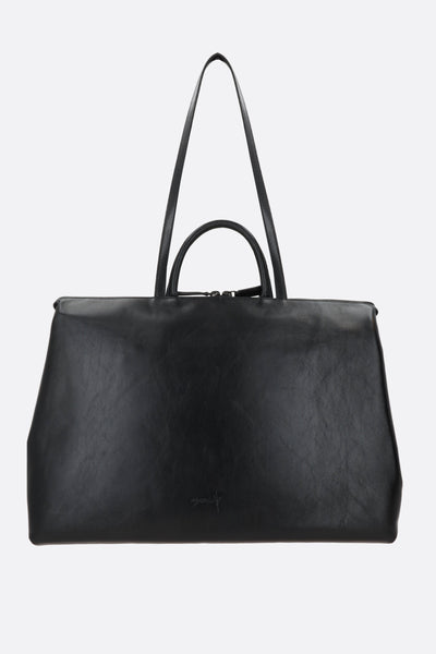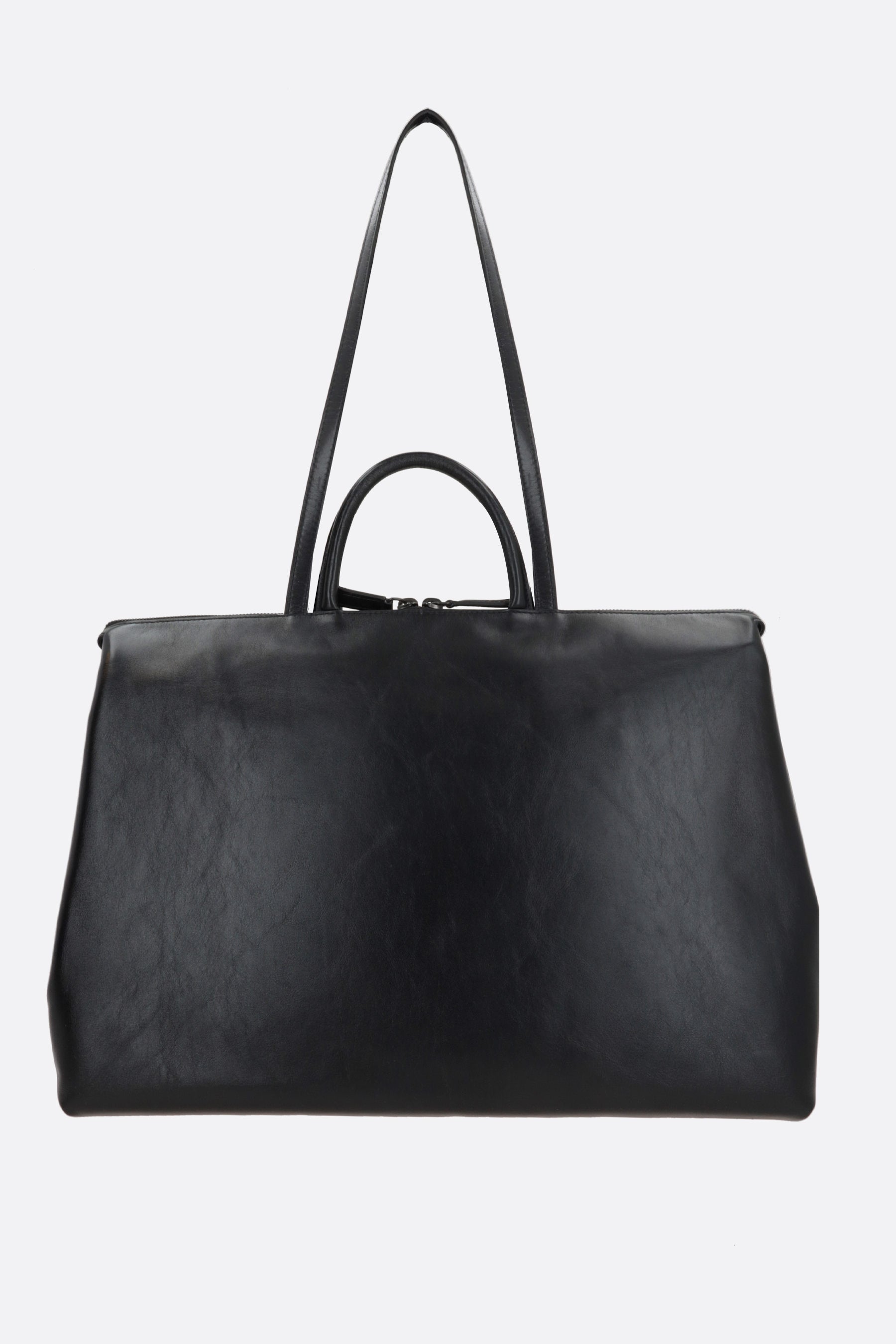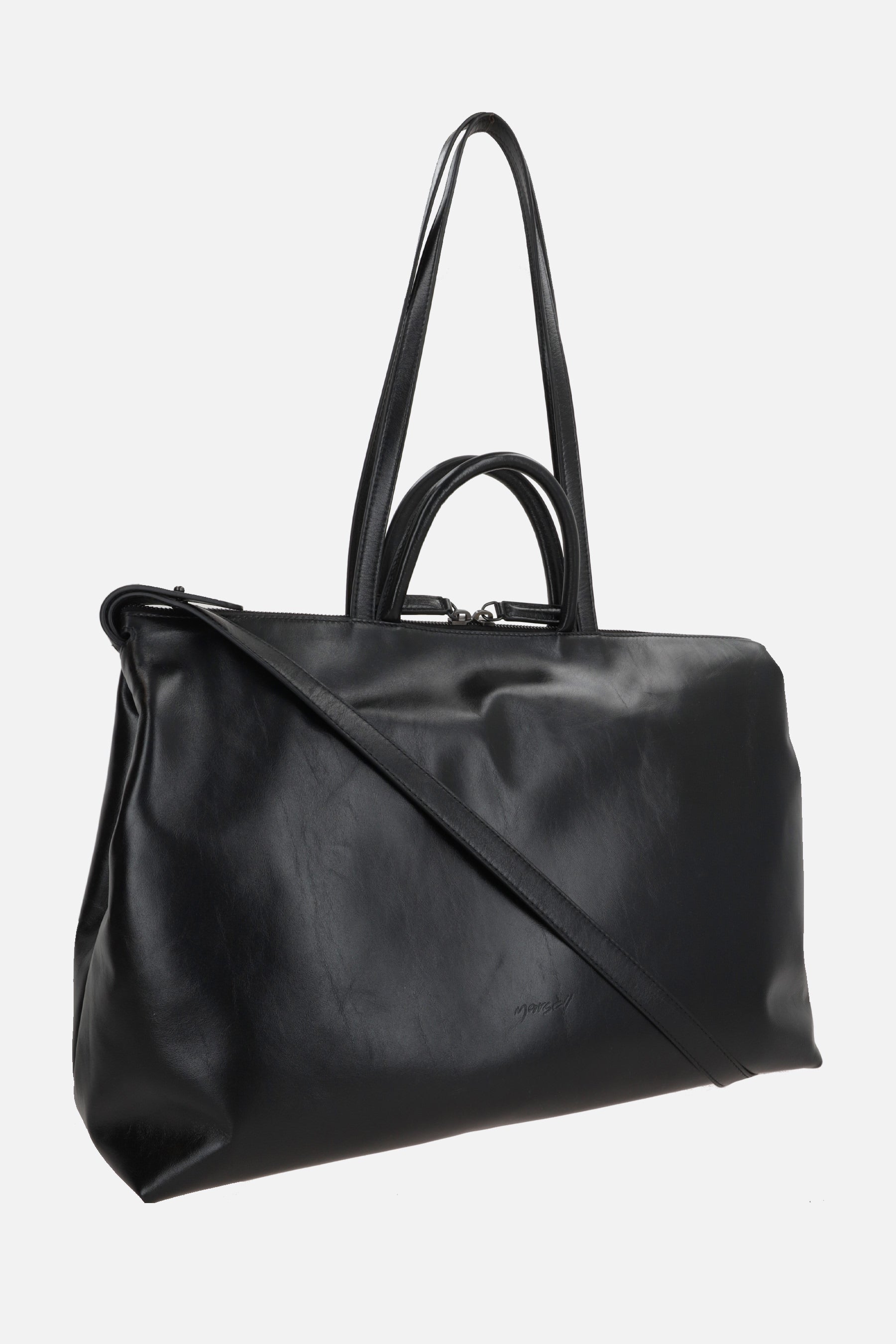 Marsèll tote bag crafted from black shiny leather. Featuring ruthenium-tone hardware, double-slider zip closure, short handles, long handles, and an adjustable/removable shoulder strap. The black leather-lined interior is fitted with a flat pocket and a zip pocket. The design is completed with the signature embossed front logo.