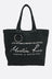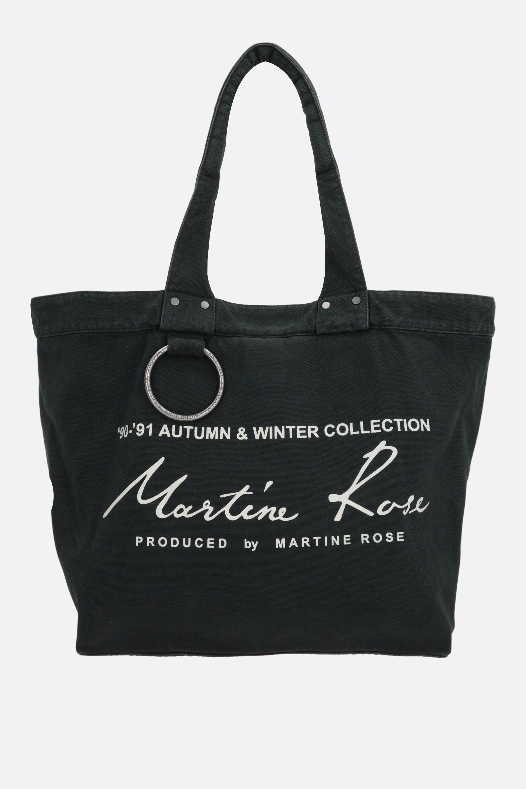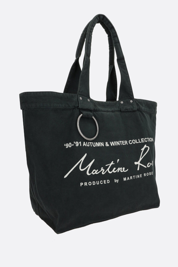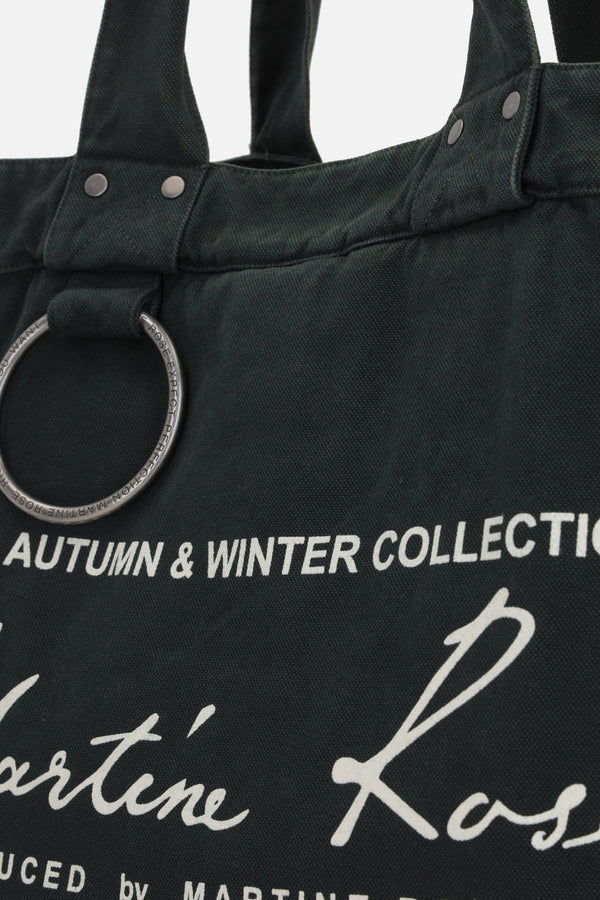 Martine Rose tote bag made of dark green cotton canvas with front logo print. Featuring antiqued silver-tone hardware, internal clasp closure, double handles, and an unlined interior with a zip pocket. The design is completed by an oversized metal ring detail on the front.