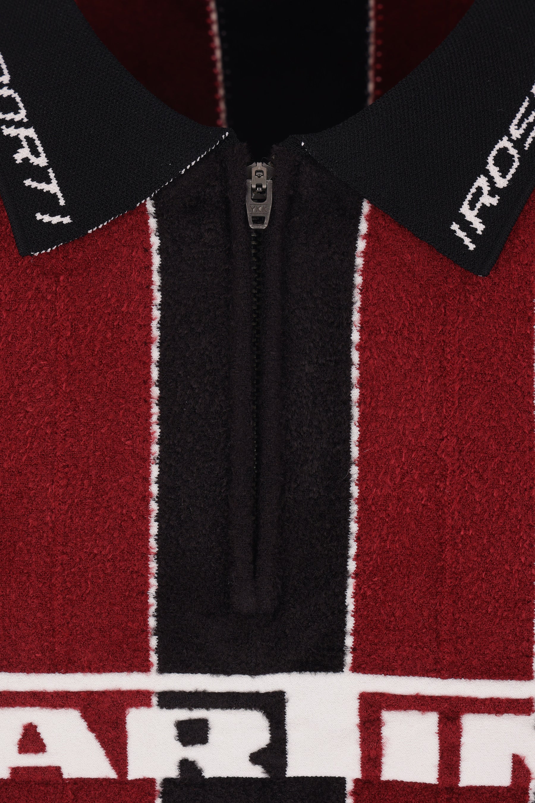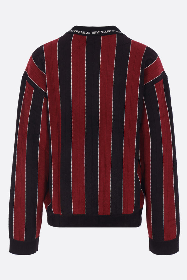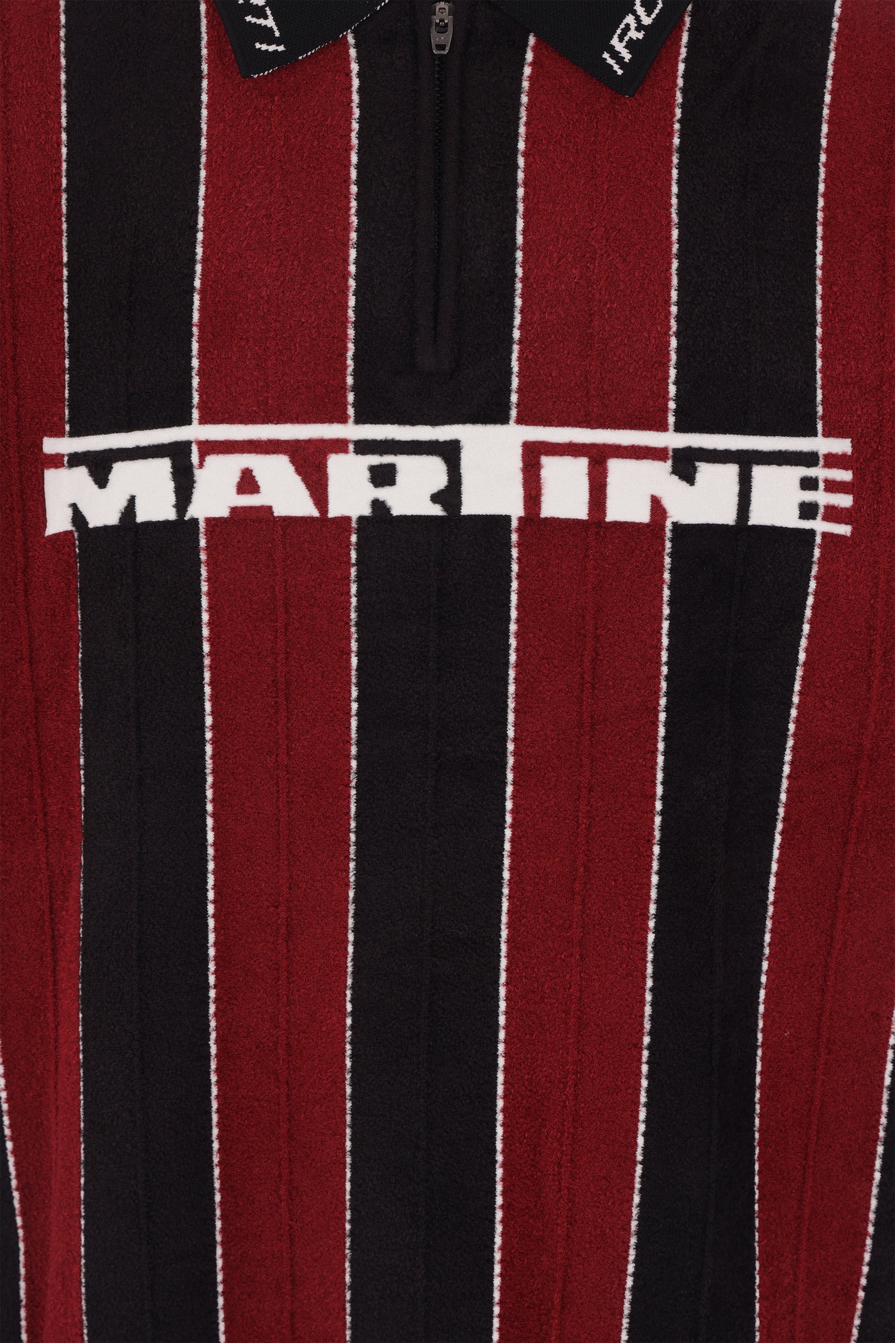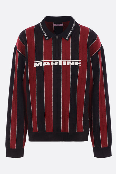 Martine Rose polo made of striped knit with front Sporty Logo. Features a half-zip closure, long sleeves, ribbed trims, and a straight hem.