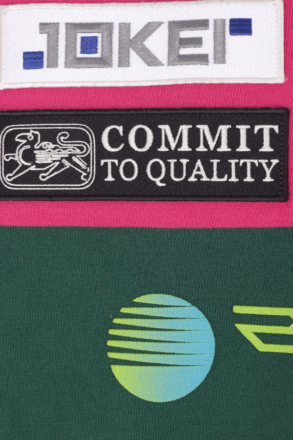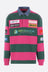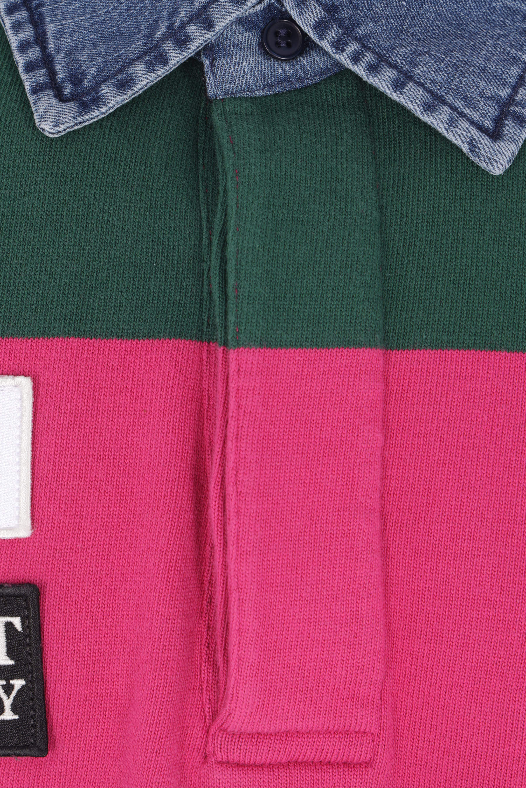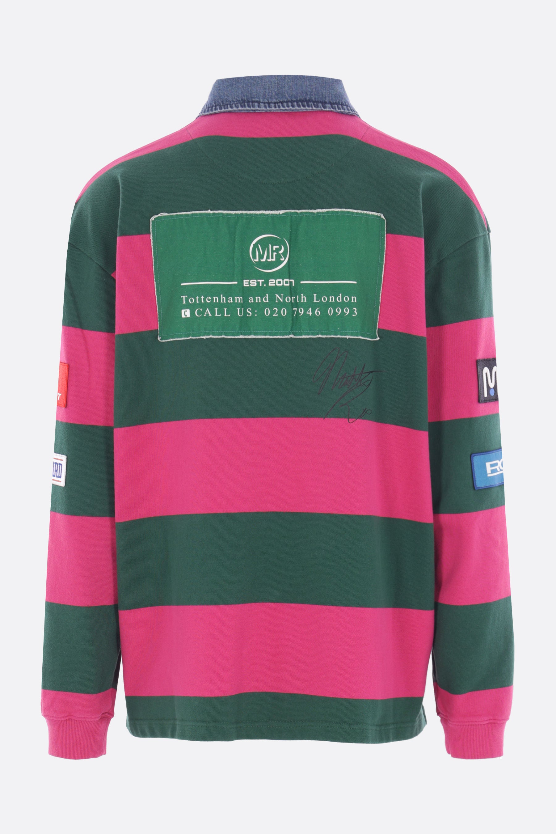 Martine Rose oversized polo shirt made of striped jersey in dark green and fuchsia with patches on both sides. Featuring a denim polo collar, front three-button closure, long sleeves with ribbed cuffs, and a straight hem with small side slits.