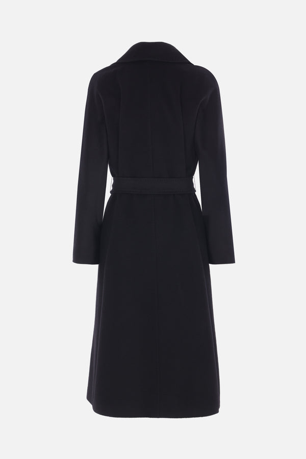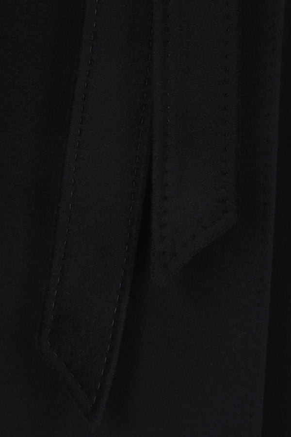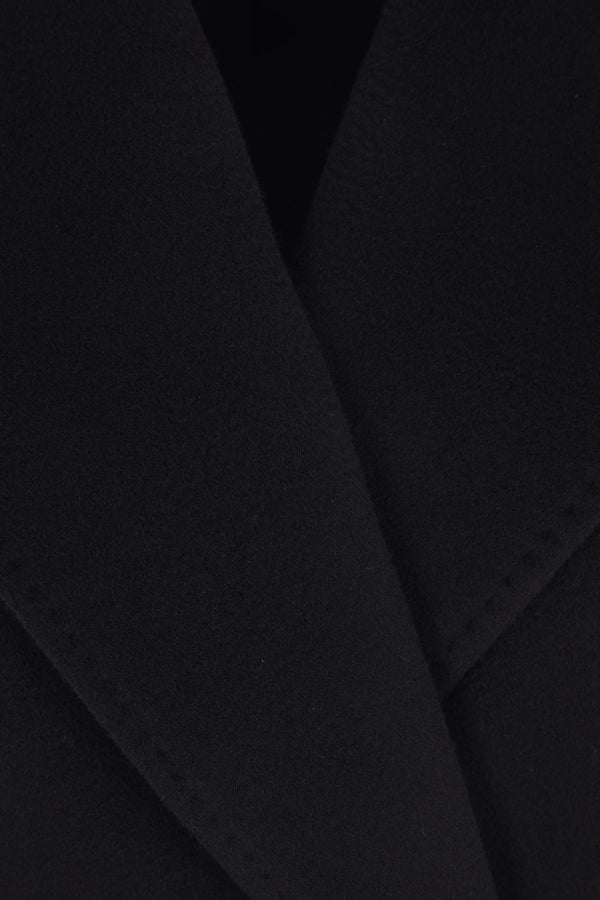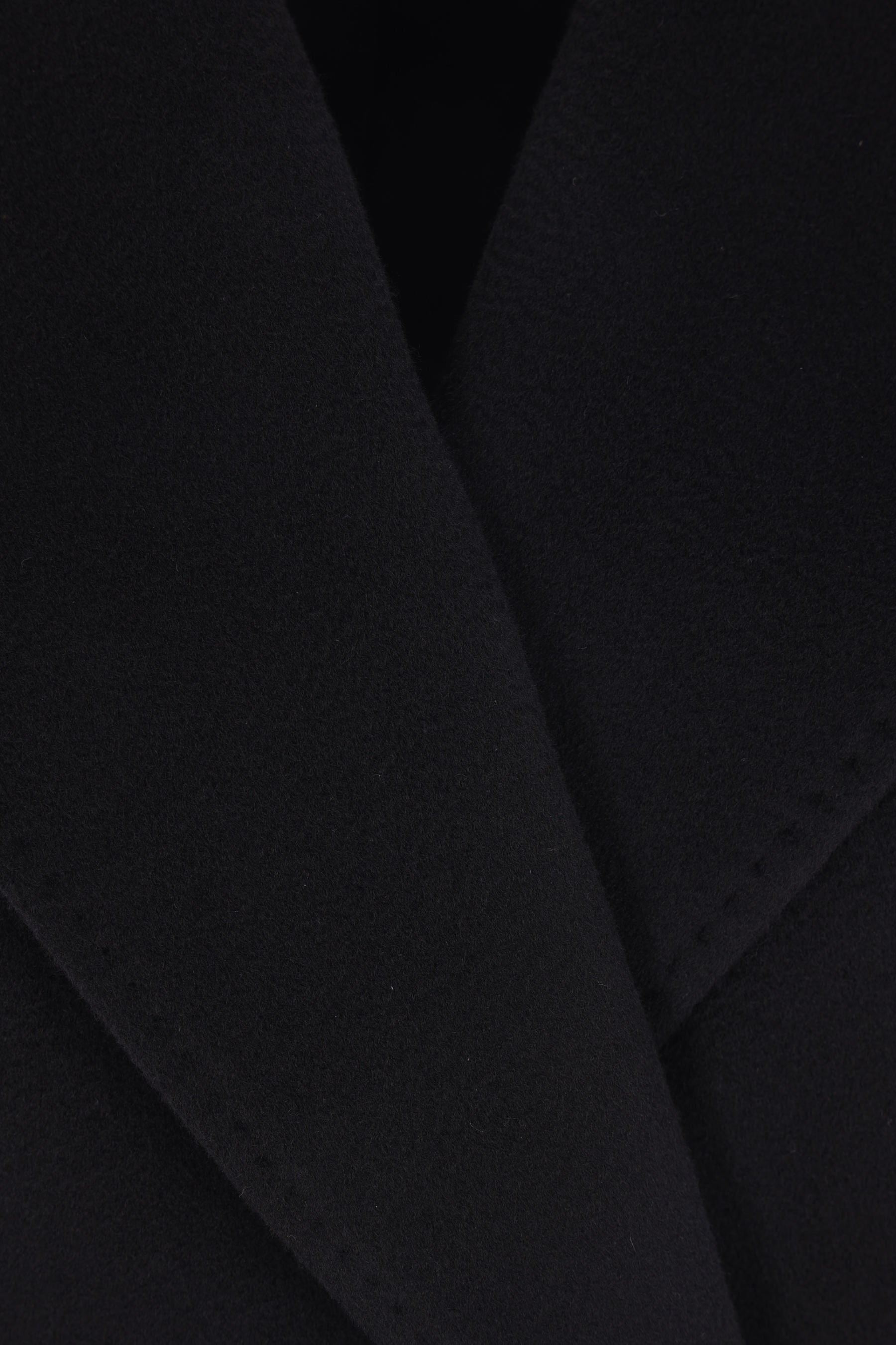 Max Mara Studio wrap coat made of black pure cashmere broadcloth. Featuring wide lapels, a matching belt, welt pockets, long sleeves, and a straight hem. Fully lined interior.